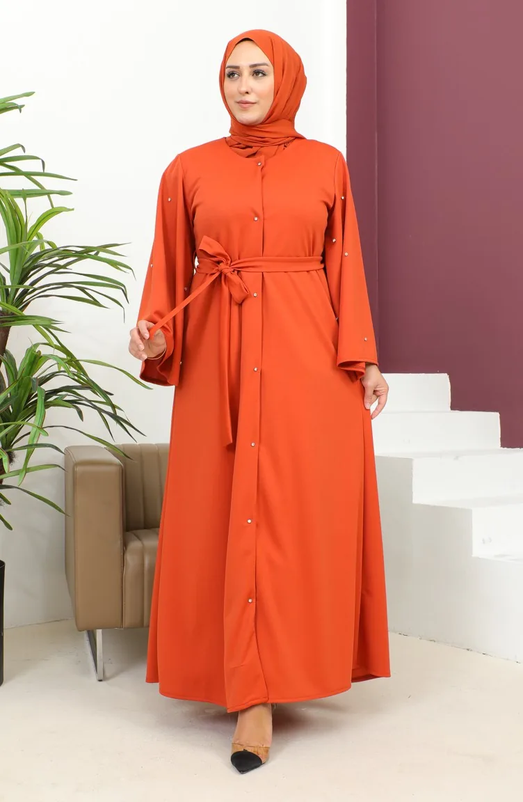 Büyük Beden Taşlı Düğmeli Abaya 8028-05 Kiremit