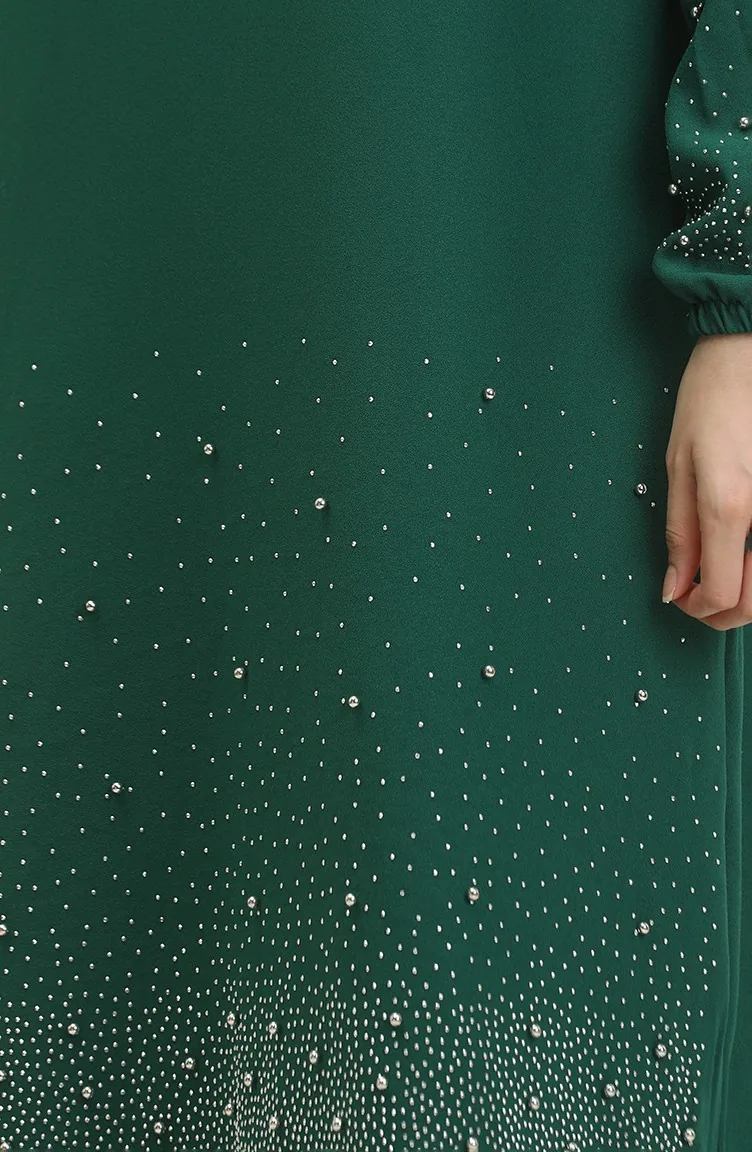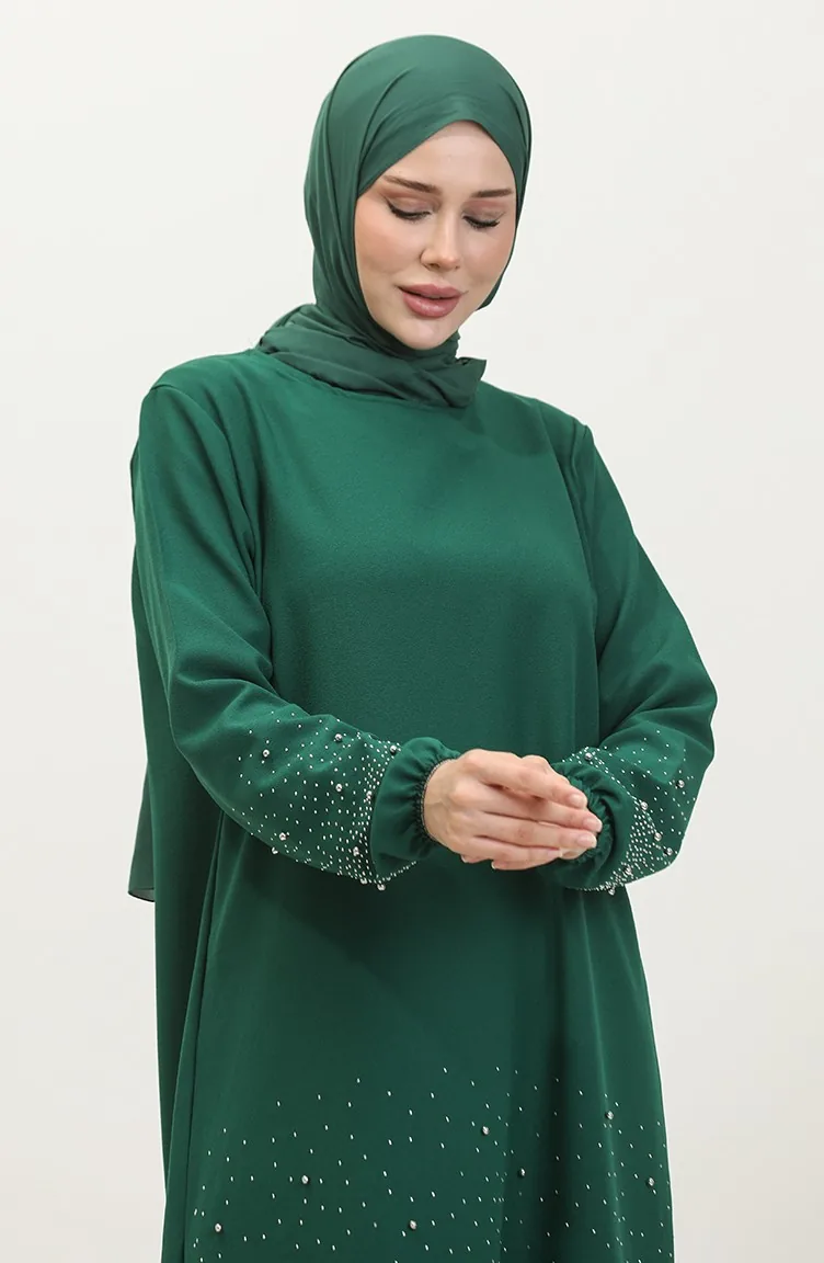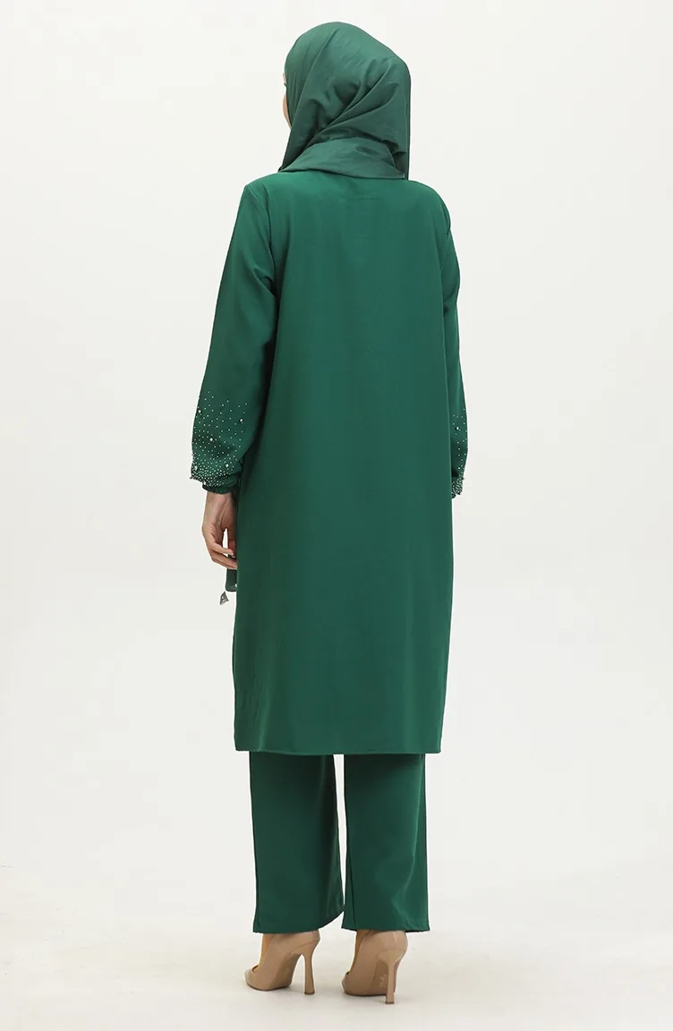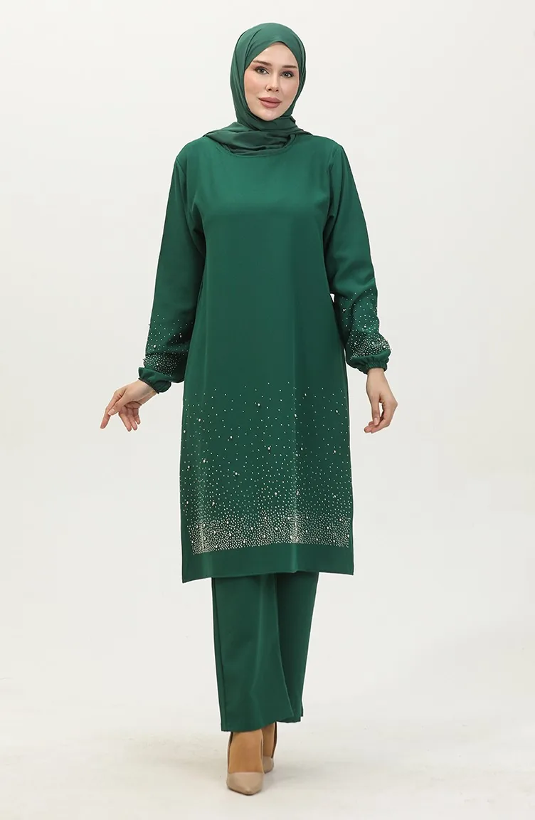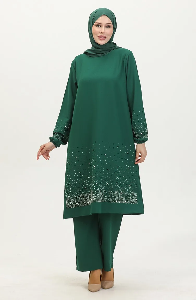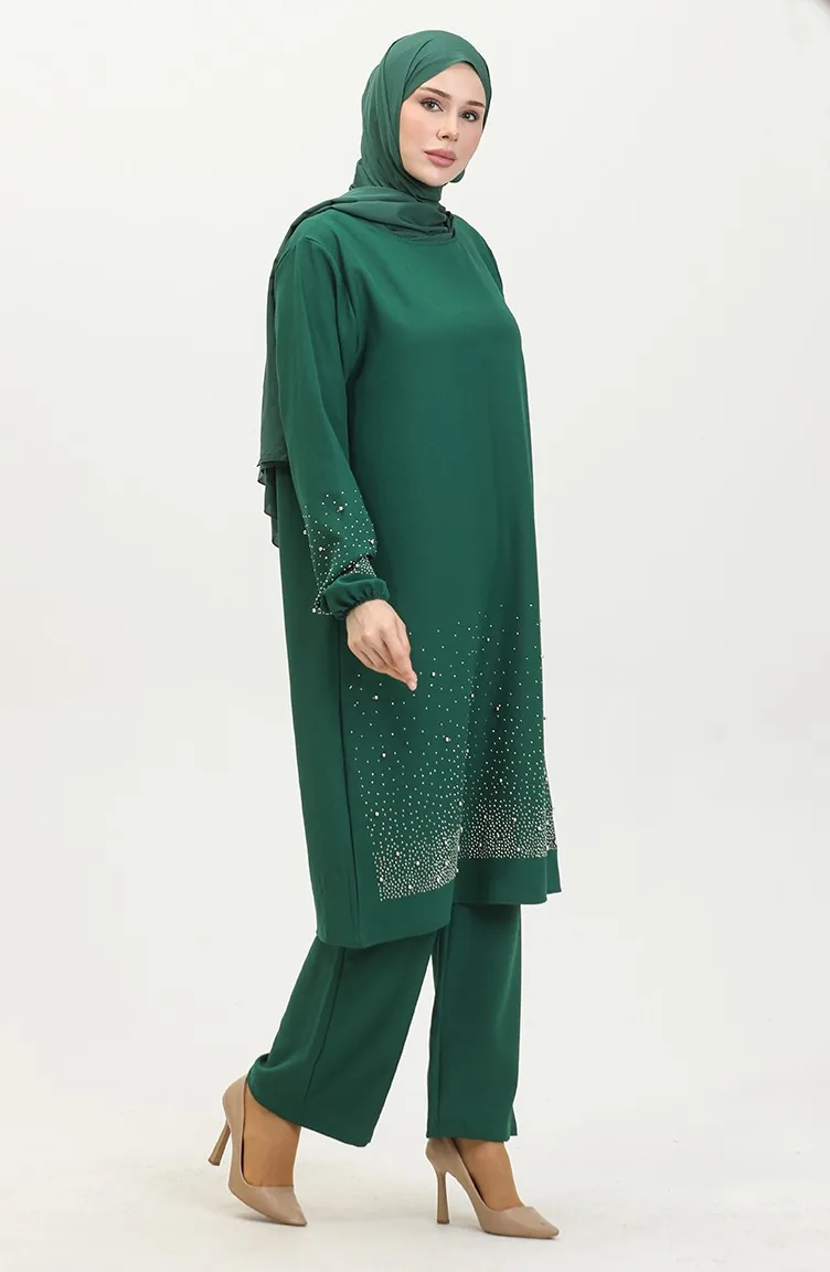 Taş Baskılı Araboy Abiye Tunik Pantolon İkili Takım 0409-01 Zümrüt Yeşili