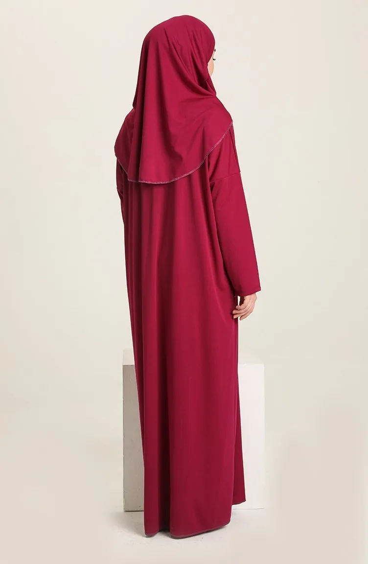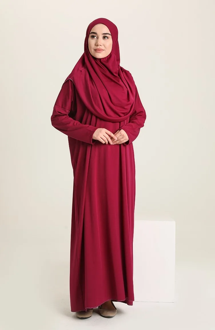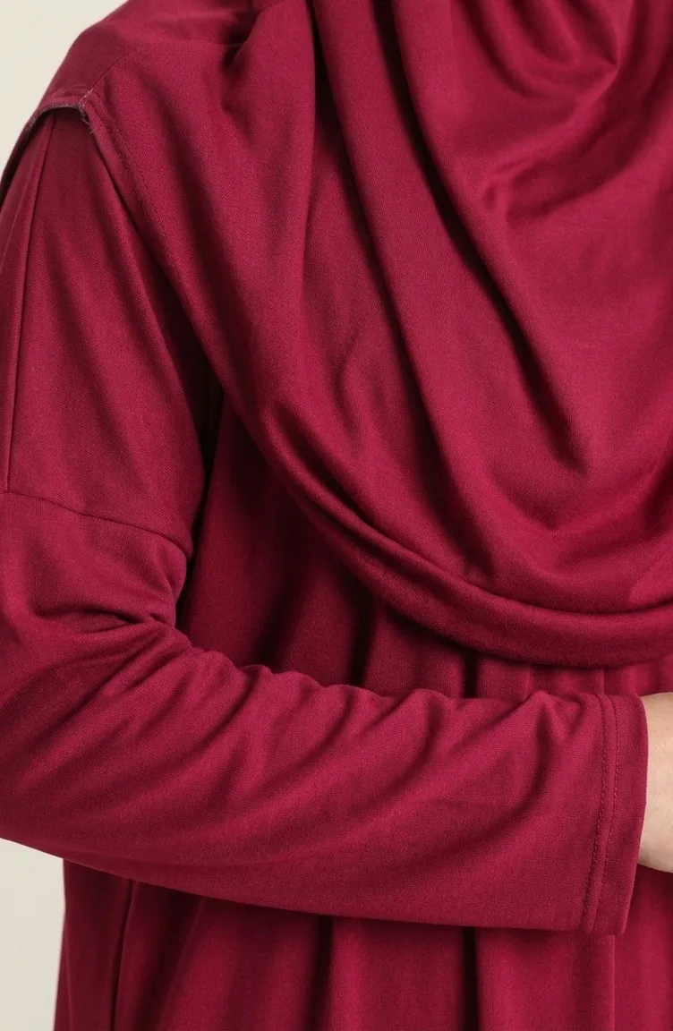 استخدم فيه اللون الارجواني الداكن. وقد استخدم جيرسي النسيج. ذو مظهر سادة. لديها كم شبيه بجناح الخفاش. من الممكن استعمال المنتج بدون ياقة مع كل ملابس. مناسب لجميع المواسم. نساء. هناك مقاسات كبيرة.