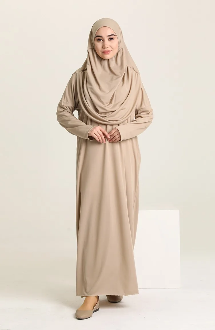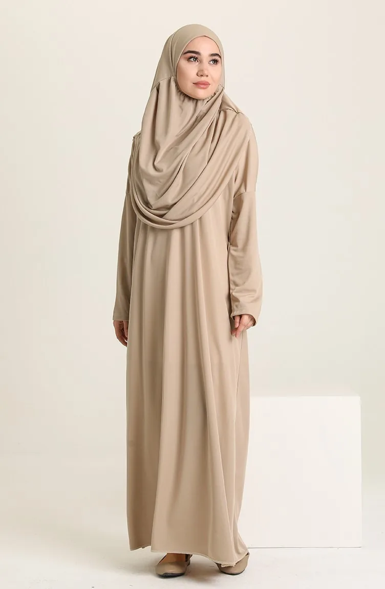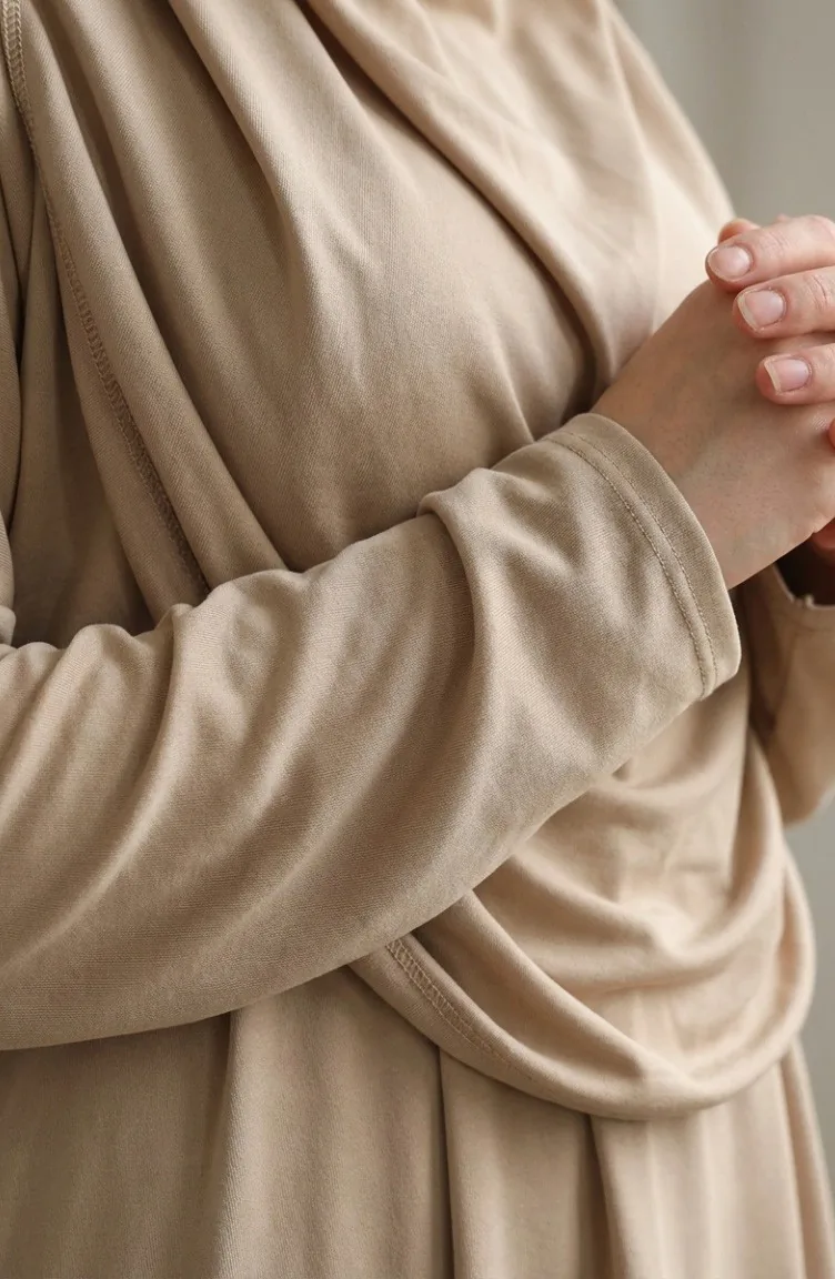 استعمل اللون البيج الغامق. وقد استخدم جيرسي النسيج. ذو مظهر سادة. لديها كم شبيه بجناح الخفاش. من الممكن استعمال المنتج بدون ياقة مع كل ملابس. مناسب لجميع المواسم. هناك مقاسات كبيرة.