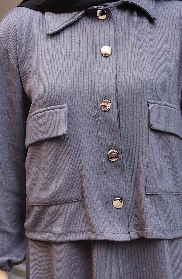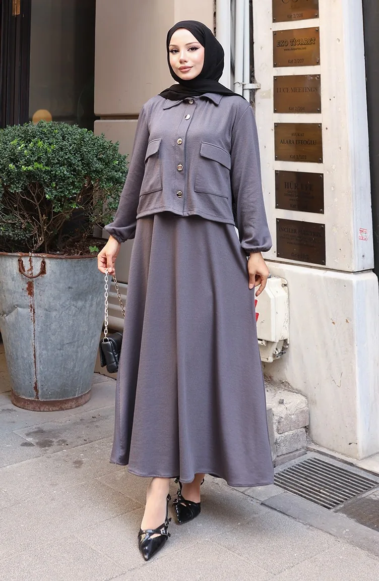 فستان جاكيت بأزرار من قماش مخملي مع بدلة حجاب 0219-06 أنثراسيت 0219-06