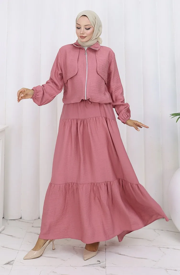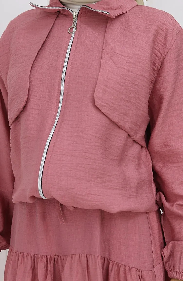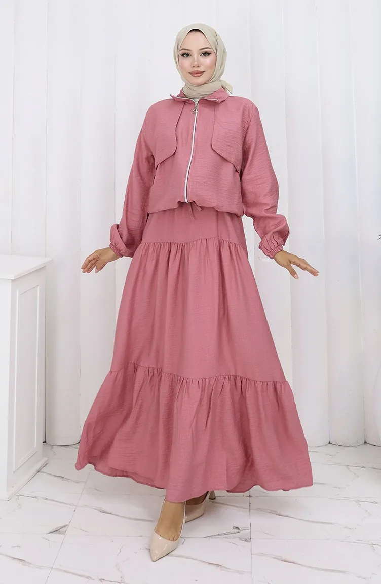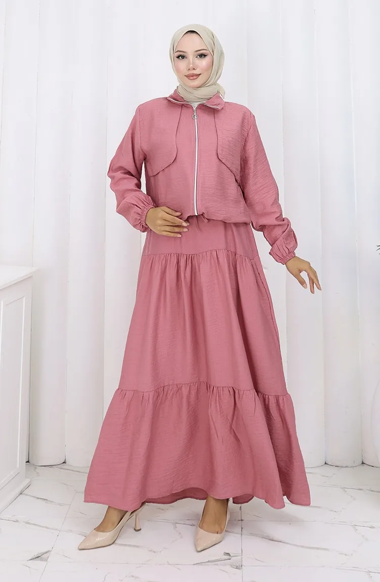 بدلة من قطعتين بأكمام مرنة وسحاب 0129-23 وردي غامق مغبر 0129-23