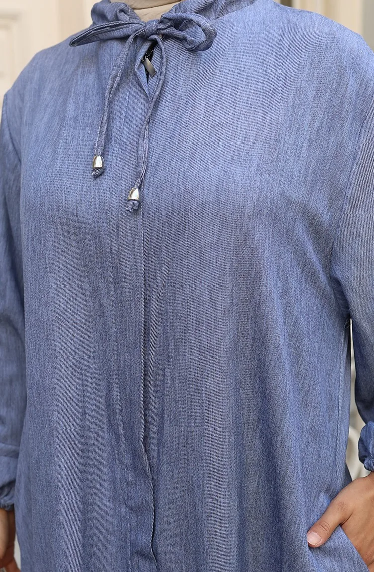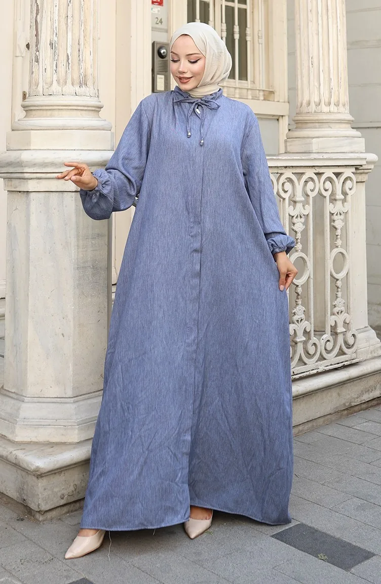 عباية جينز بأكمام مرنة وسحاب 0141A-02 أزرق داكن 0141A-02