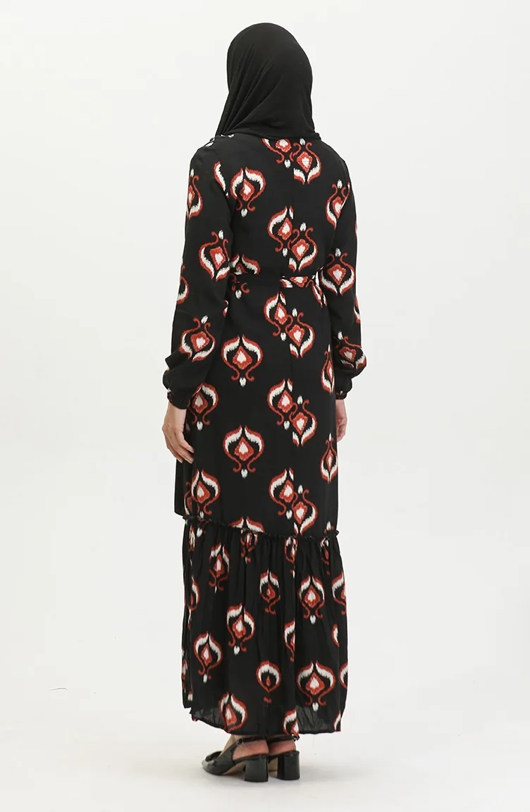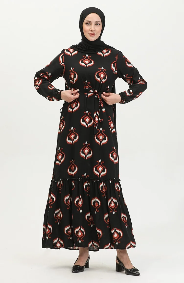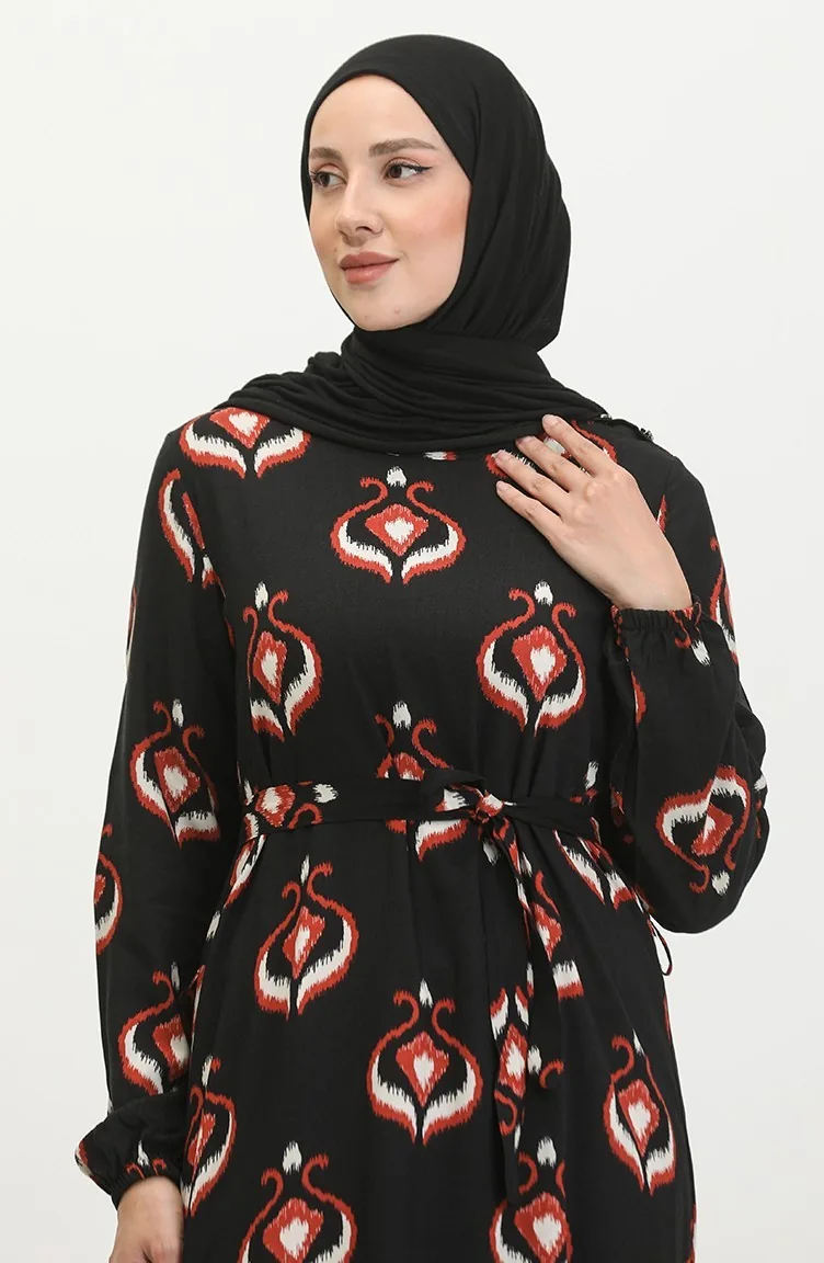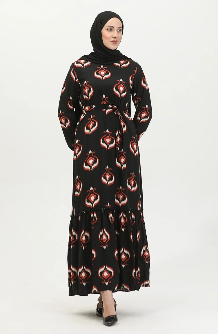 فستان أليسا من الفيسكوز بحزام 4599A-03 أسود قرميدي 4599A-03