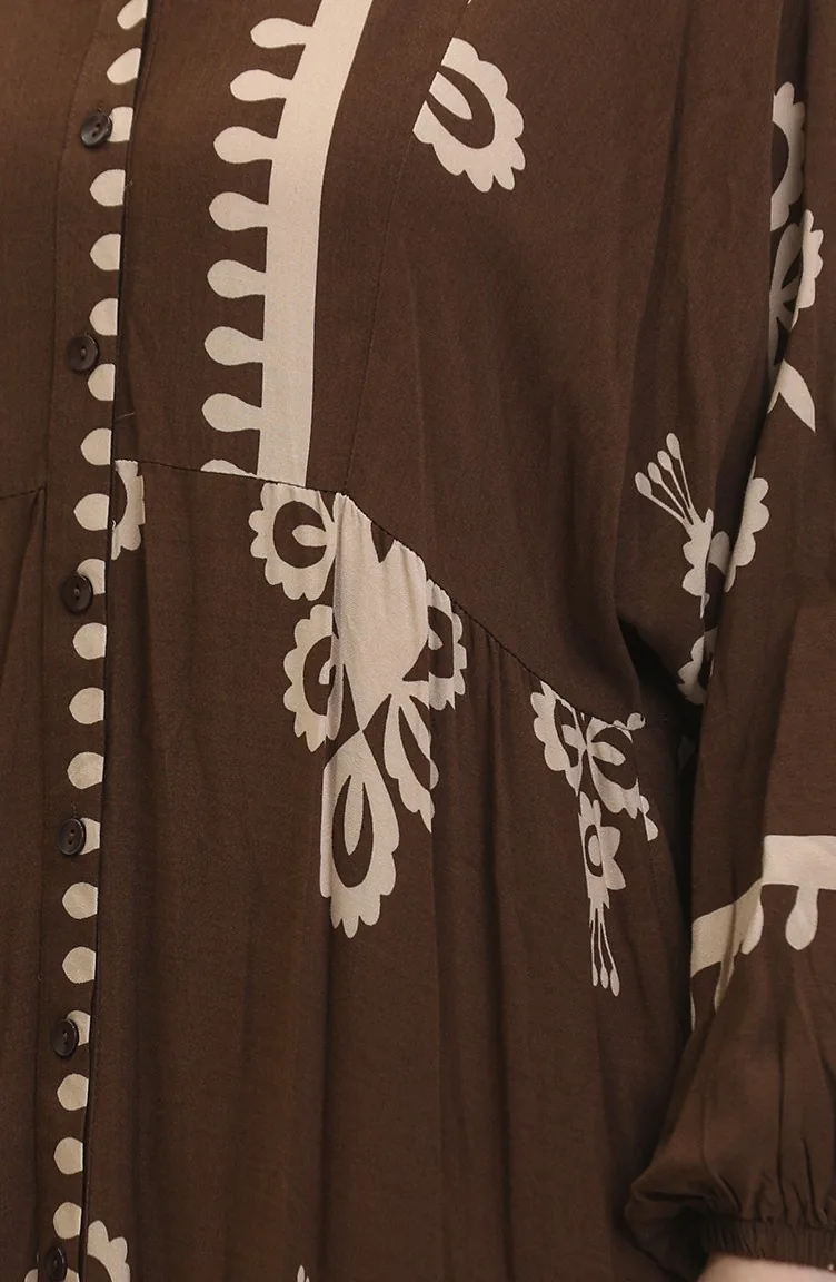 استعمل لون البني. فسكوزي نوع من النسيج الصناعي ومريحة للاستخدام. صمم مع القماش المزخرف. المنتج ذو الاستخدام بدون تبطين. Balon Kol. استعمل فيها الياقة الدائرية. مناسب لجميع المواسم. القياس التي في الصورة هي قياس العارضة.