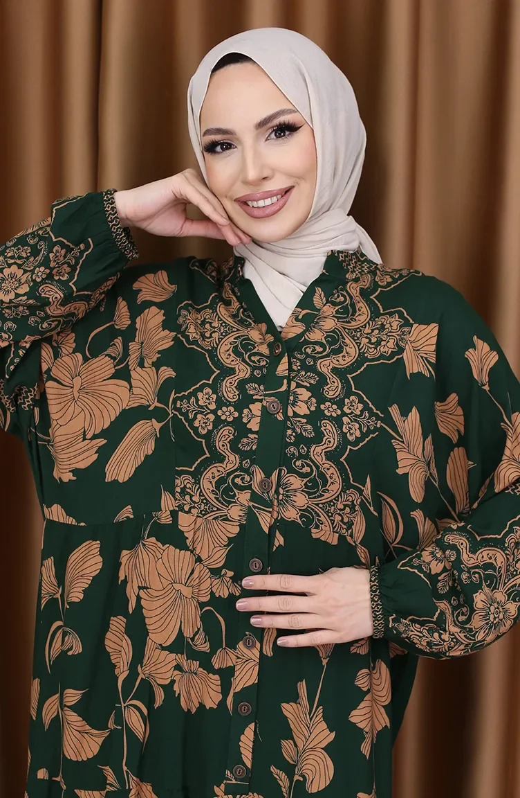 فستان بأكمام منفوخة ومنقوش بالزهور 5574-04 أخضر زمردي 5574-04