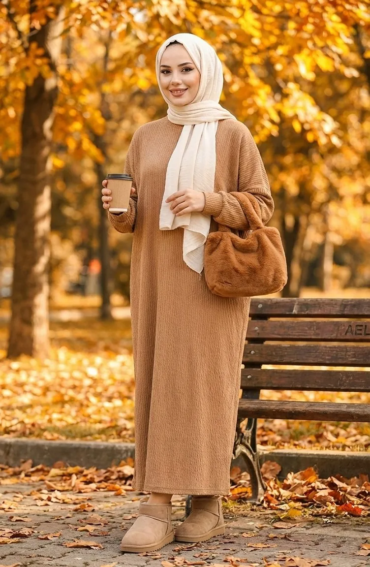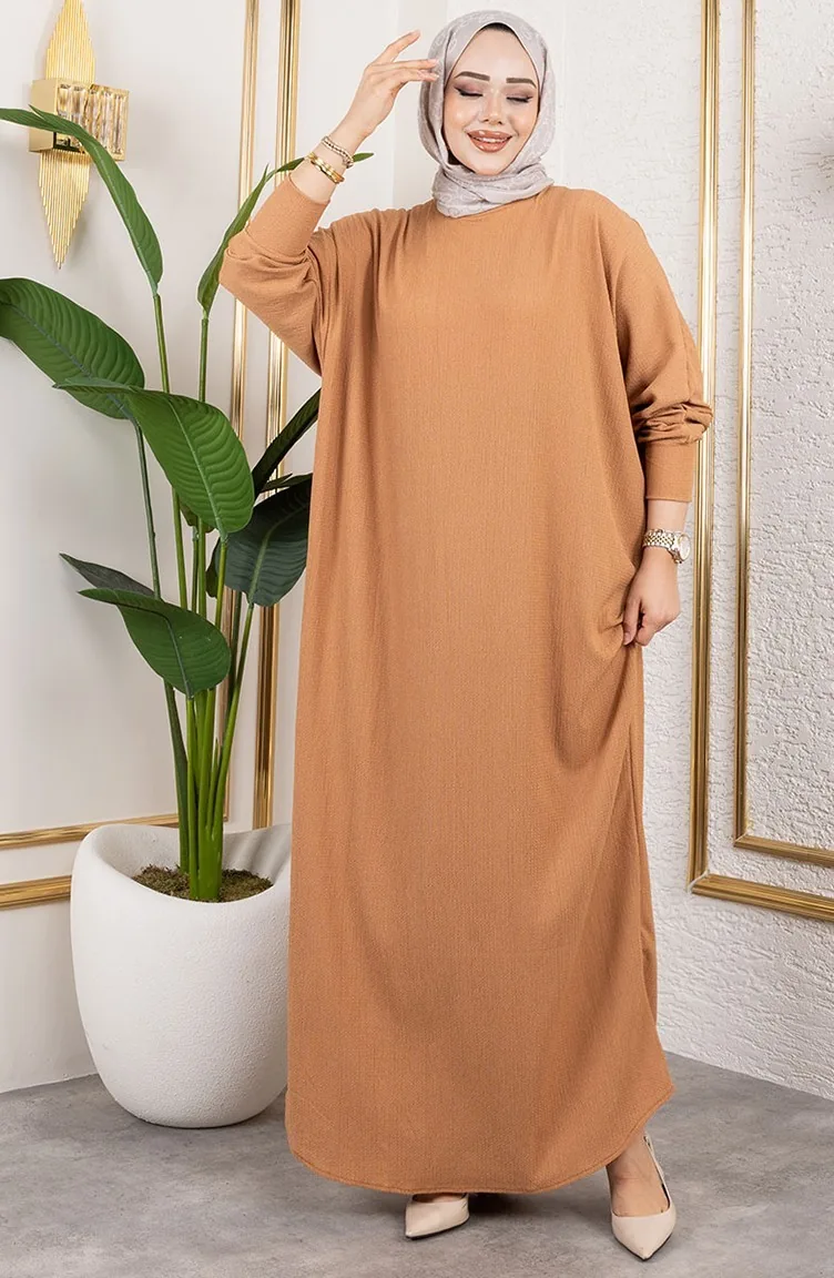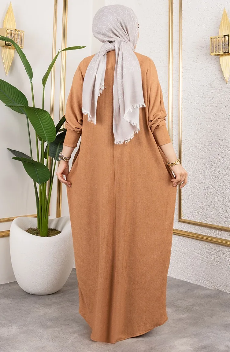 فستان كريب بأكمام خفاش 2000-05 بني فاتح 2000-05