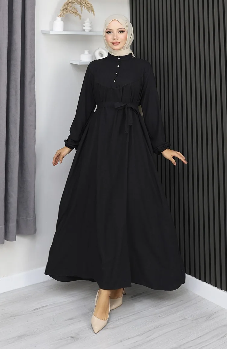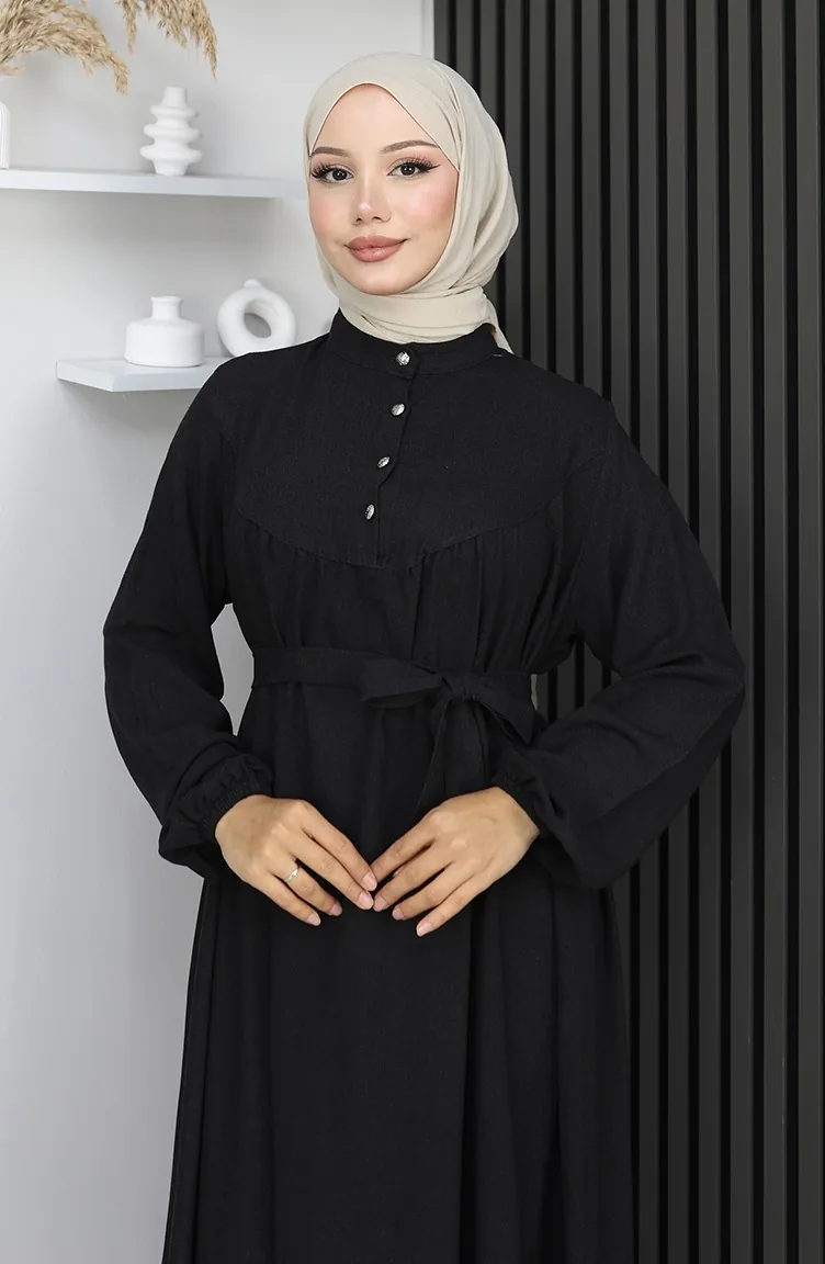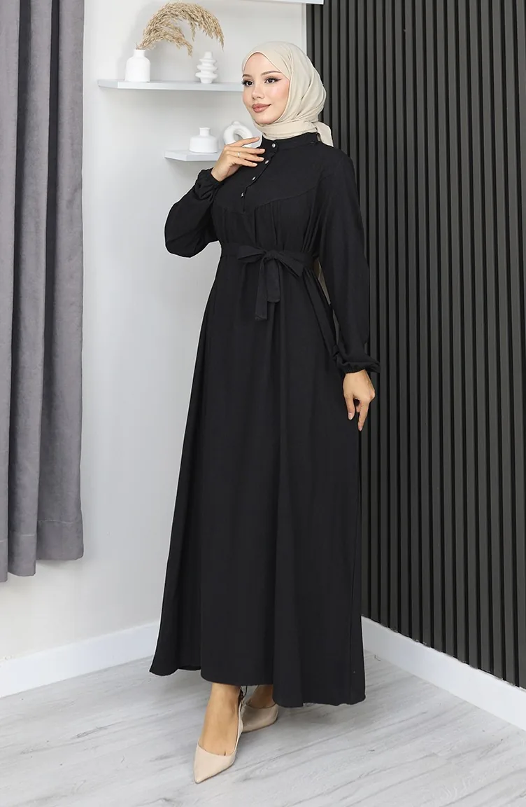 فستان بلماندو بحزام وأزرار نصفية 2166-02 أسود 2166-02
