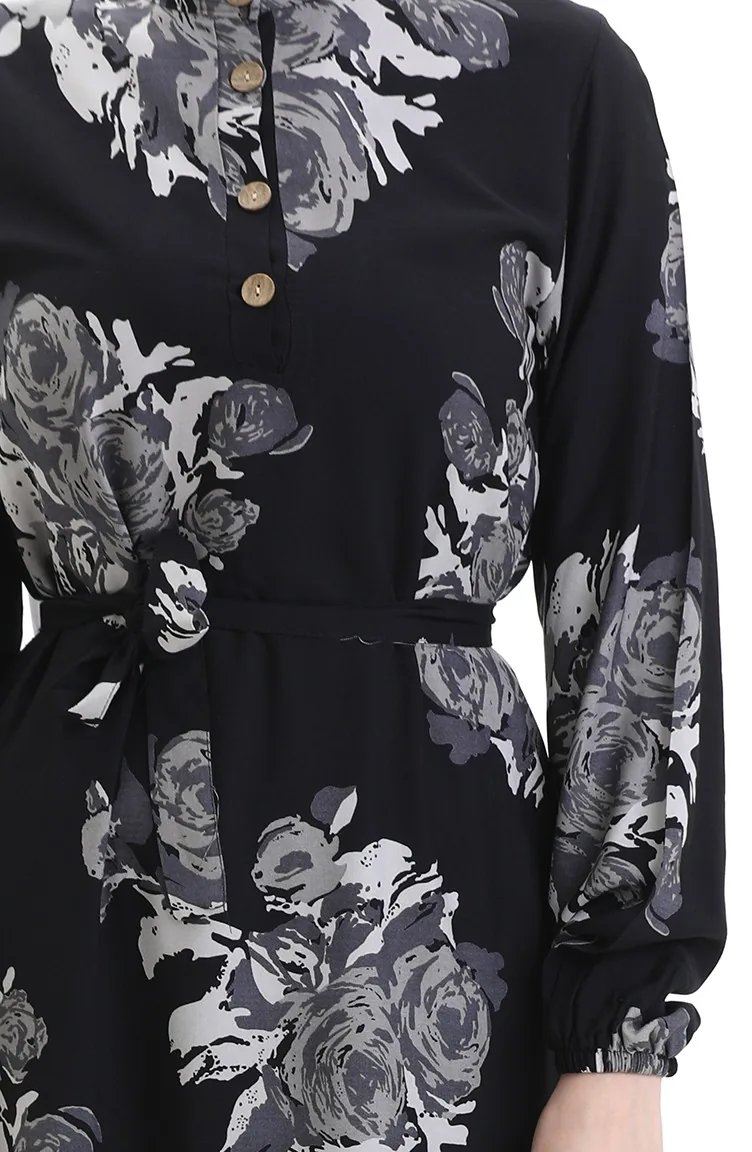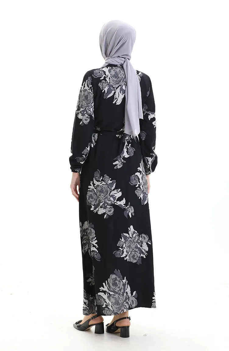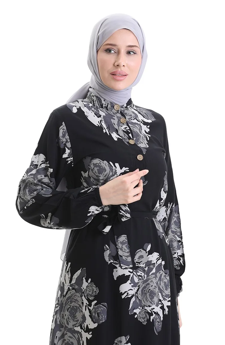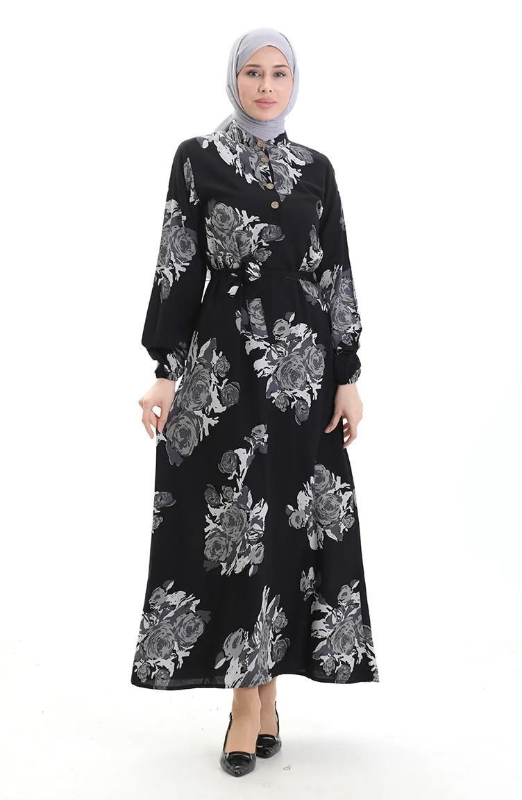 فستان منقوش بأزرار وحزام 2076-04 أسود رمادي 2076-04