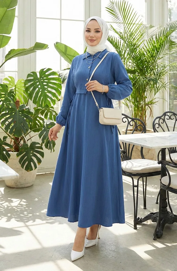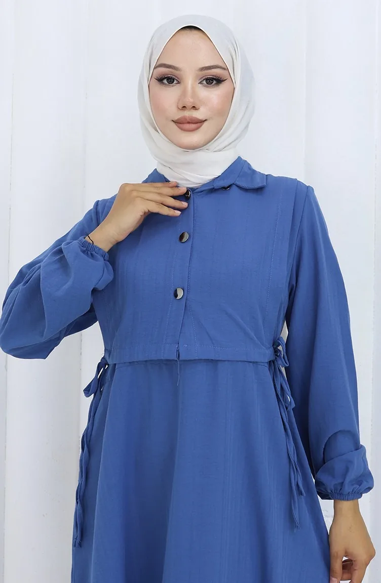 نيلي اللون استخدامها. نسيج القطن لديه نسيج ماص. ذو مظهر سادة. استعملت الأزرار ليجعل المنتج سهولة الارتداء. مناسب لجميع المواسم. هناك مقاسات كبيرة.