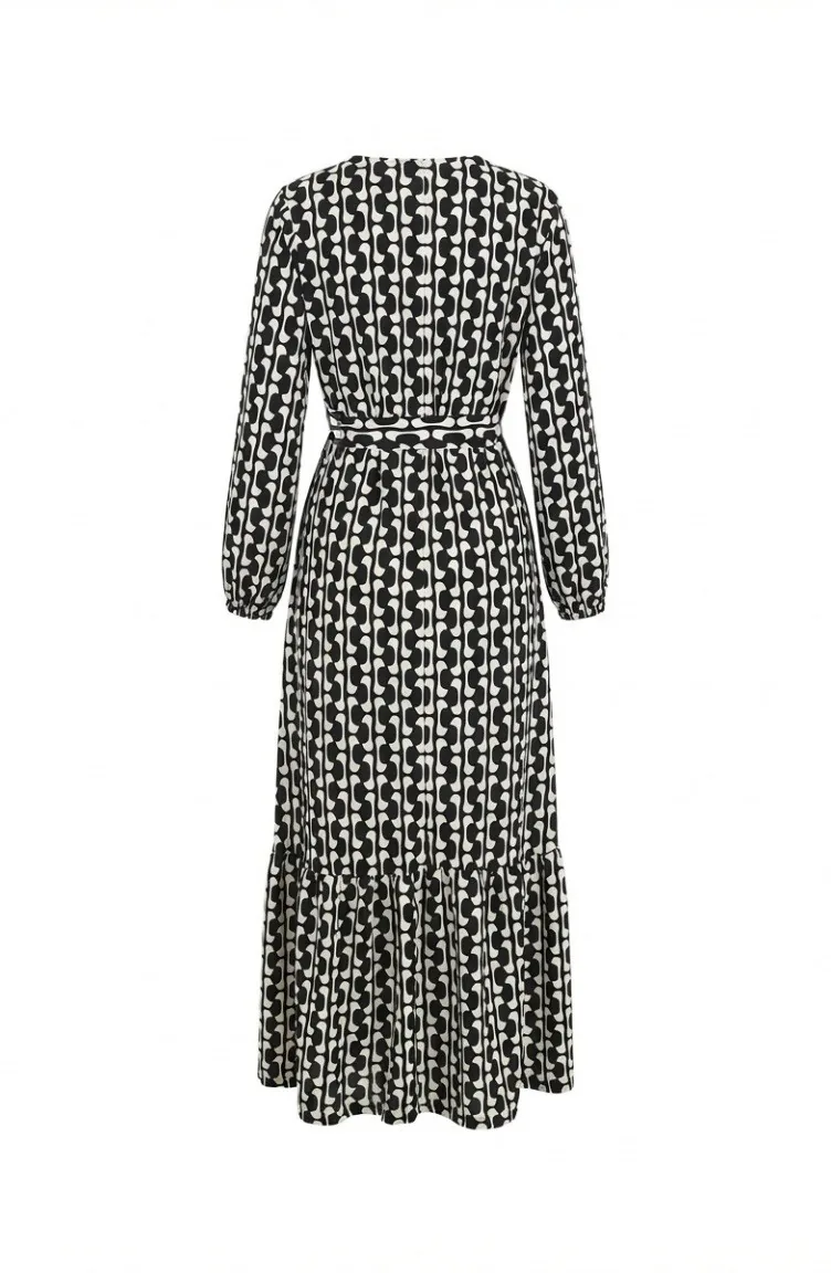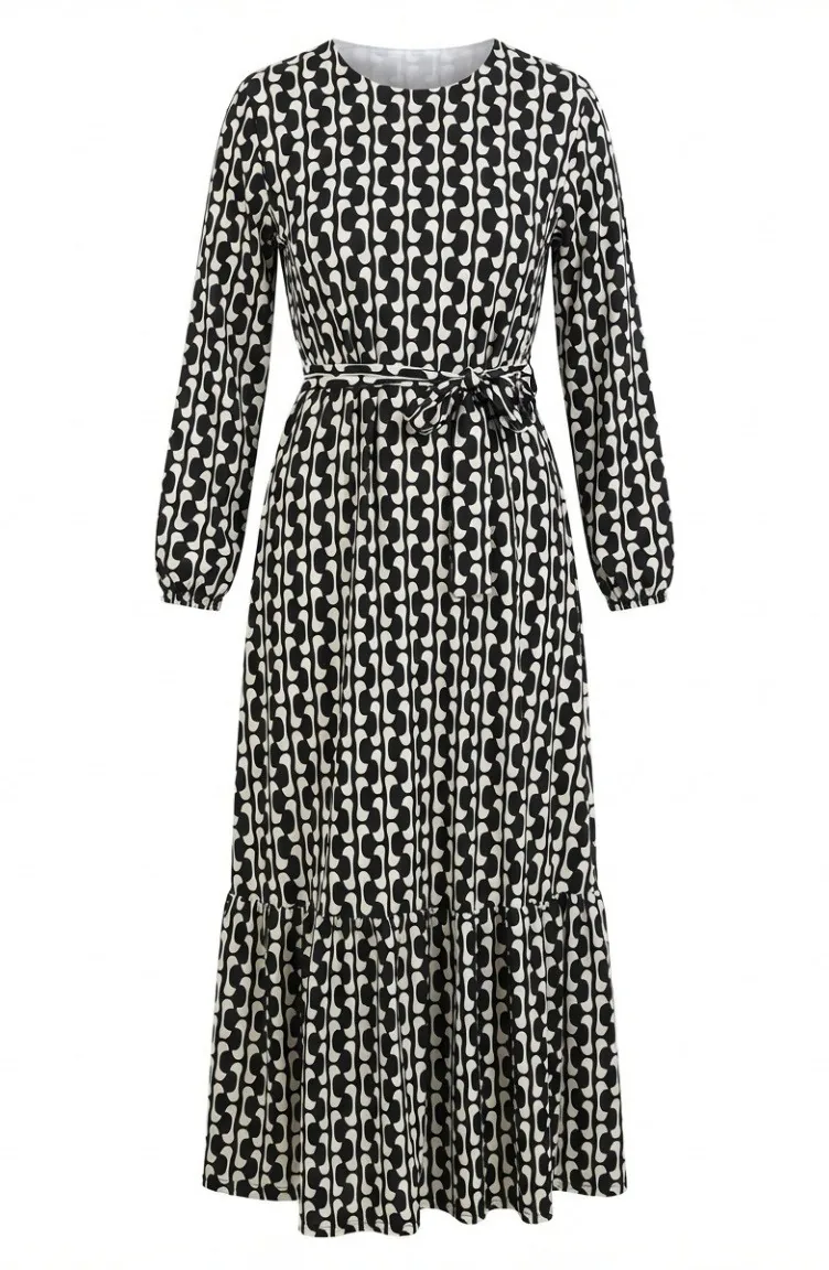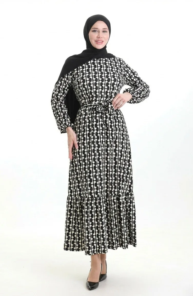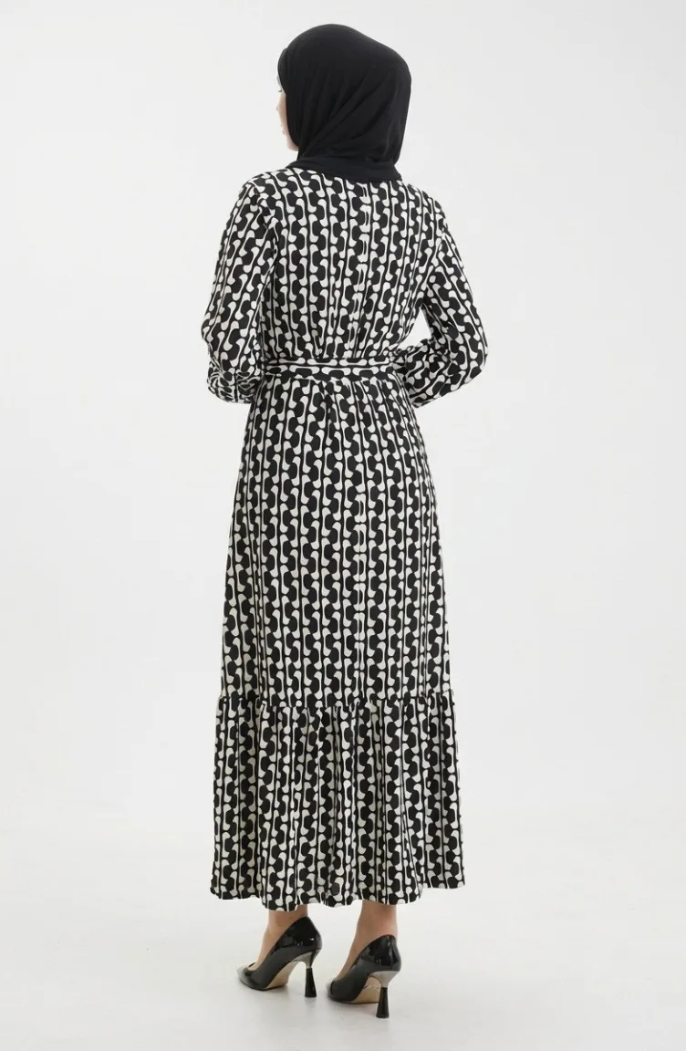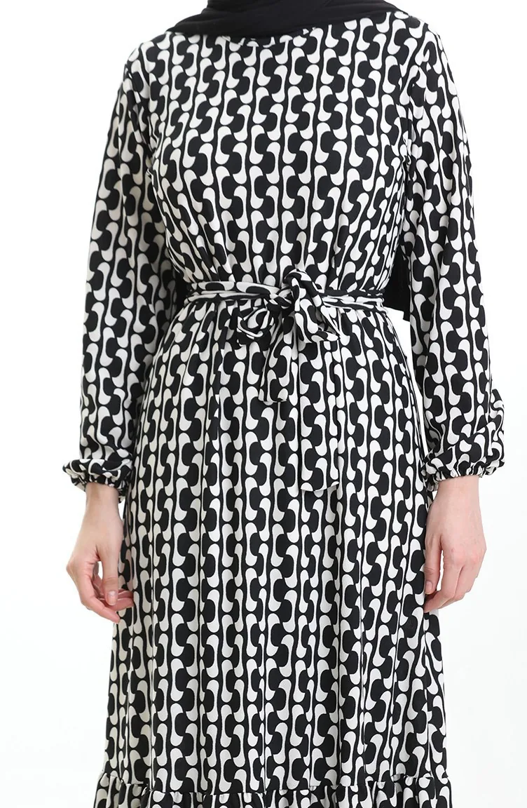 فستان بحزام مطبوع رقميًا 1006A-01 أسود وأبيض 1006A-01