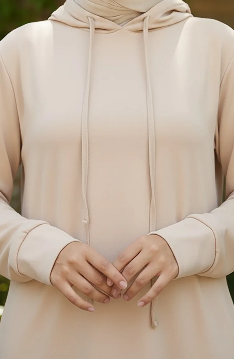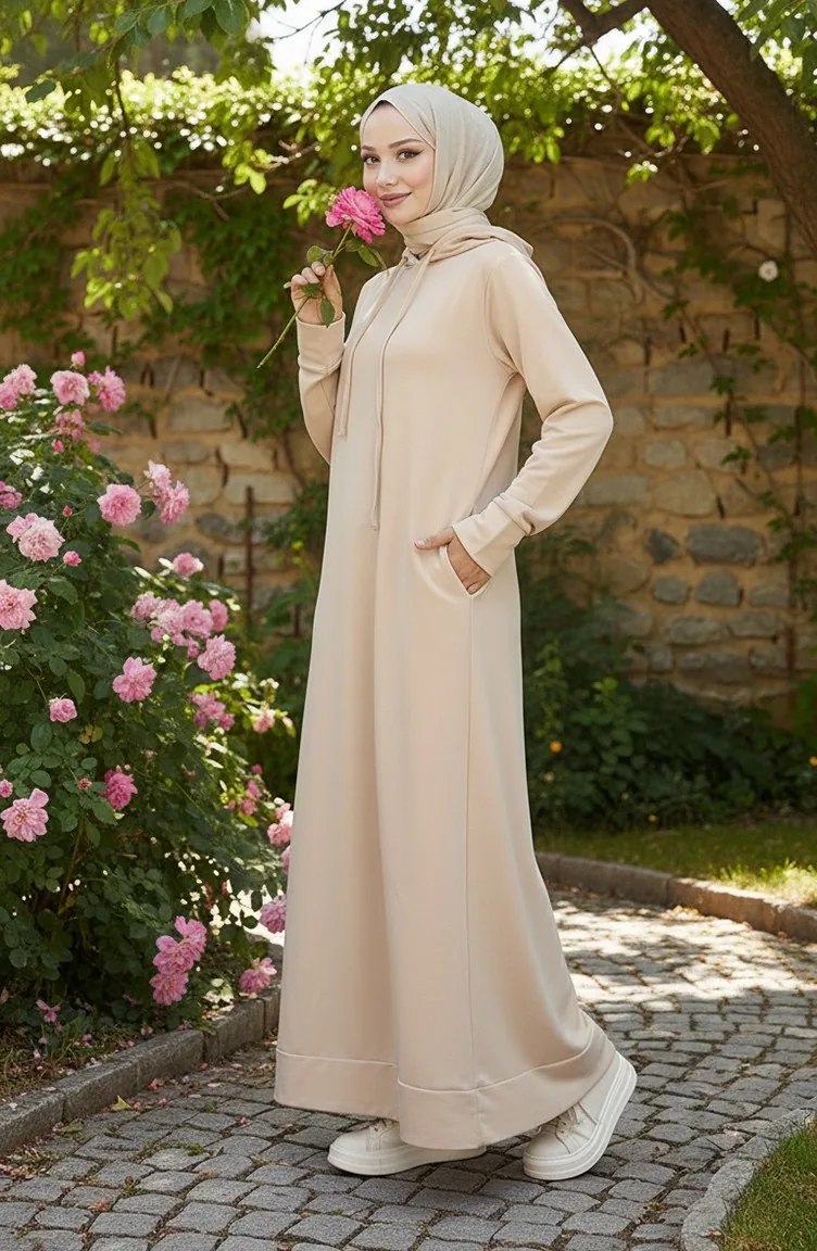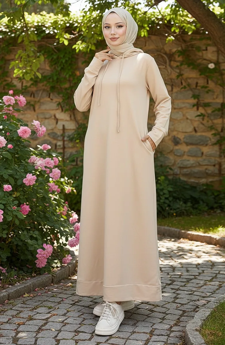 فستان رياضي بغطاء رأس من خيوط مزدوجة 0190-26 بيج فاتح 0190-26