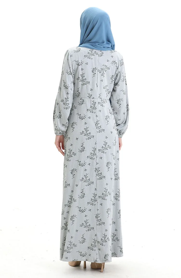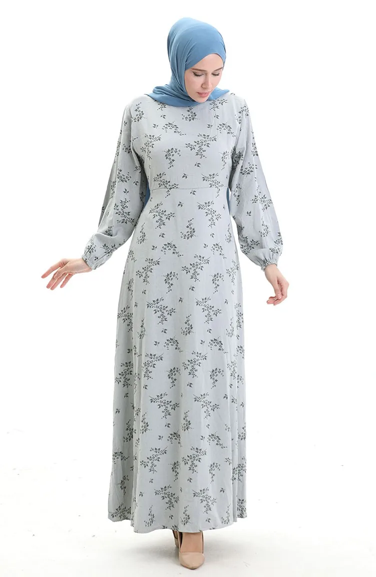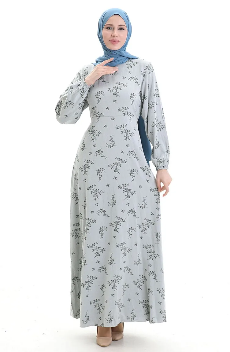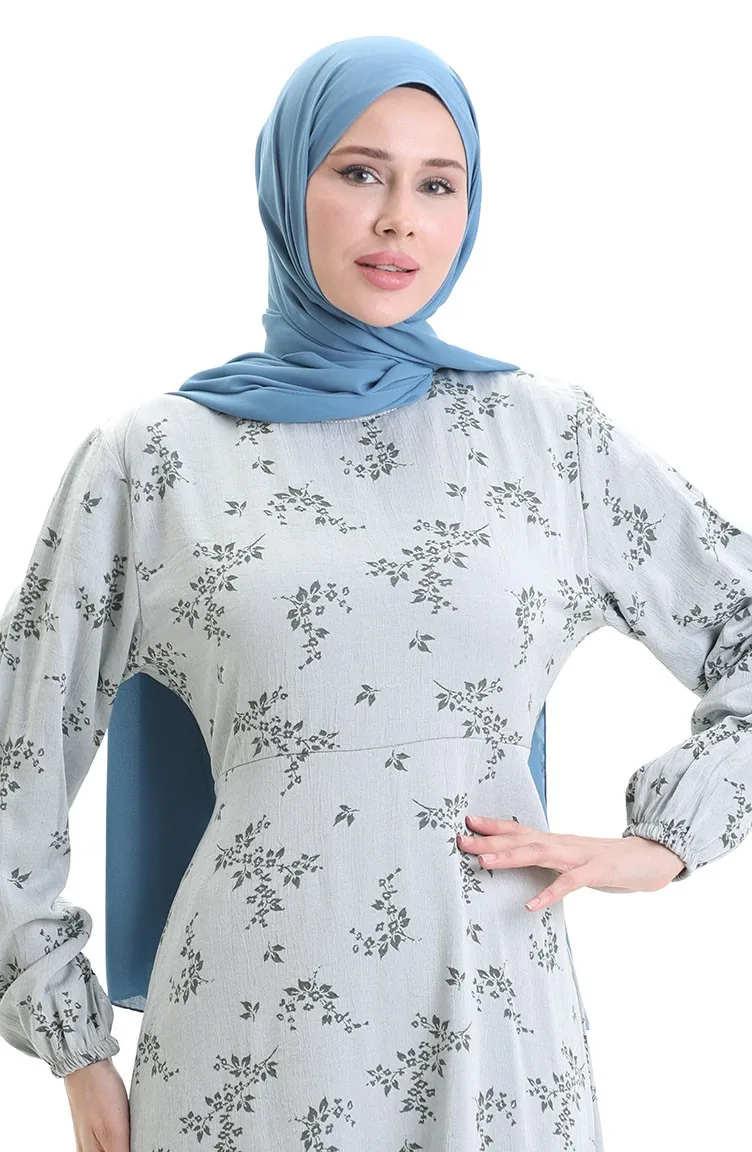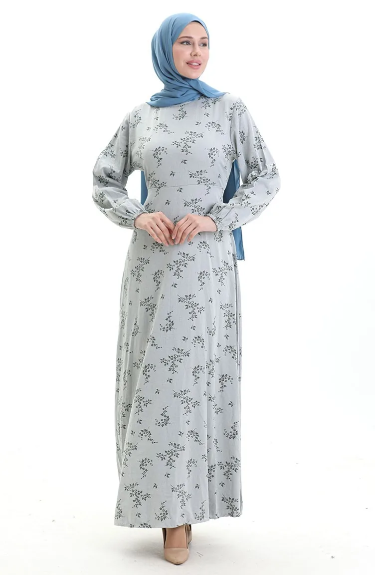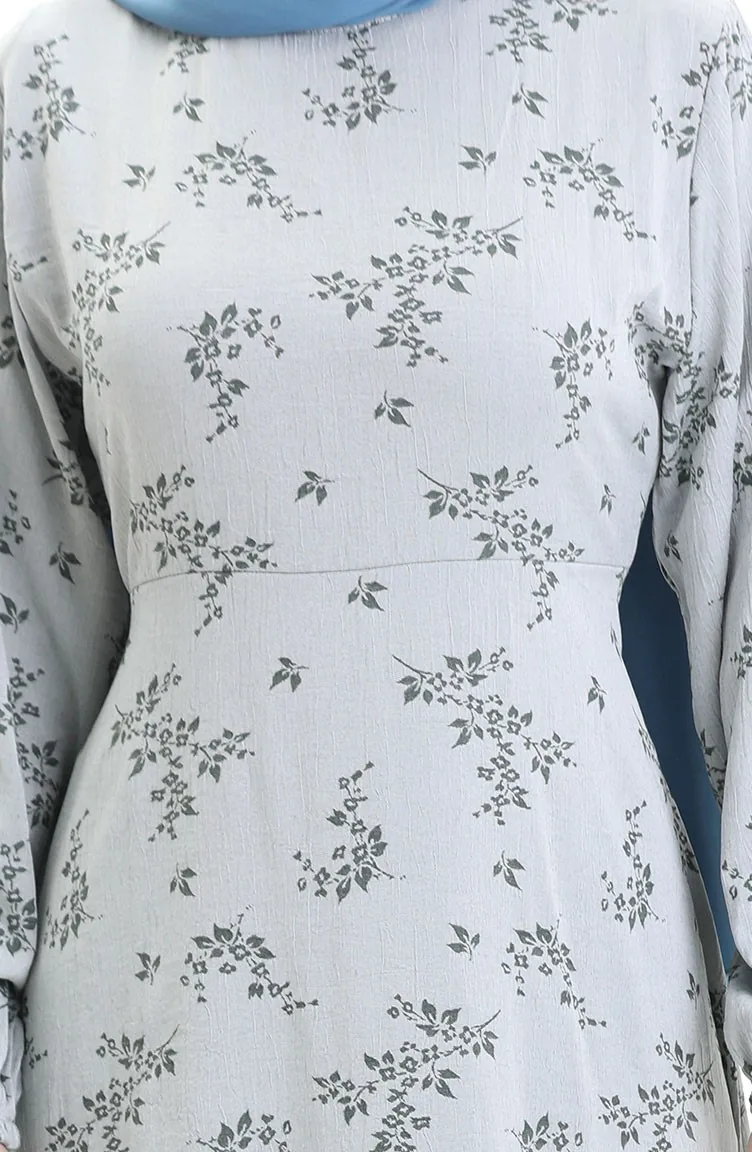 فستان منقوش بأكمام مرنة 2047-07 فضي رمادي 2047-07
