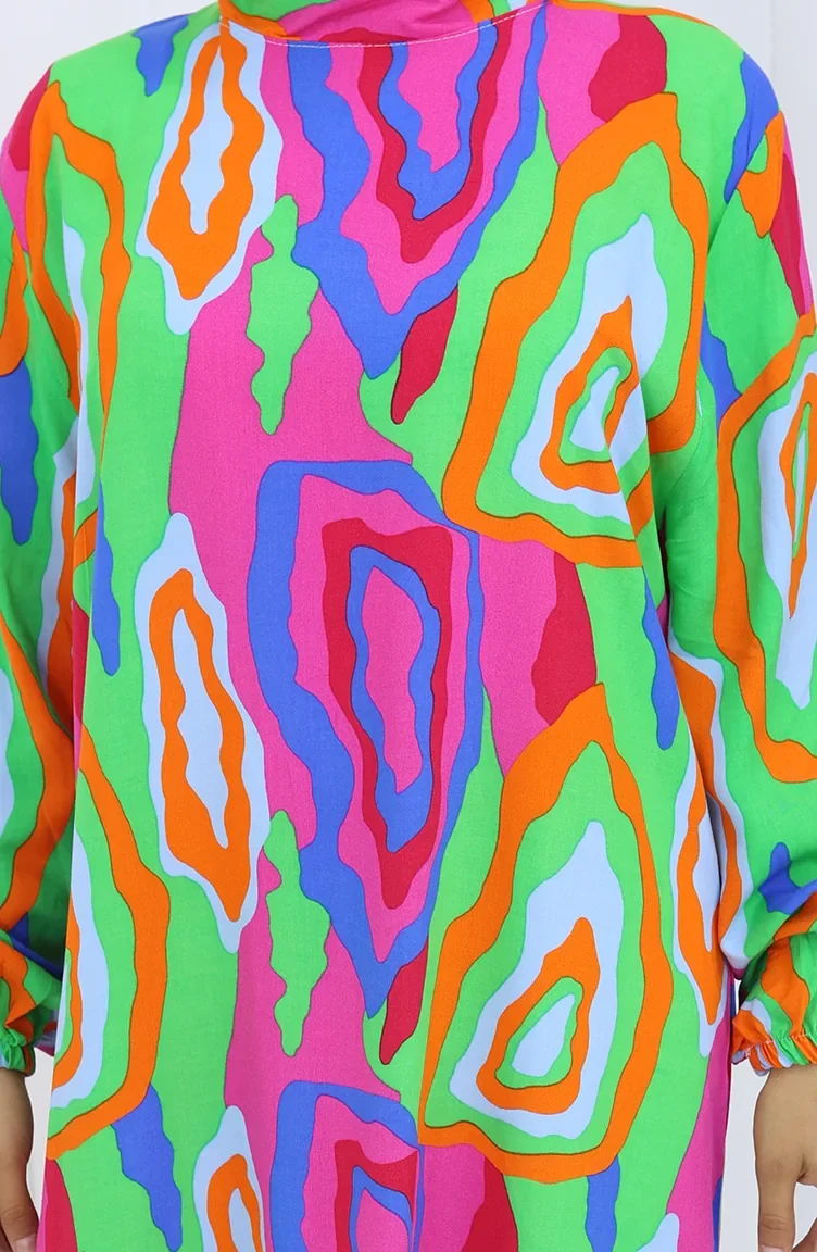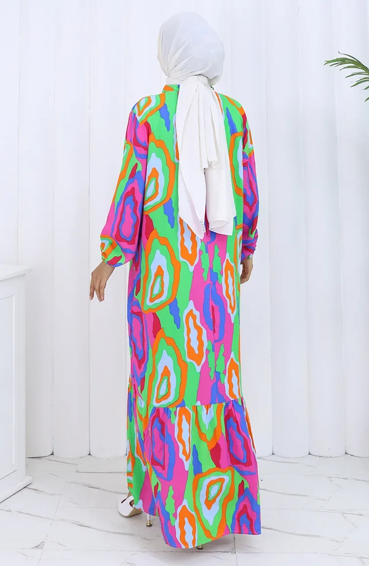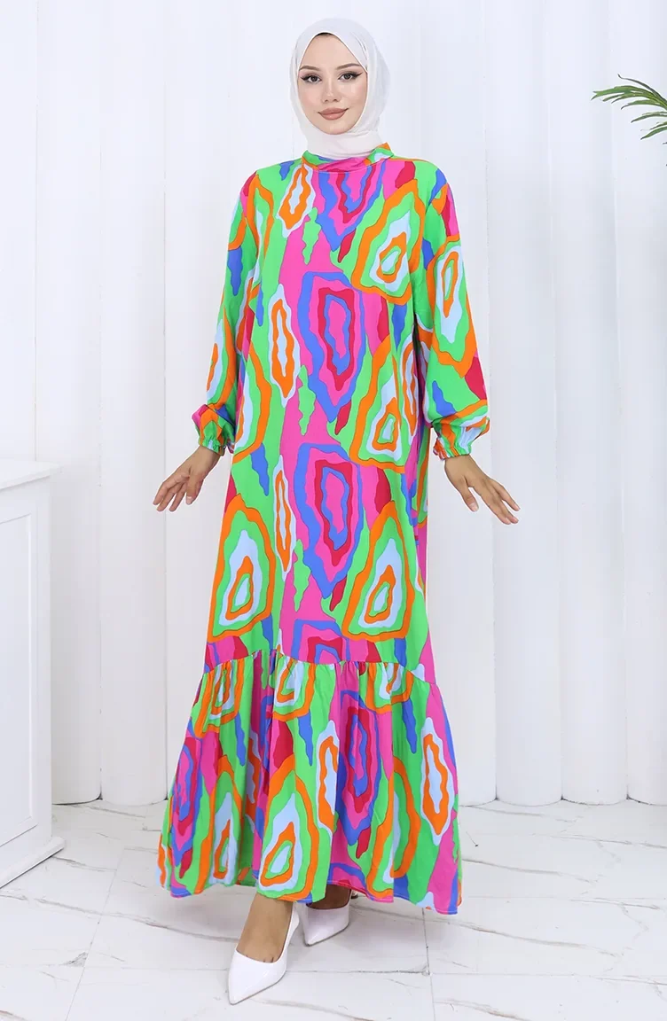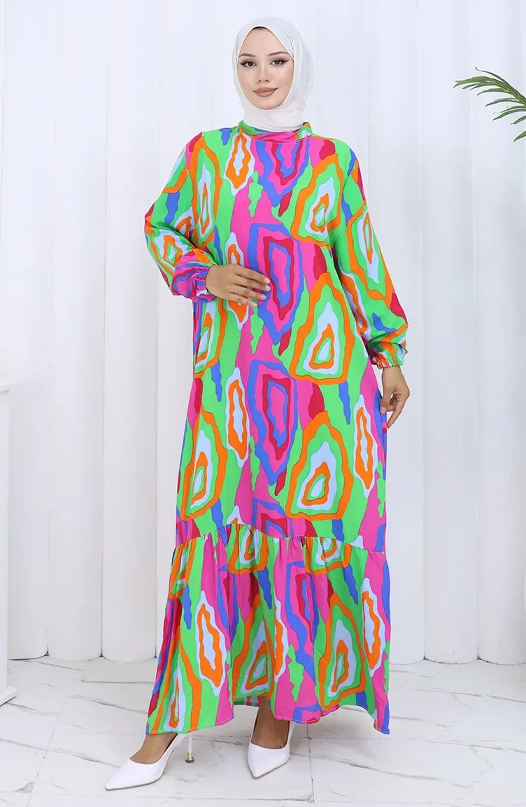 فستان منقوش بأكمام مرنة 2122-03 برتقالي فوشيا 2122-03