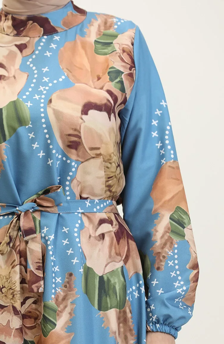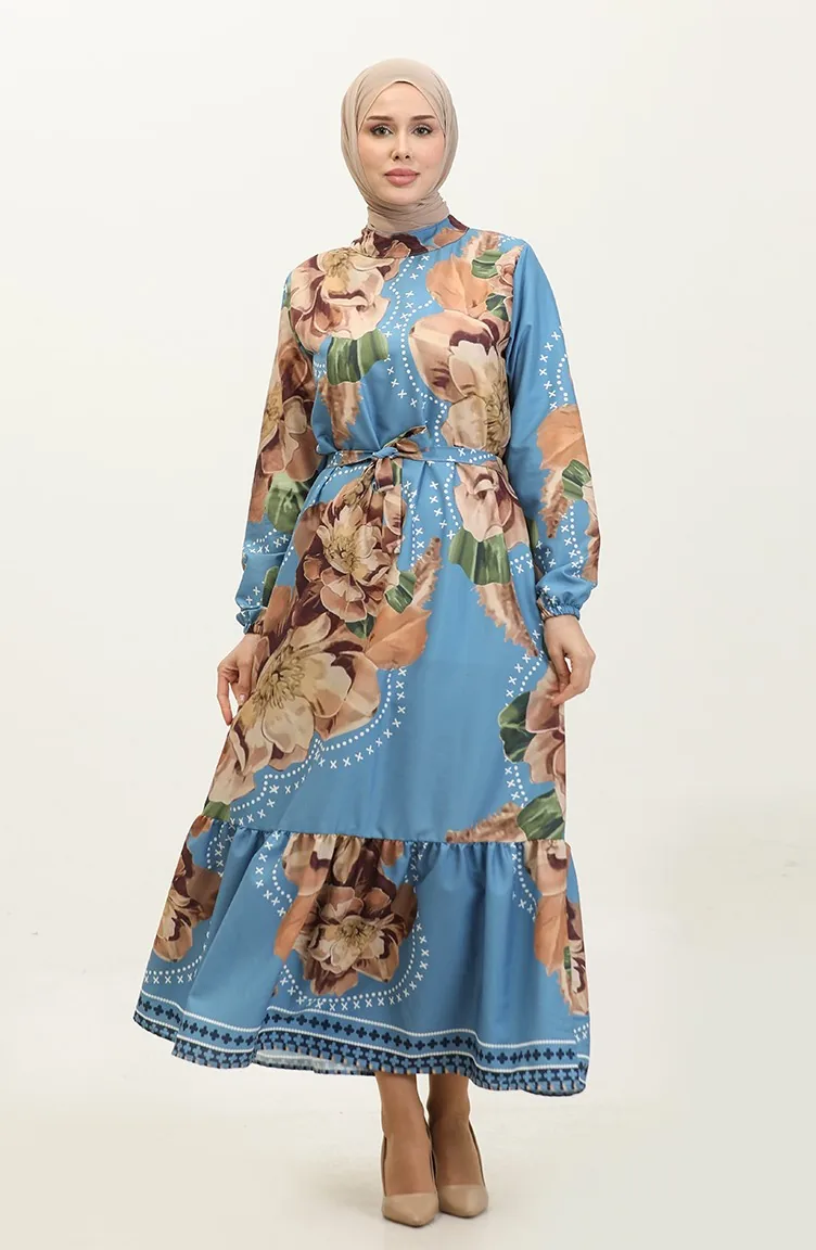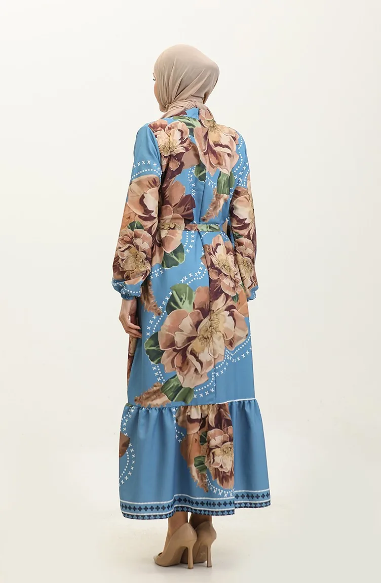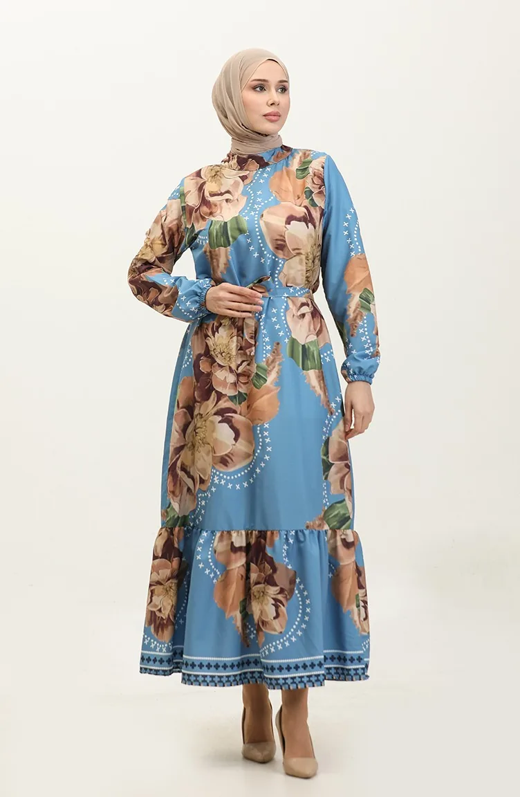 فستان كريب بنقش أزهار 0350-01 بني أزرق 0350-01