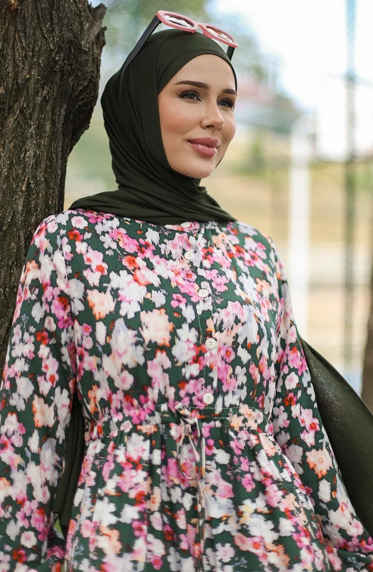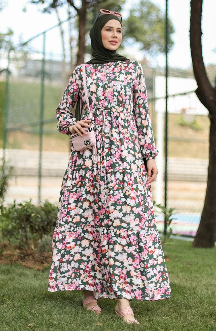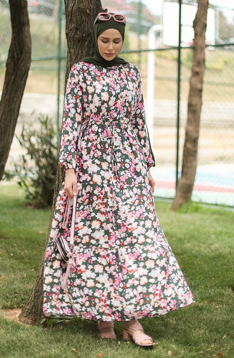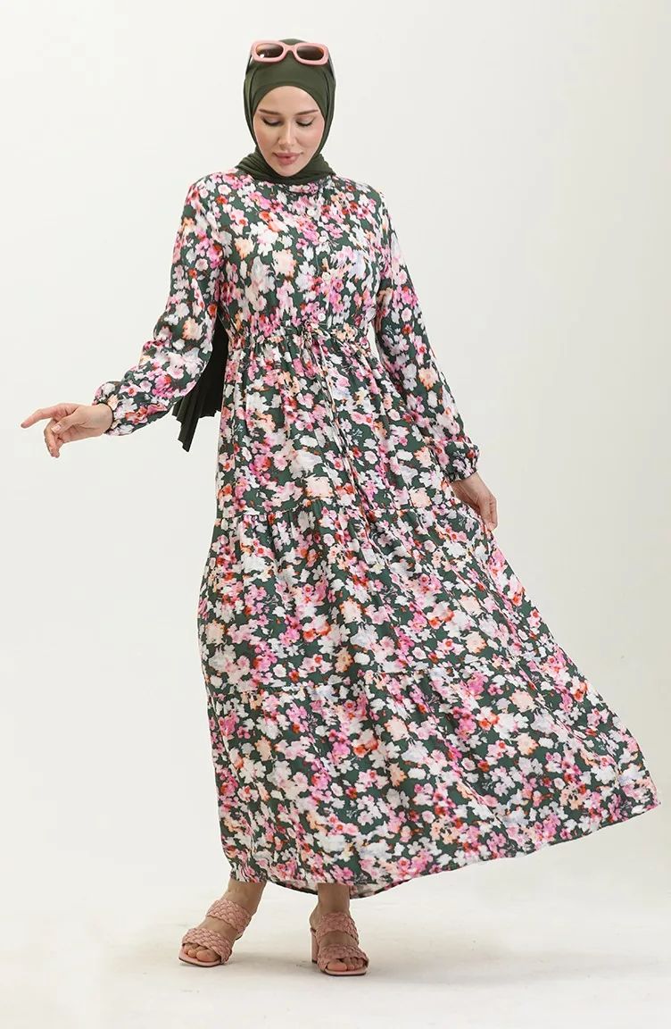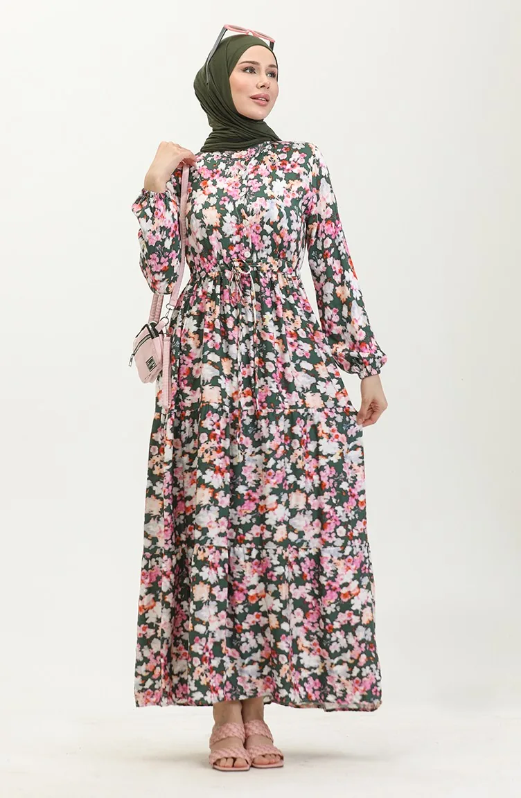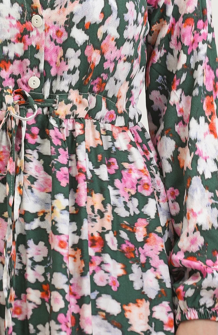 فستان فيسكوز بتصميم مورّد 0442-01 لون أخضر زمردي وزهري 0442-01