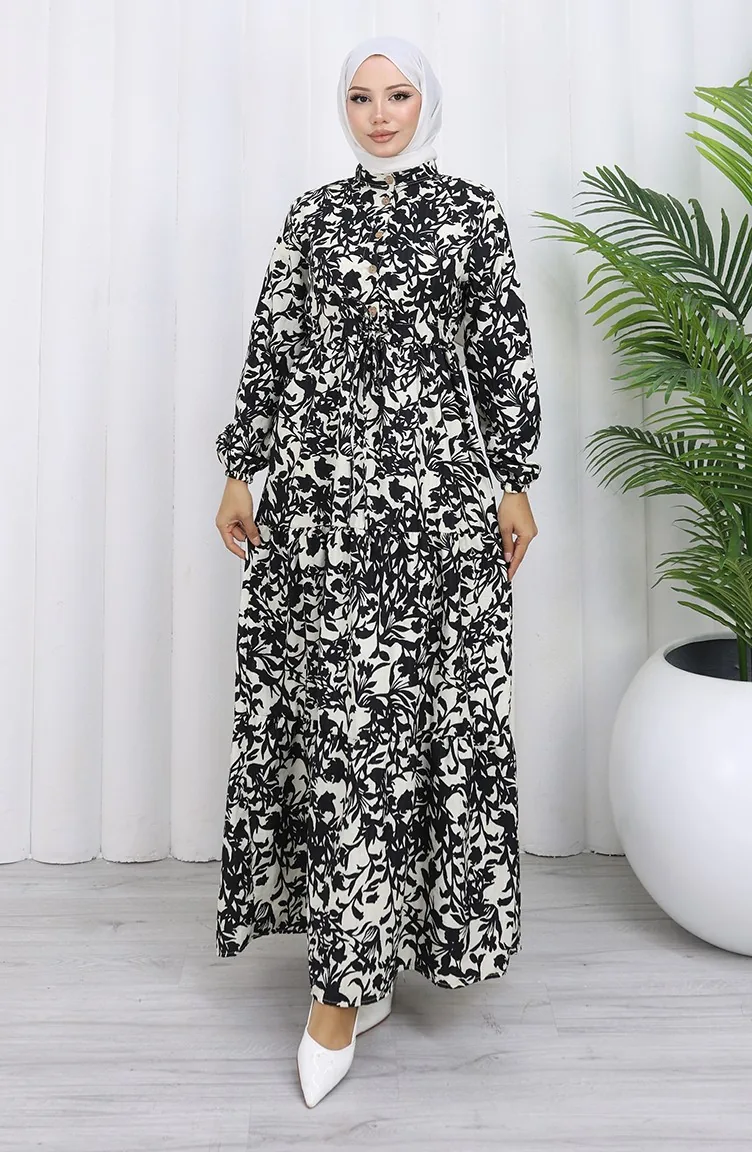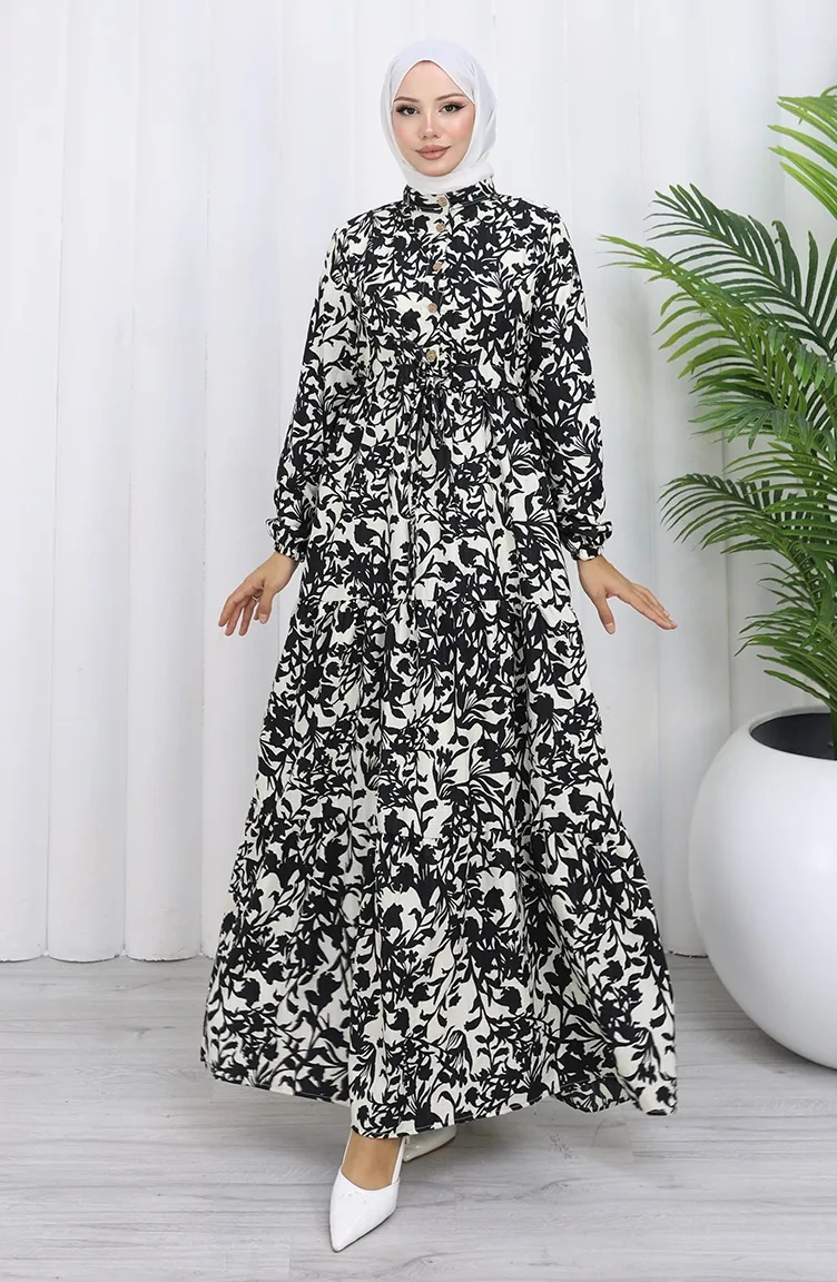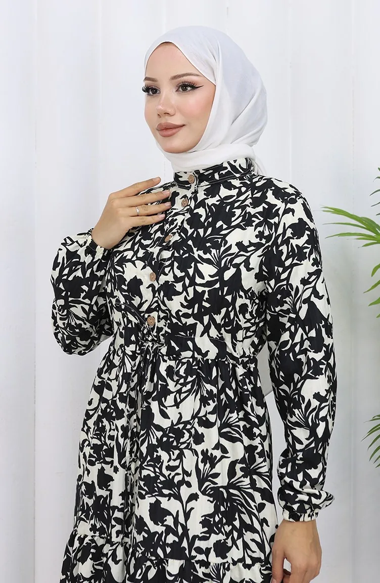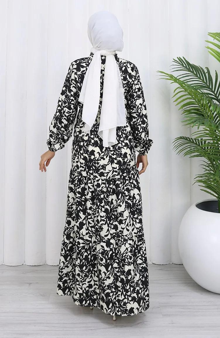 فستان منقوش بياقة جدّ وخصر مربوط 0190-05 أسود 0190-05