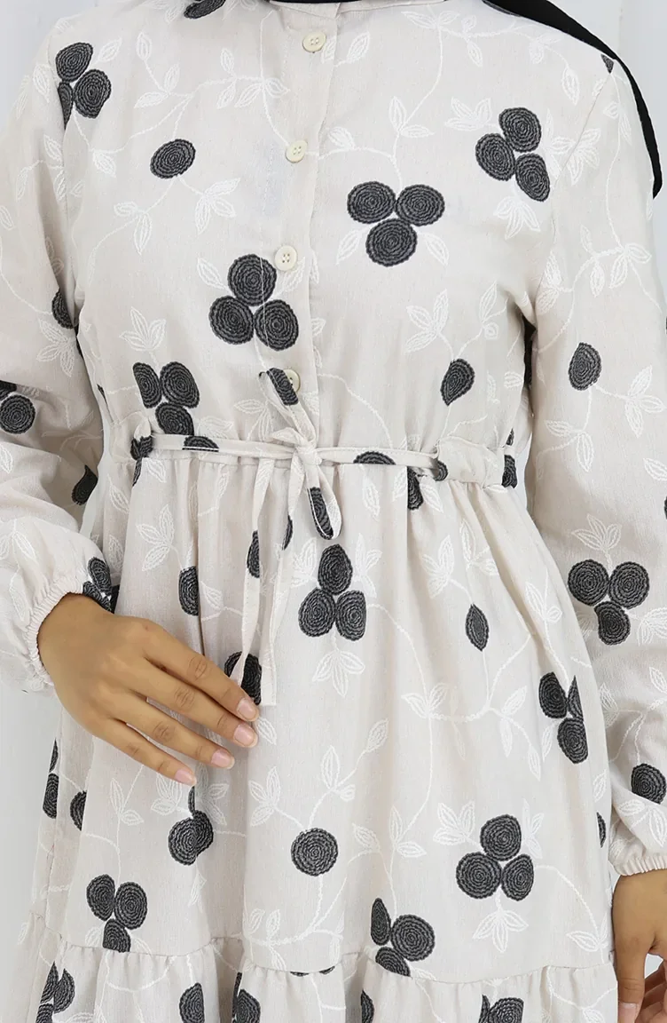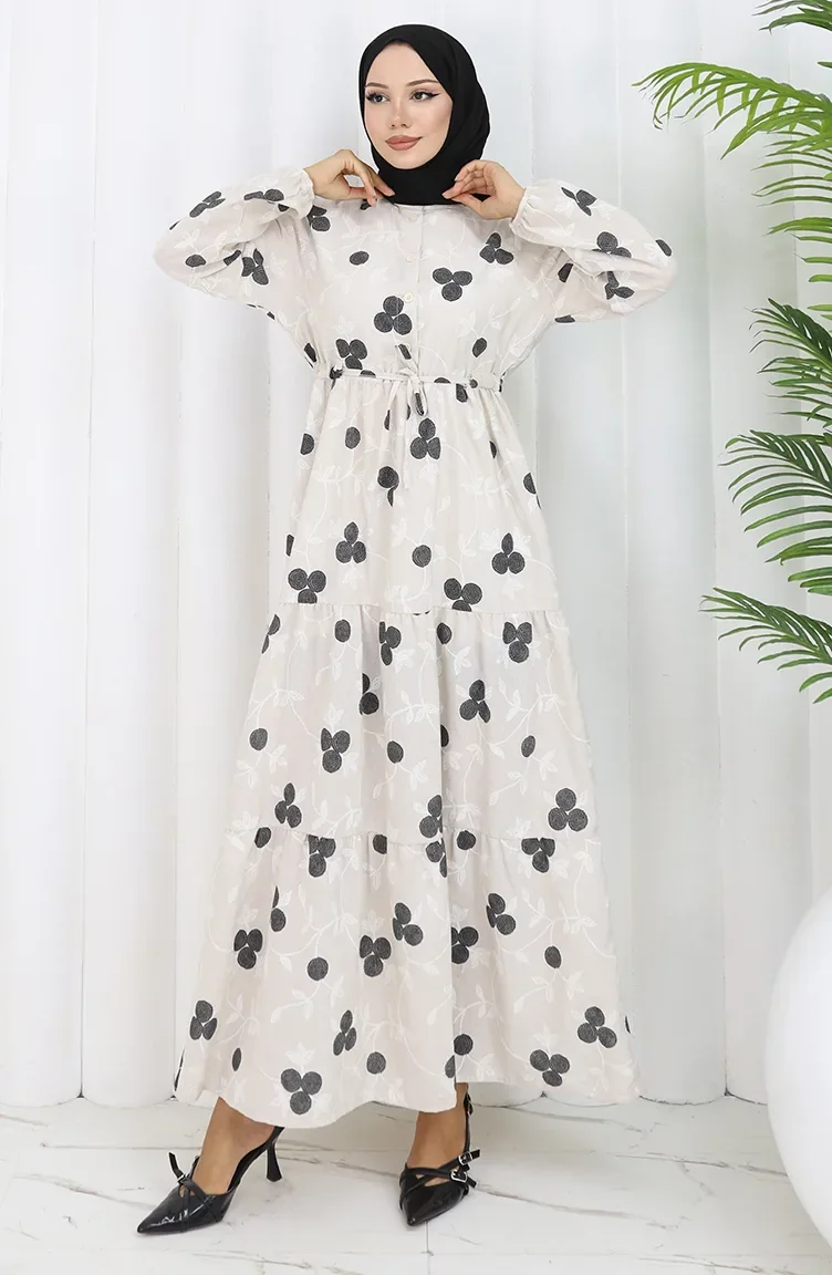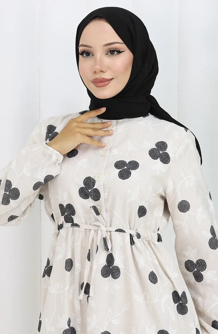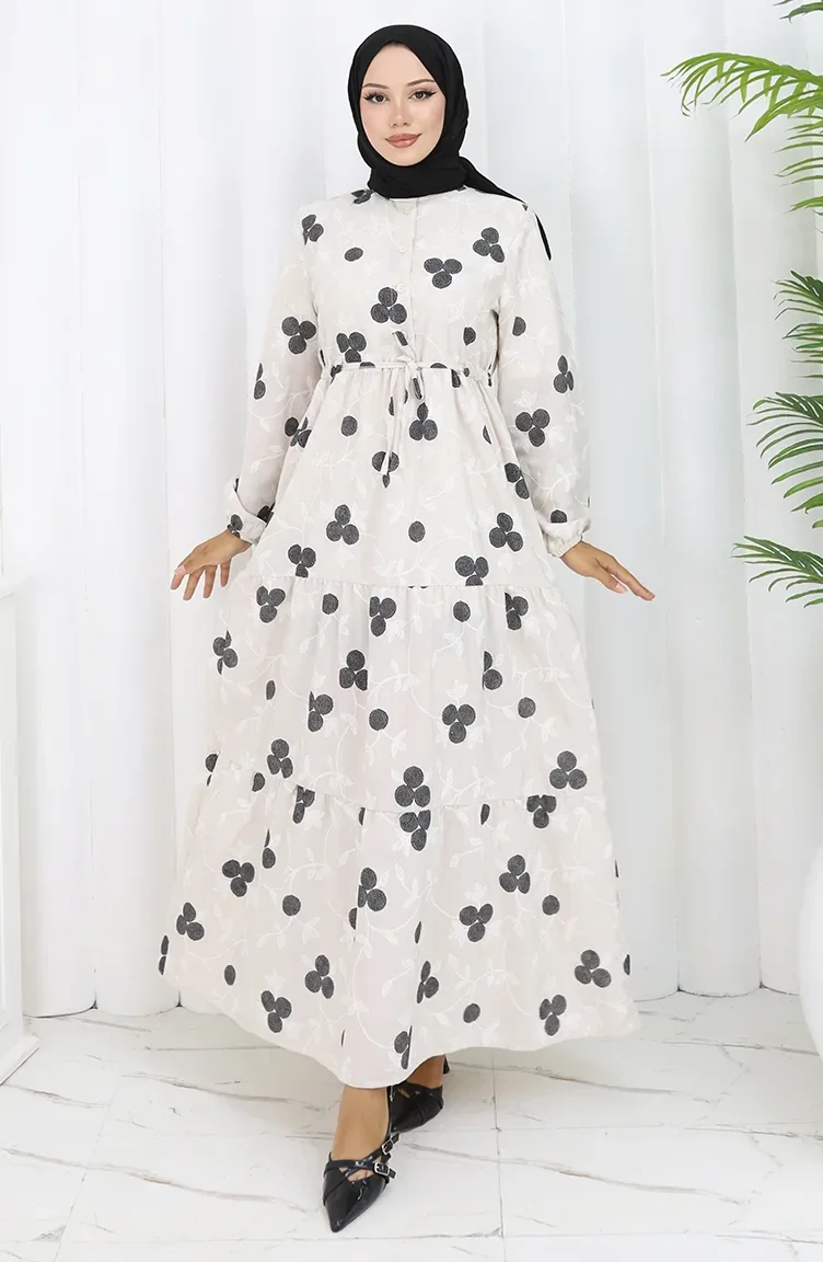 فستان كتان نصف أزرار 2099-01 بيج أسود 2099-01