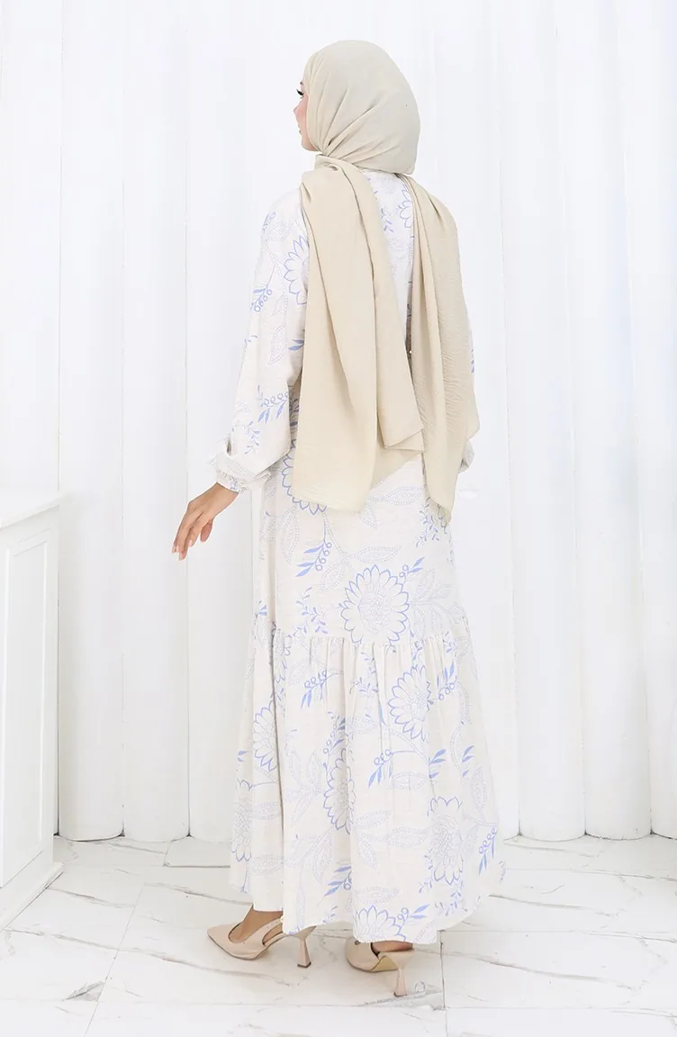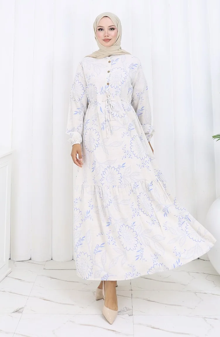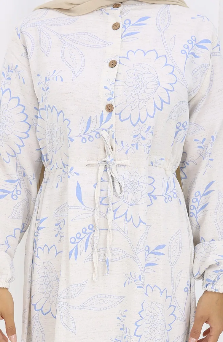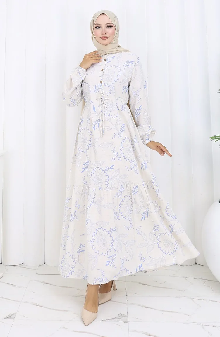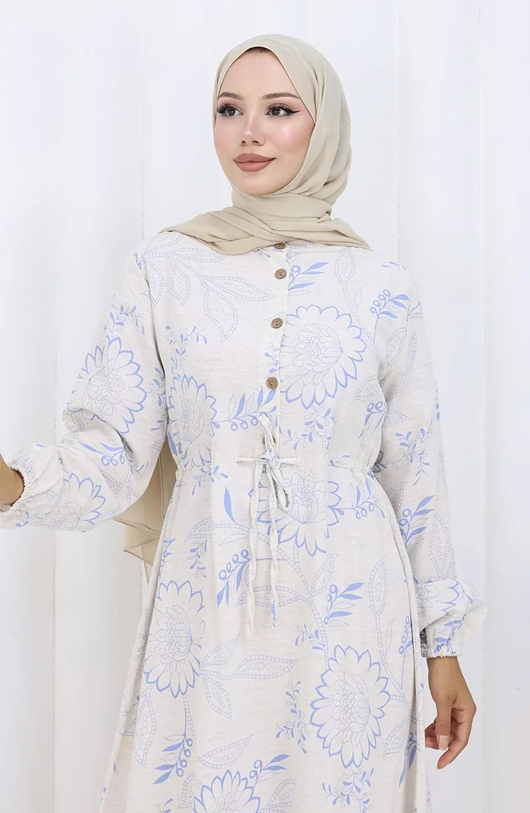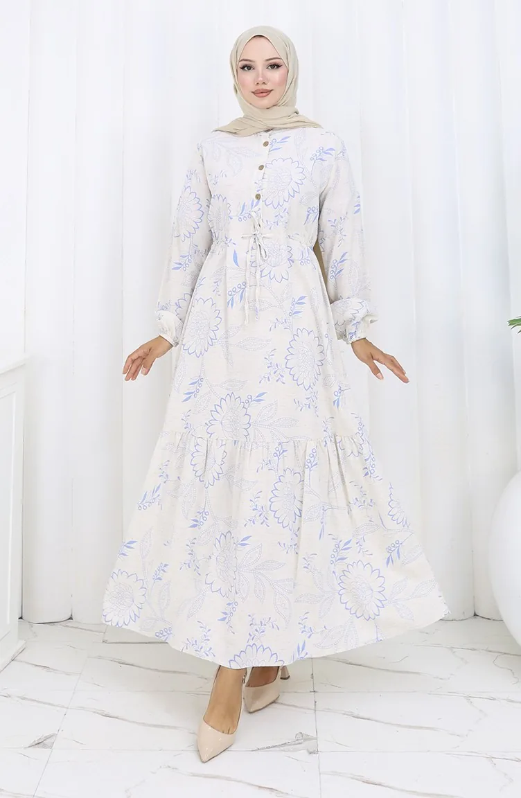 فستان من قماش الكتان برباط على الخصر وأزرار 0173C-03 بيج أزرق داكن 0173C-03