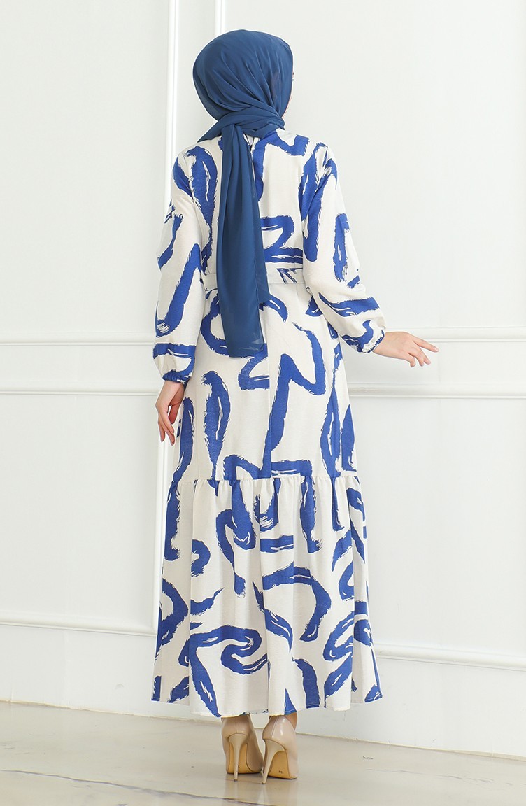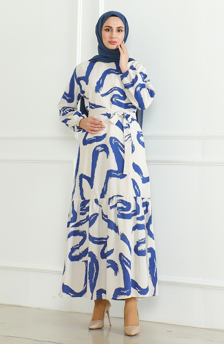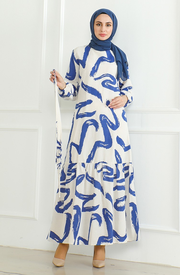 فستان كتان منقوش 0471A-03 بيج كحلي 0471A-03
