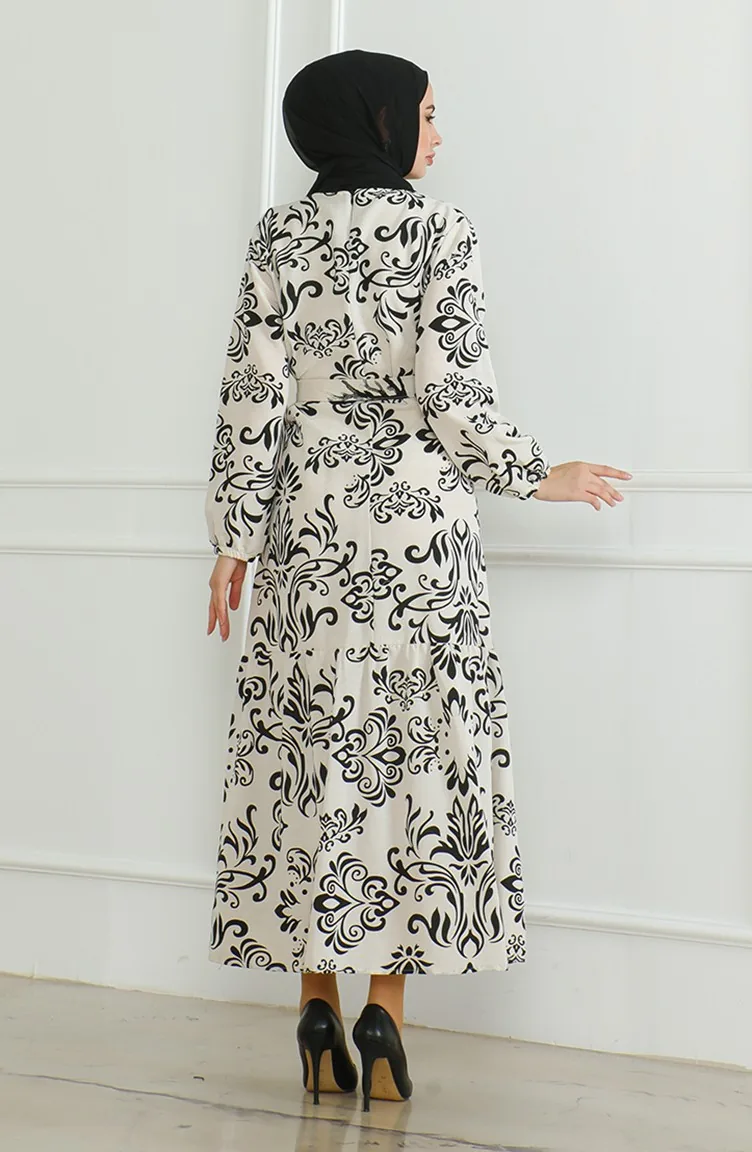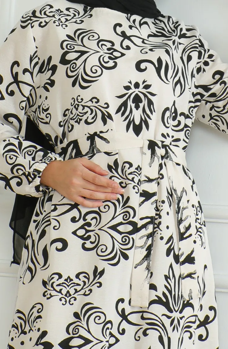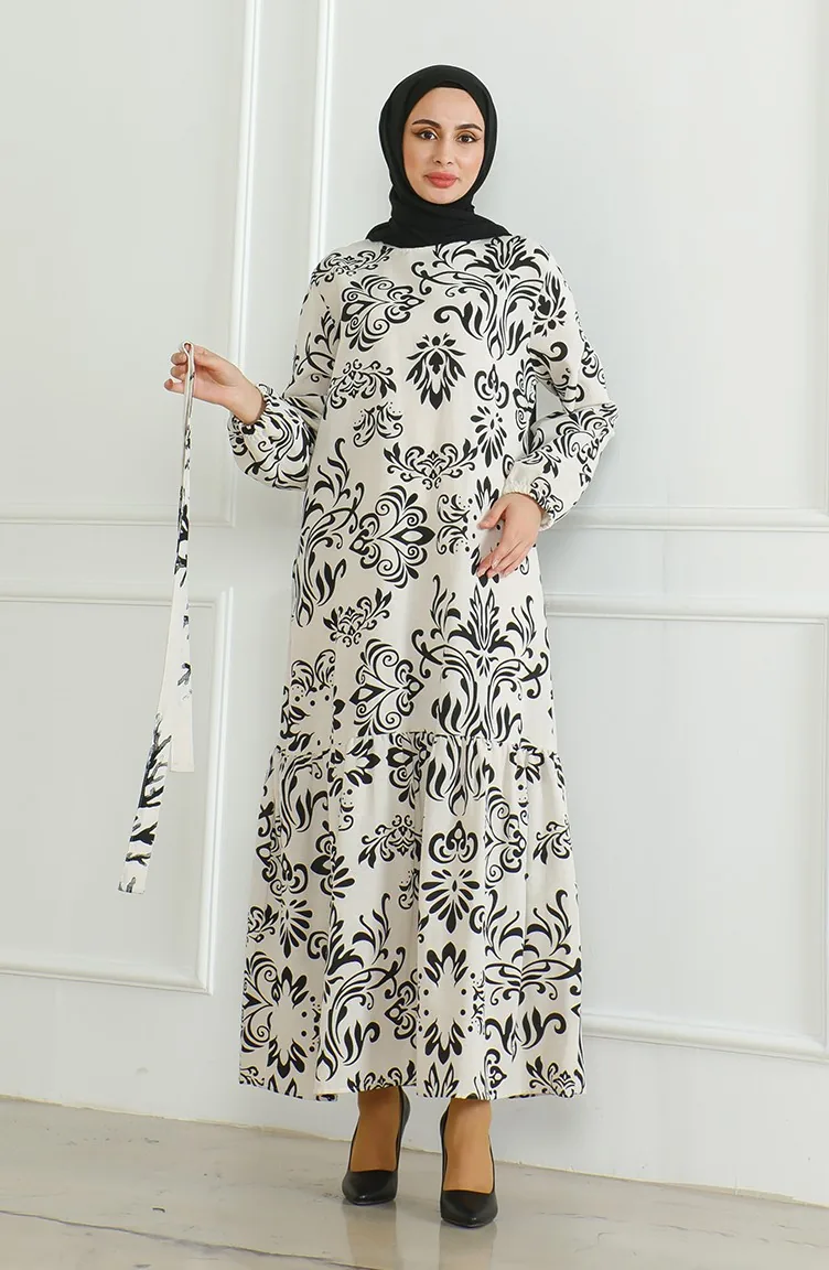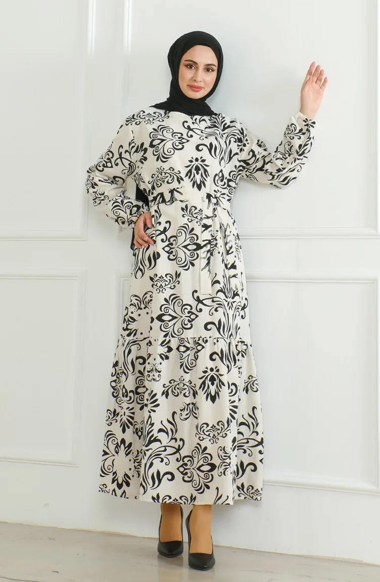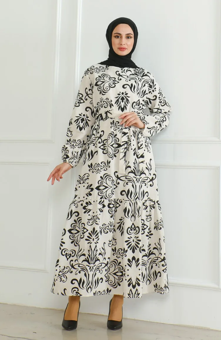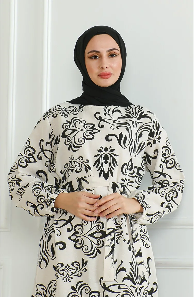 فستان كتان منقوش 0471B-03 بيج أسود 0471B-03