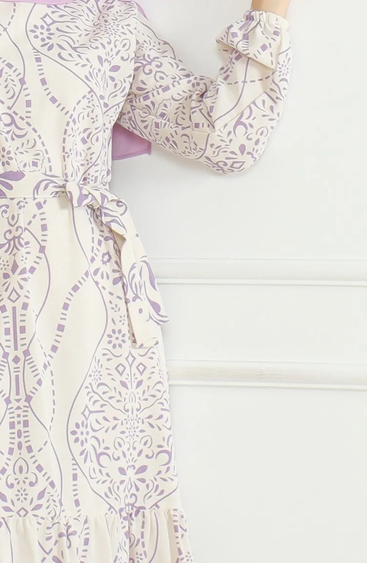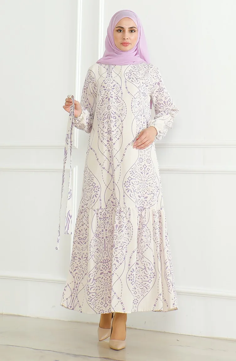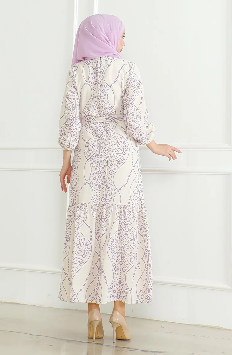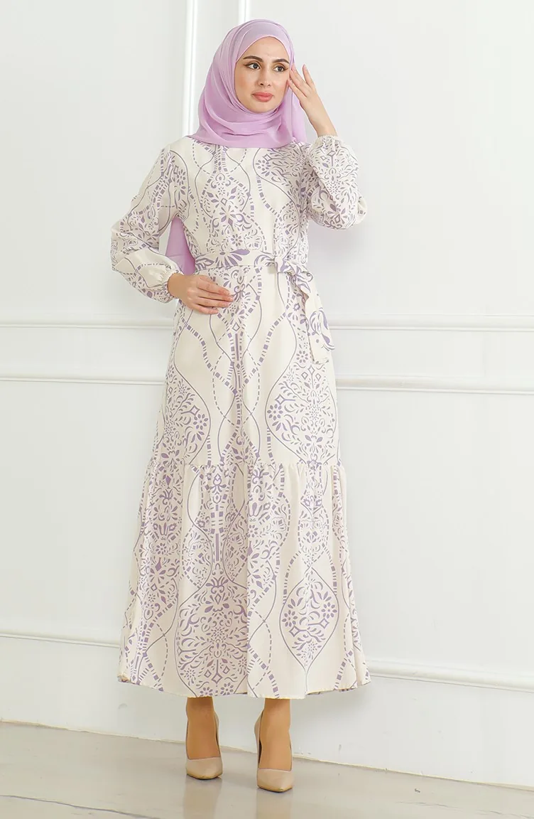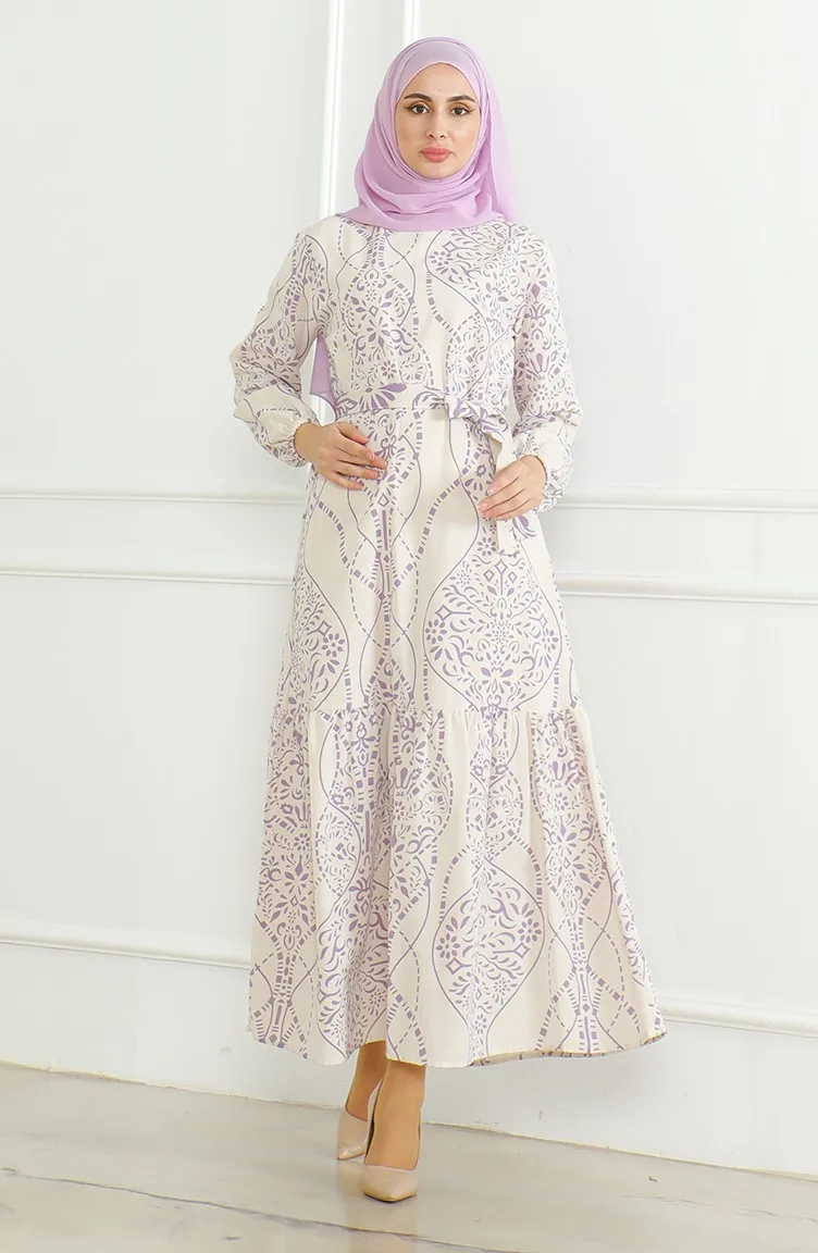 فستان كتان منقوش 0471E-01 بيج بنفسجي فاتح 0471E-01