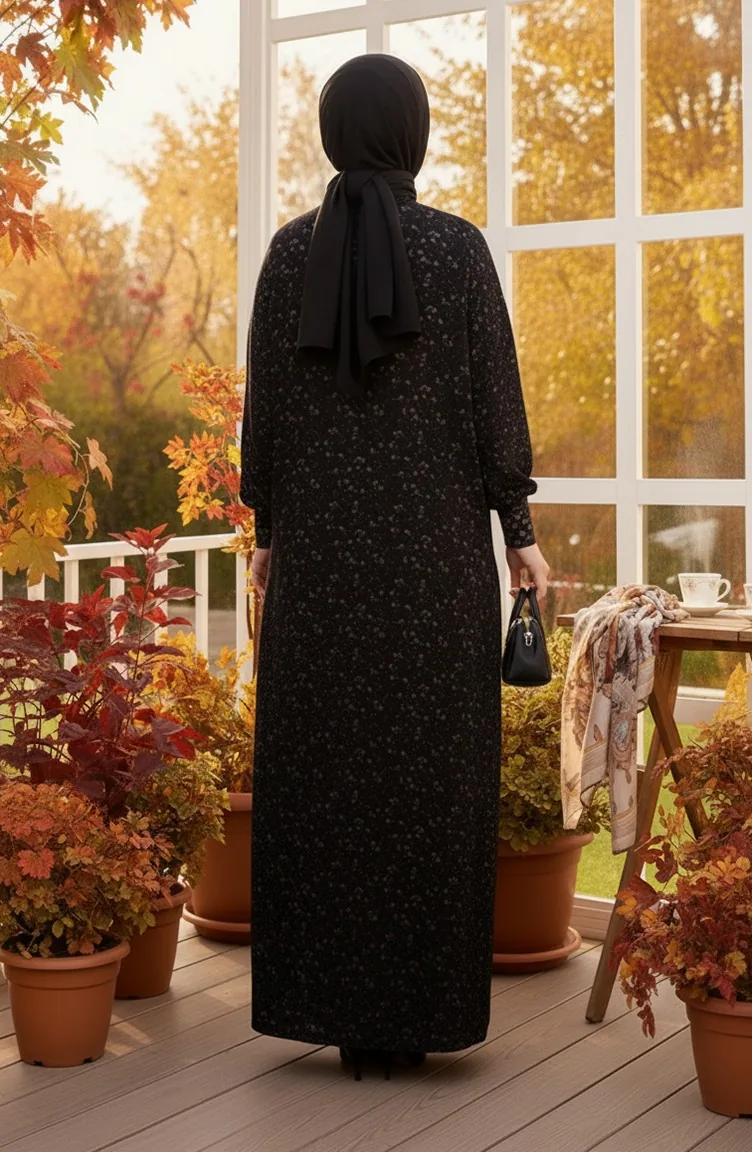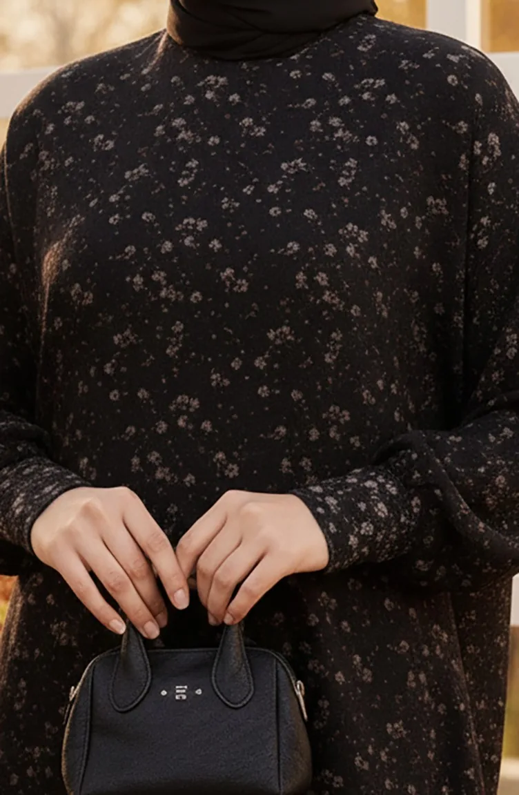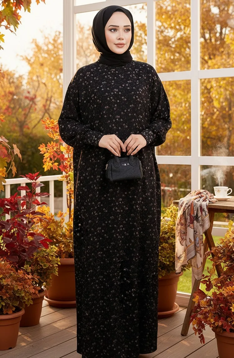 فستان كريب منقوش 7137-04 أسود 7137-04