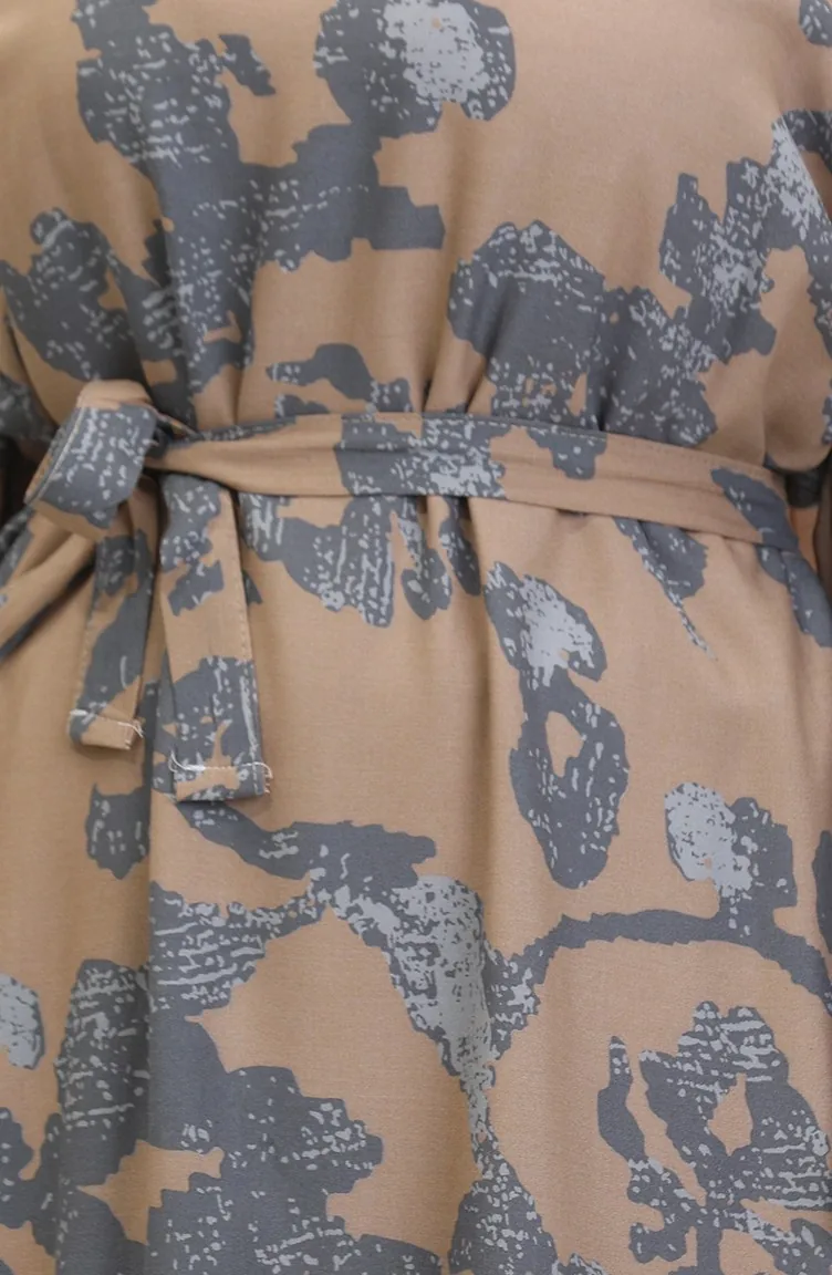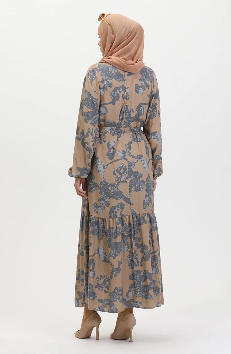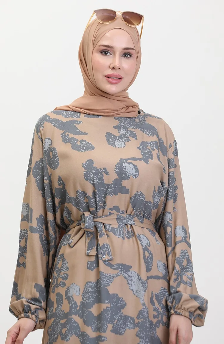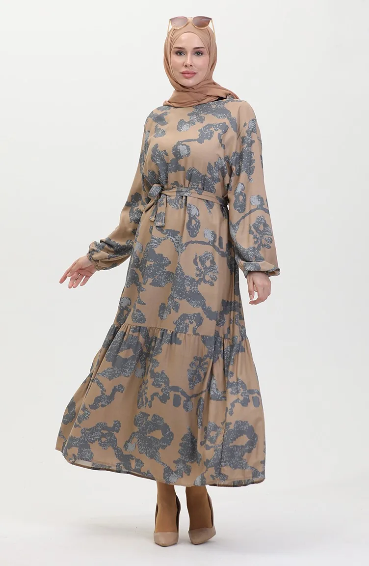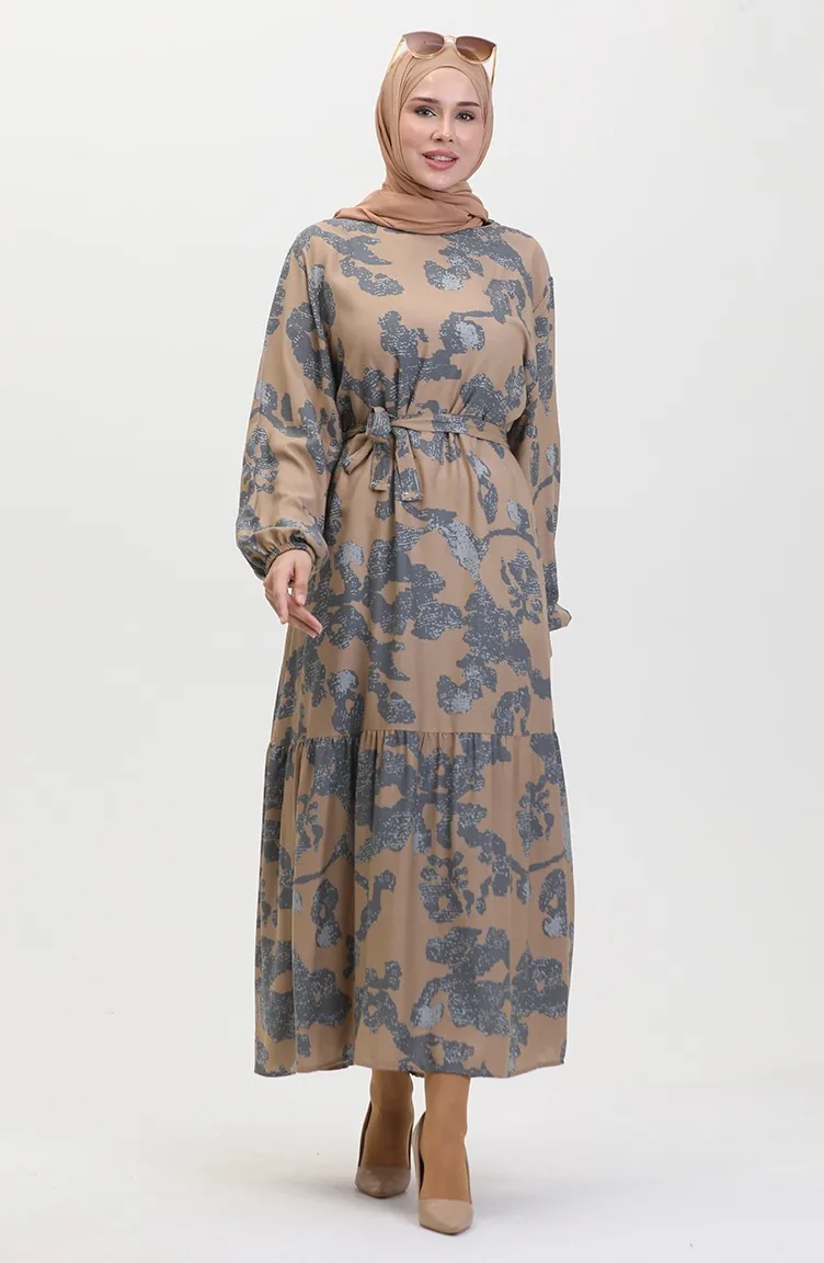 فستان بتصميم مُطبع وحواف مُجمعة 0451-03 لون رمادي 0451-03