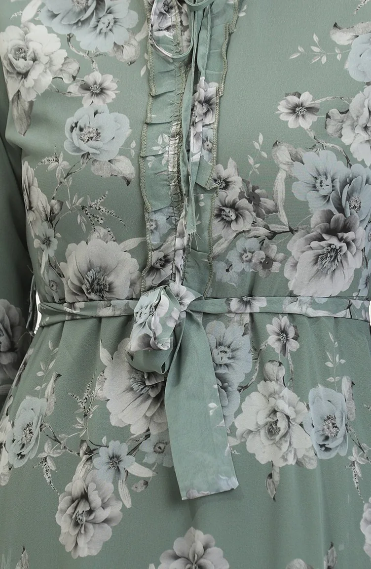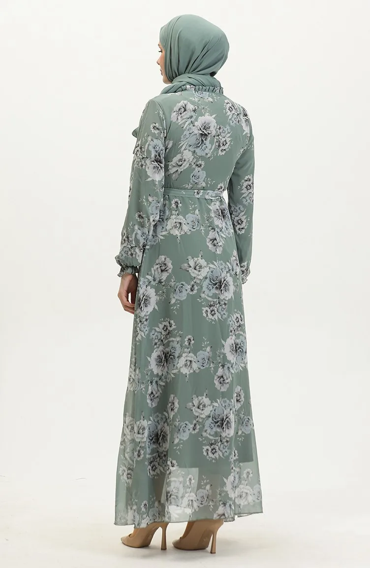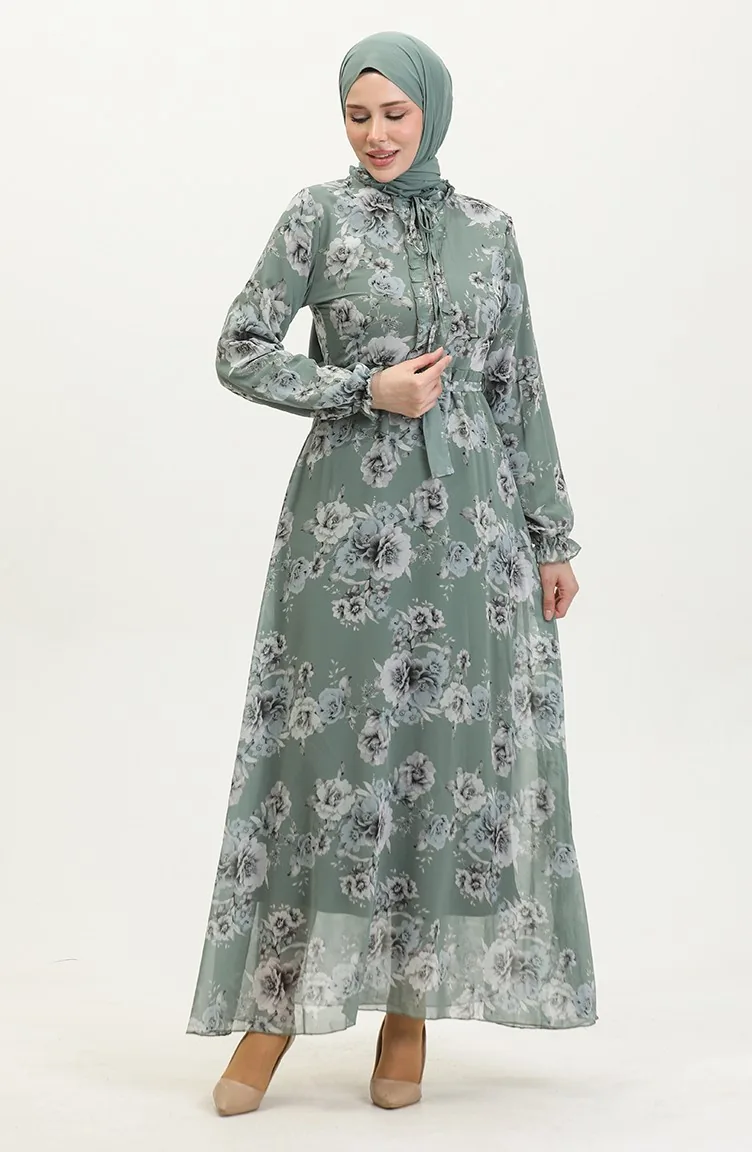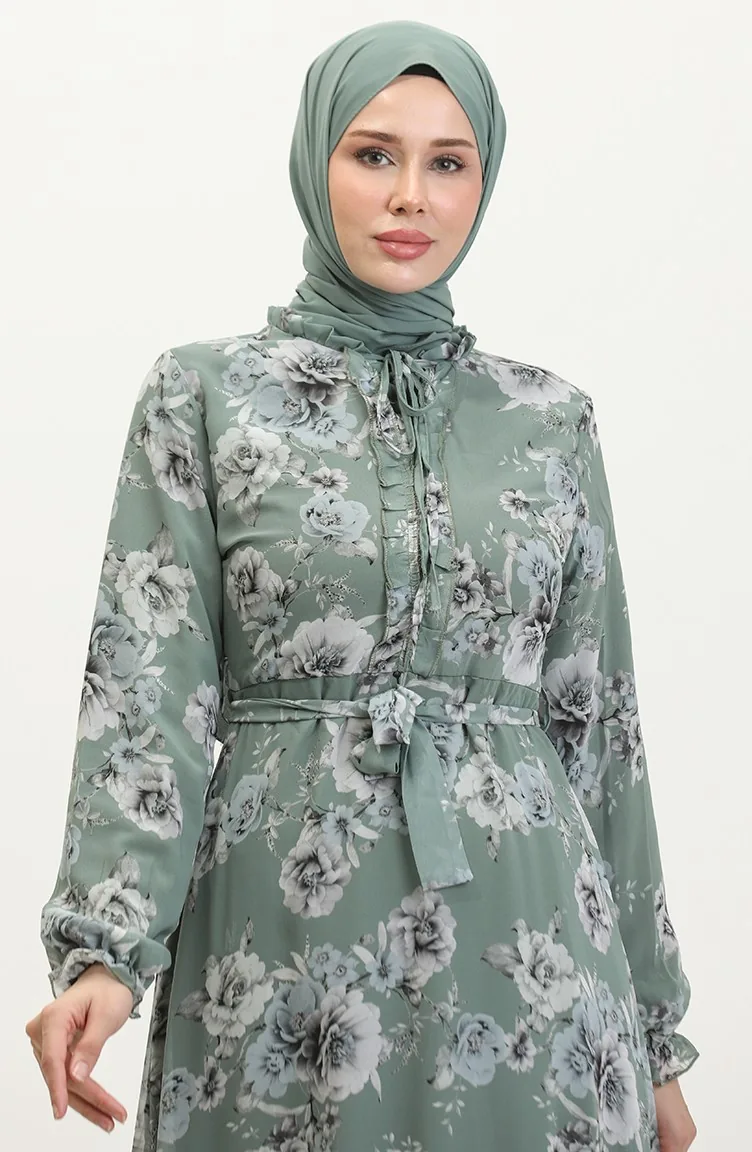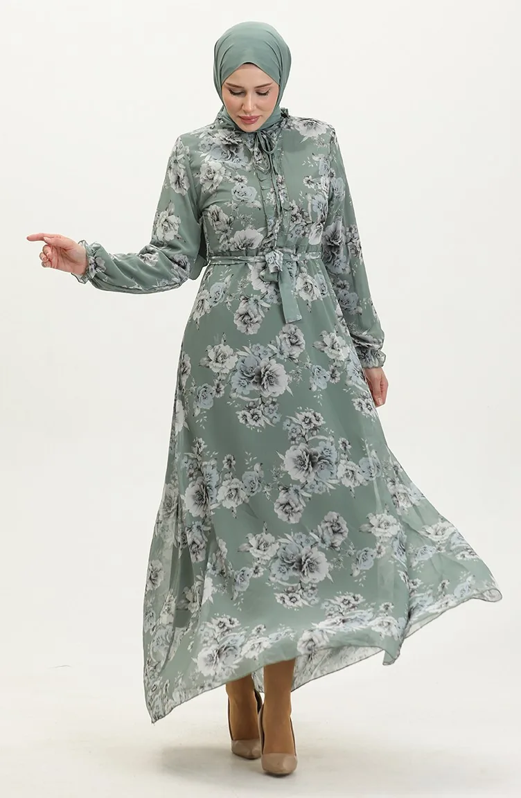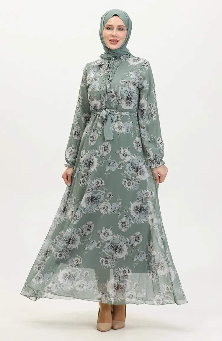 فستان شيفون منقوش بحزام 81832-03 أخضر مينت 81832-03