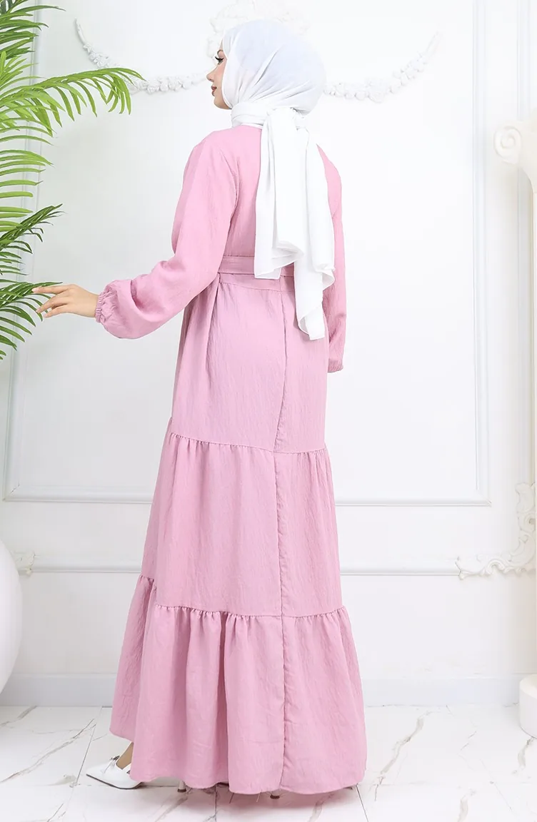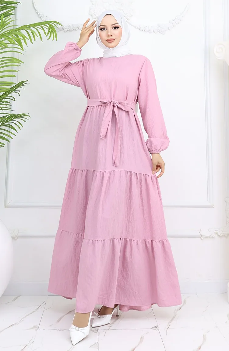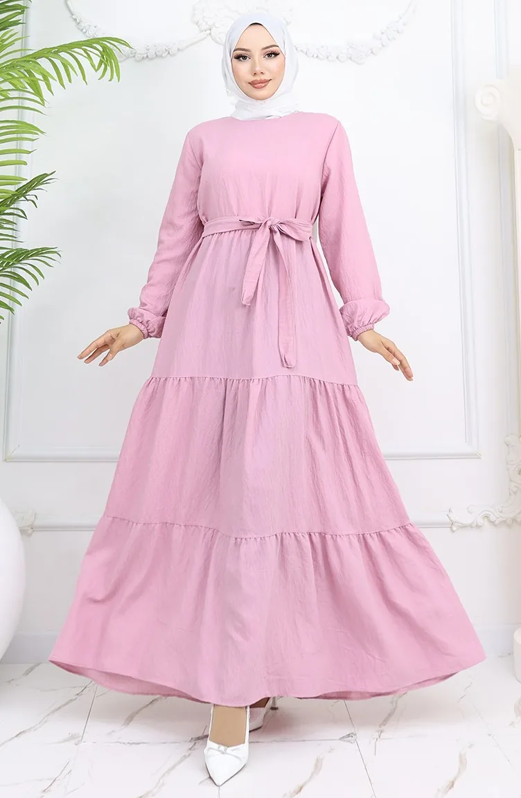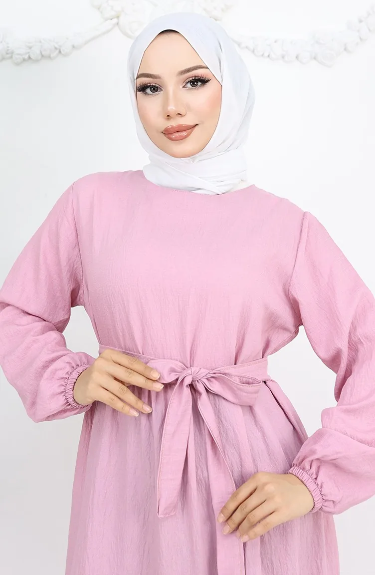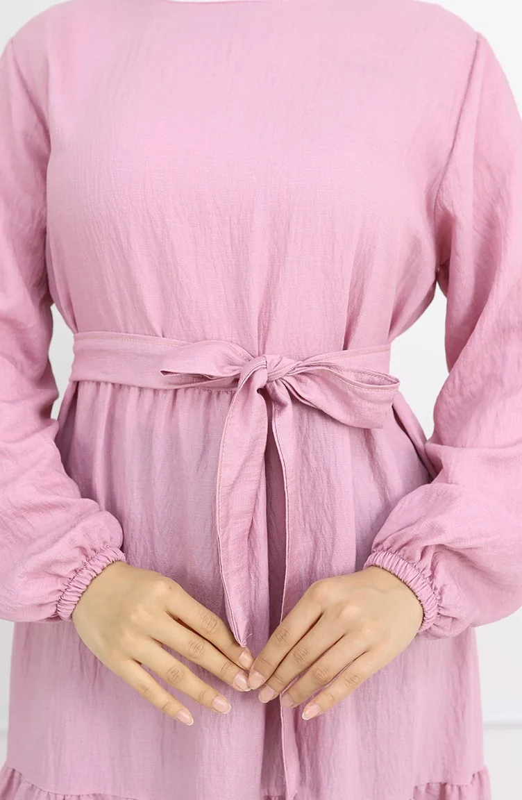 فستان صوفيا الكتاني بأكمام مرنة وحزام 2023-02 بودرة 2023-02