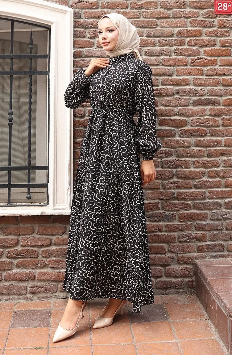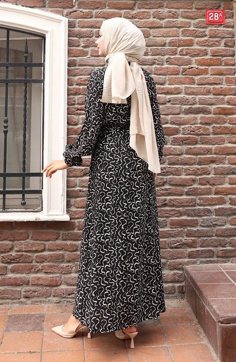فستان منقوش بخصر مربوط 2079-01 أسود كريمي 2079-01