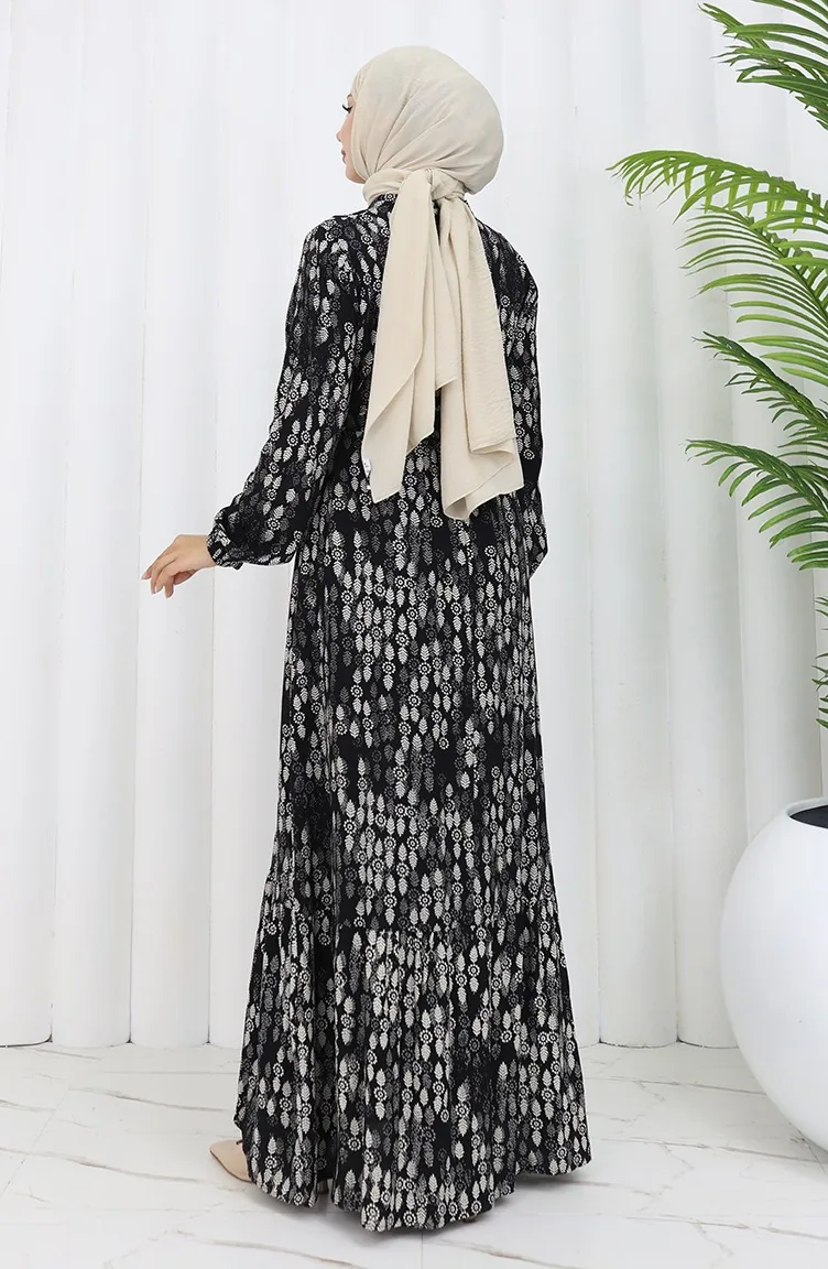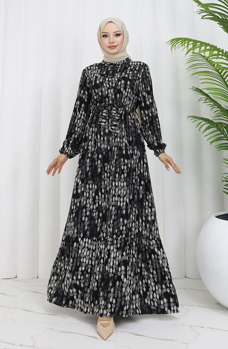 استخدم فيه اللون الأسود. فسكوزي نوع من النسيج الصناعي ومريحة للاستخدام. صمم مع القماش المزخرف. استعملت الأزرار ليجعل المنتج سهولة الارتداء. استخدم الكم البيلاستيك. استعمل فيها الياقة الدائرية. مناسب لجميع المواسم. هناك مقاسات كبيرة.