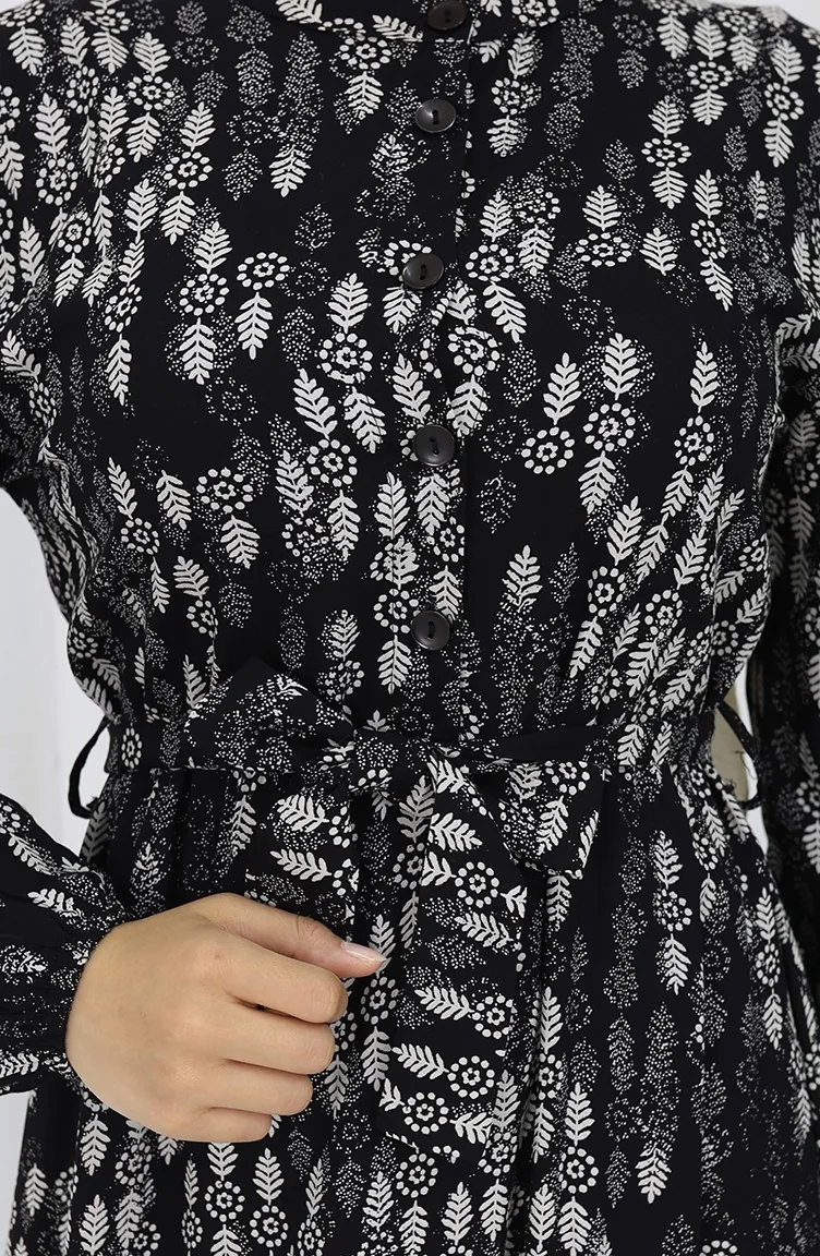 فستان من قماش الفيسكوز بأزرار وحزام 4075-05 أسود وأبيض 4075-05
