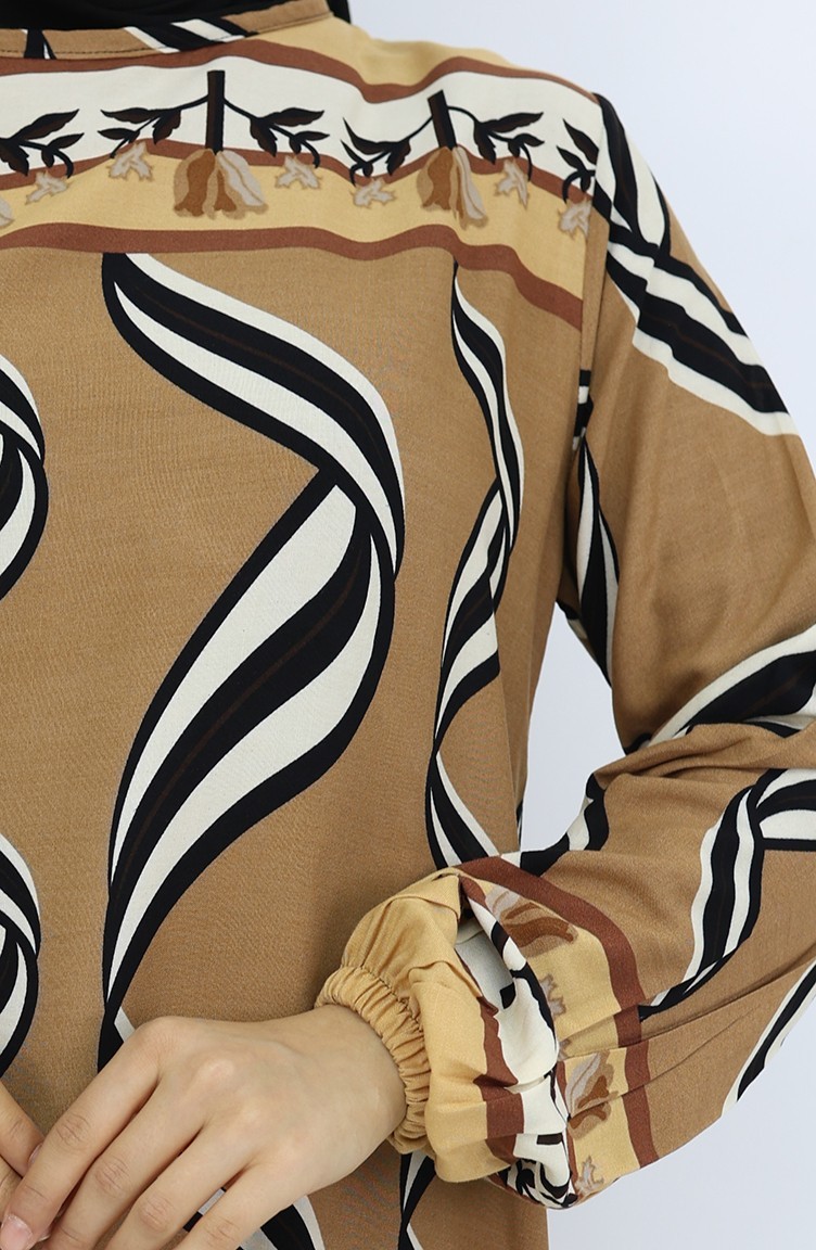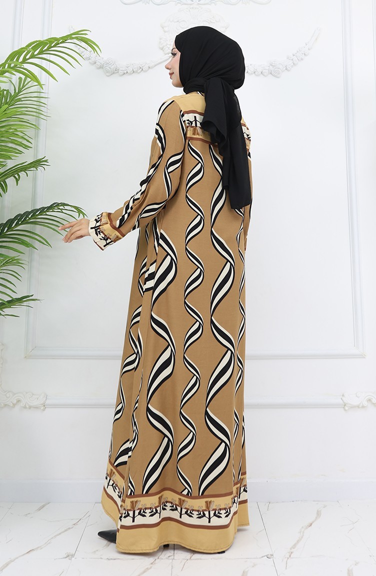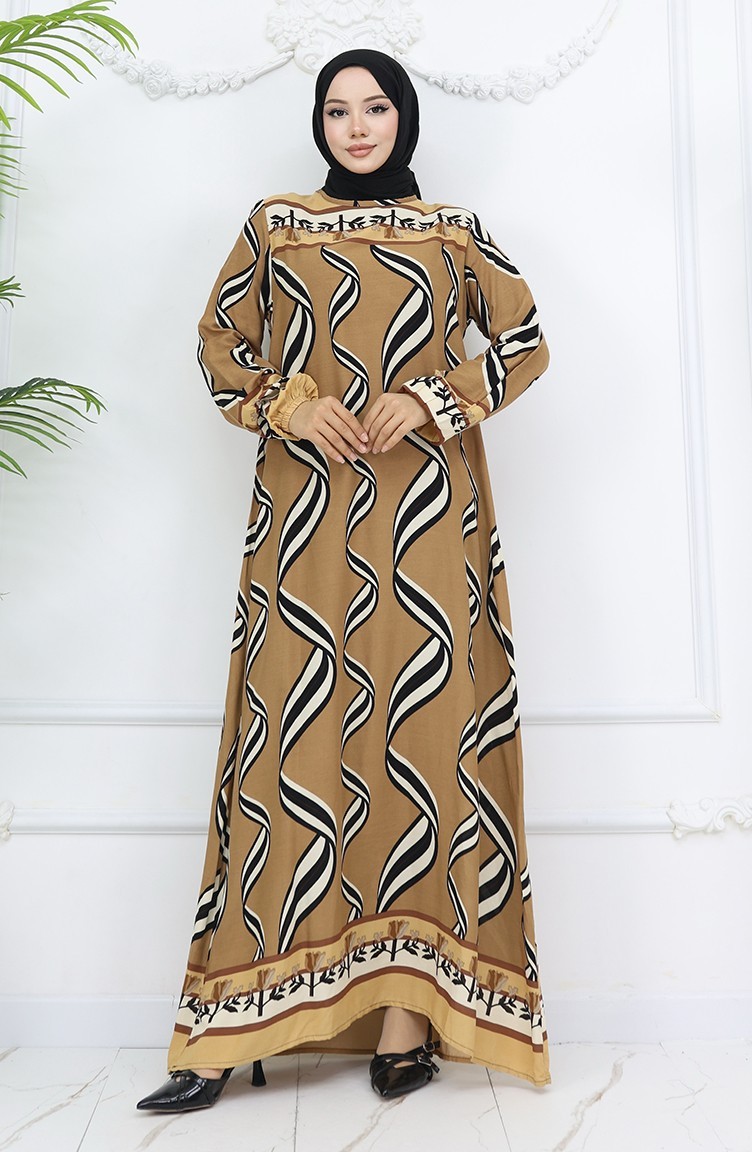 فستان بأكمام مرنة من قماش الفيسكوز 0031-02 بلون القهوة والحليب 0031-02
