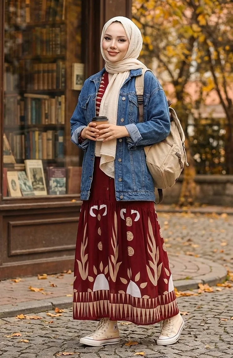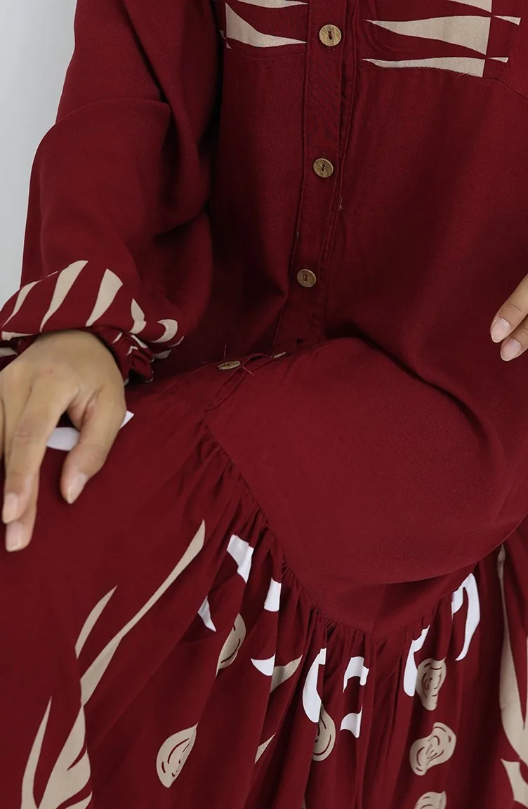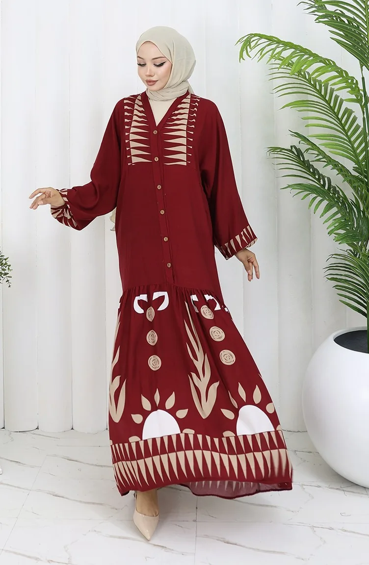 فستان من قماش الفيسكوز بأزرار نصفية 0075-04 أحمر كلاريت 0075-04