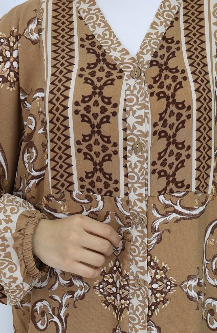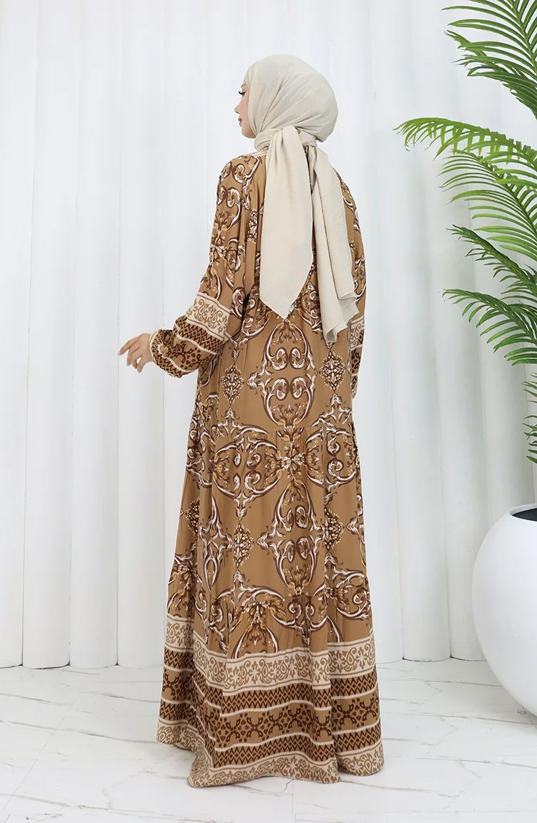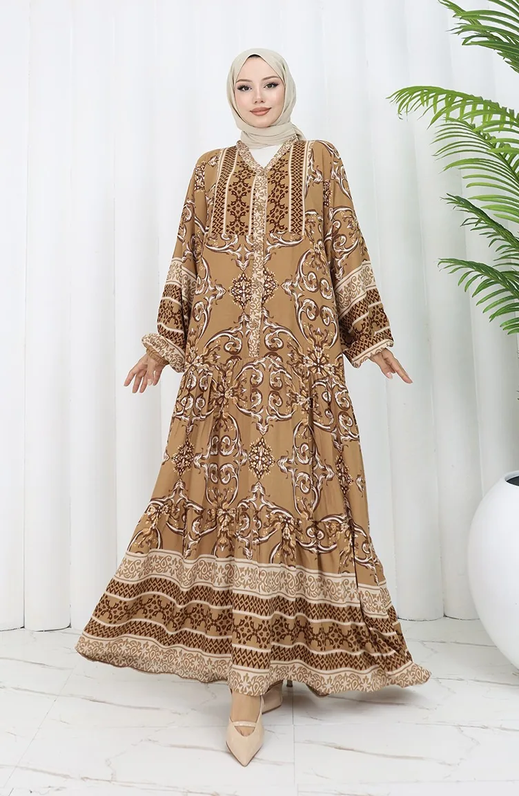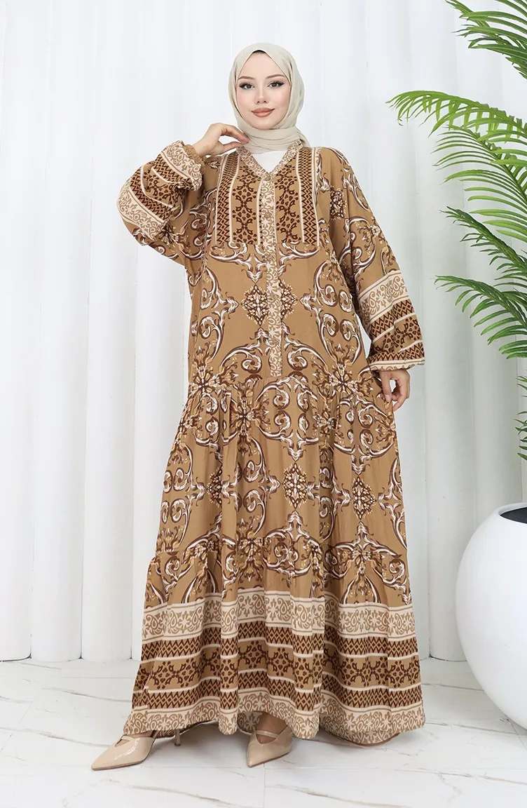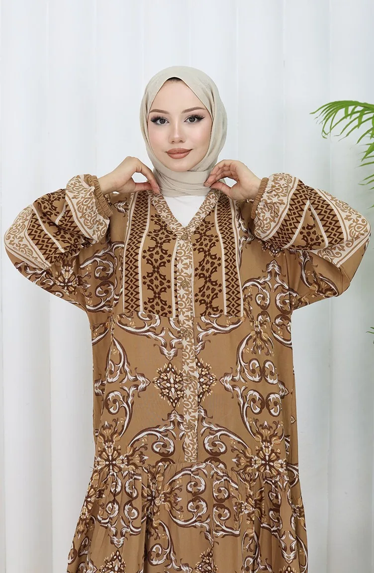 فستان منقوش بأزرار نصفية من قماش الفيسكوز 0052-02 بني 0052-02