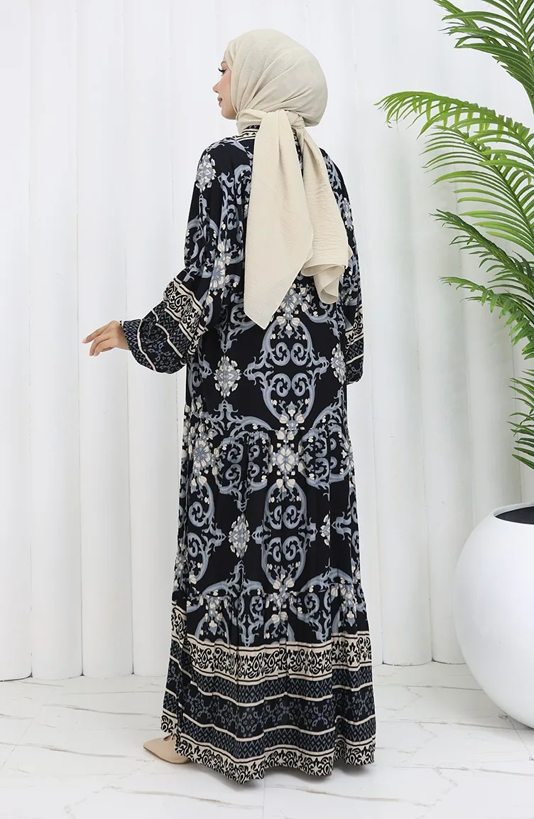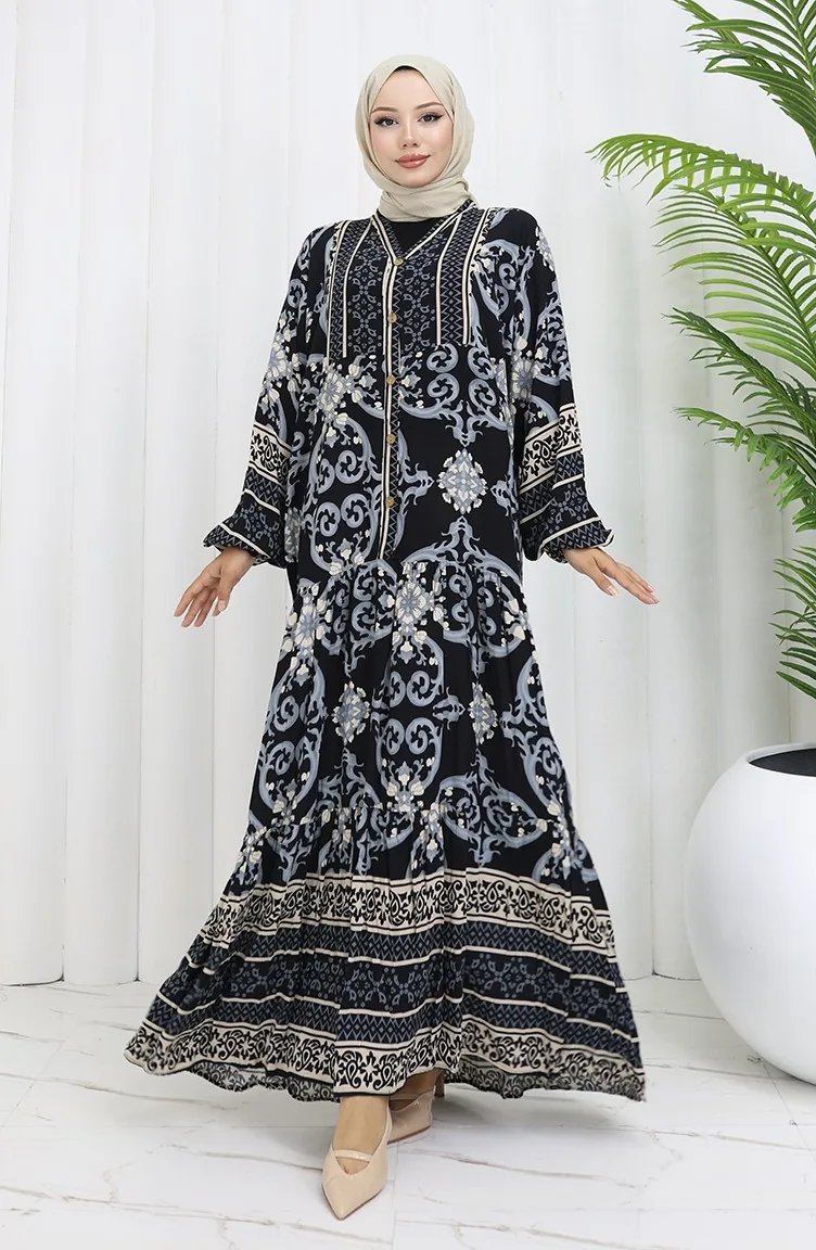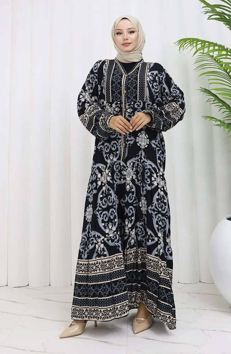 فستان منقوش بنصف أزرار من قماش الفيسكوز 0052-03 أسود 0052-03