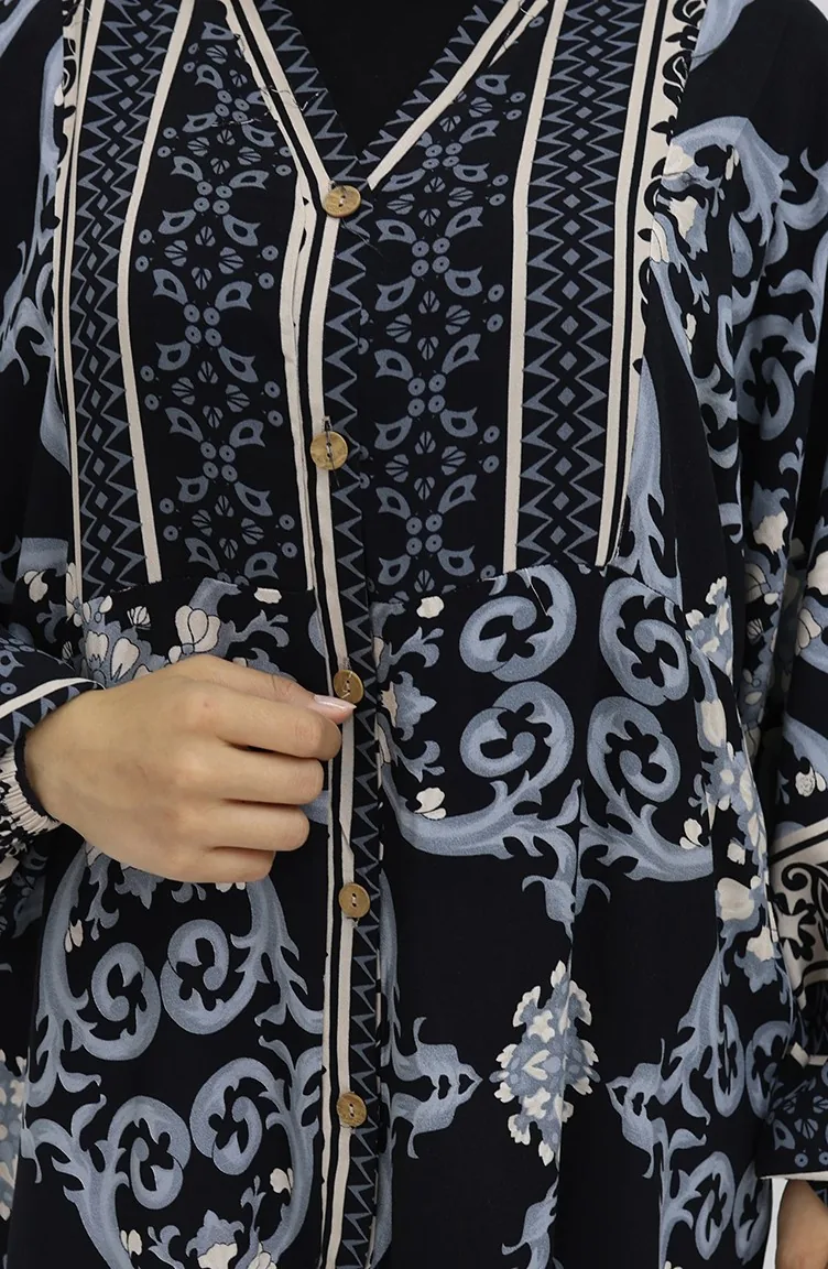 استخدم فيه اللون الأسود. فسكوزي نوع من النسيج الصناعي ومريحة للاستخدام. صمم مع القماش المزخرف. استعملت الأزرار ليجعل المنتج سهولة الارتداء. استخدم الكم البيلاستيك. ياقة شكل سبعة جعل المنتج أكثر اناقة. مناسب لجميع المواسم. هناك مقاسات كبيرة.