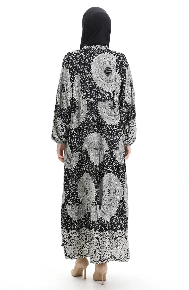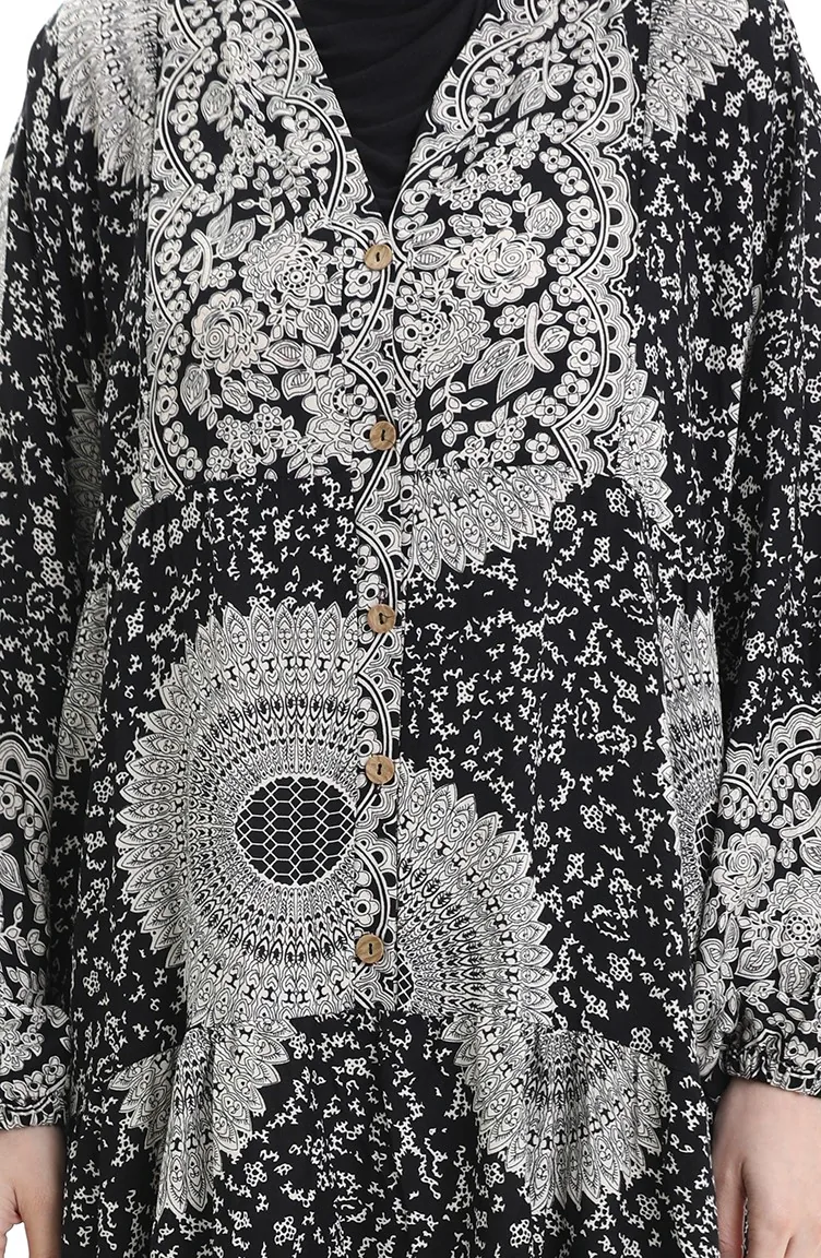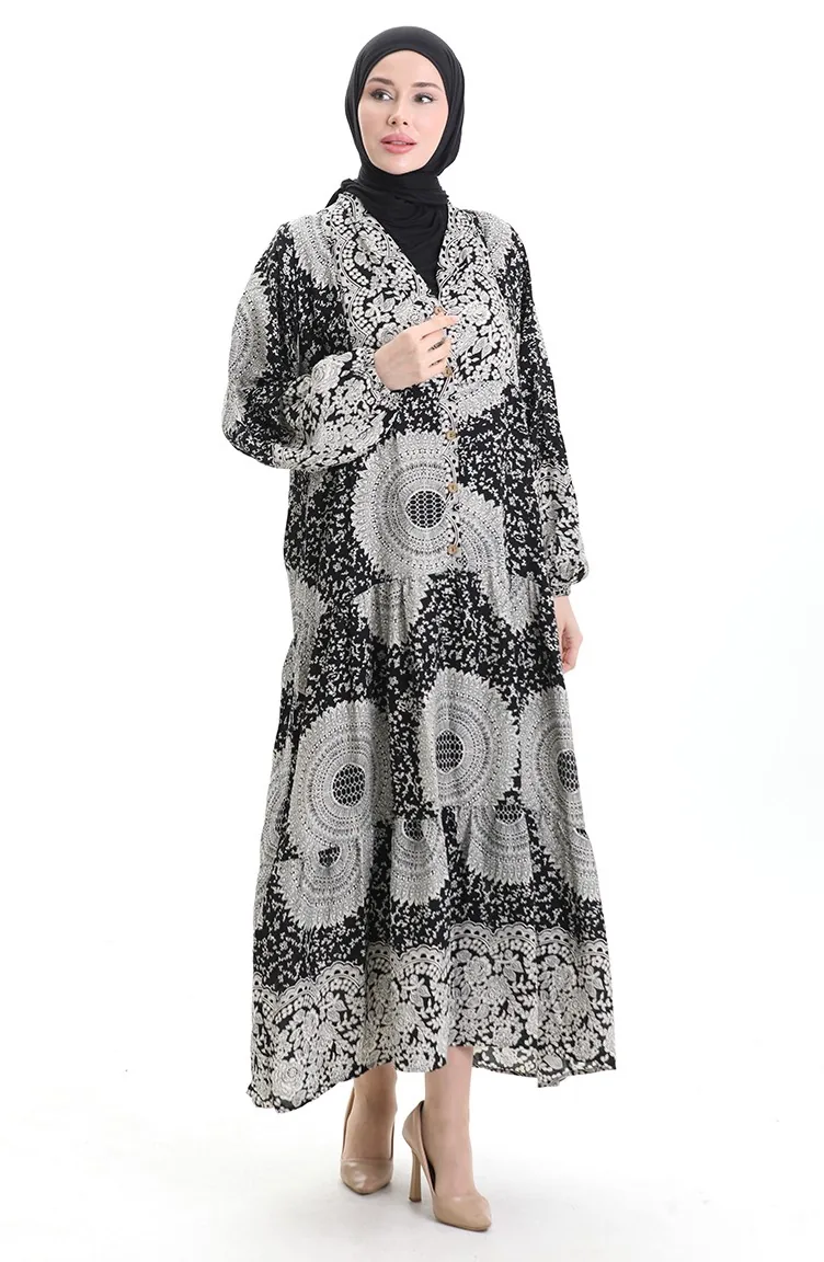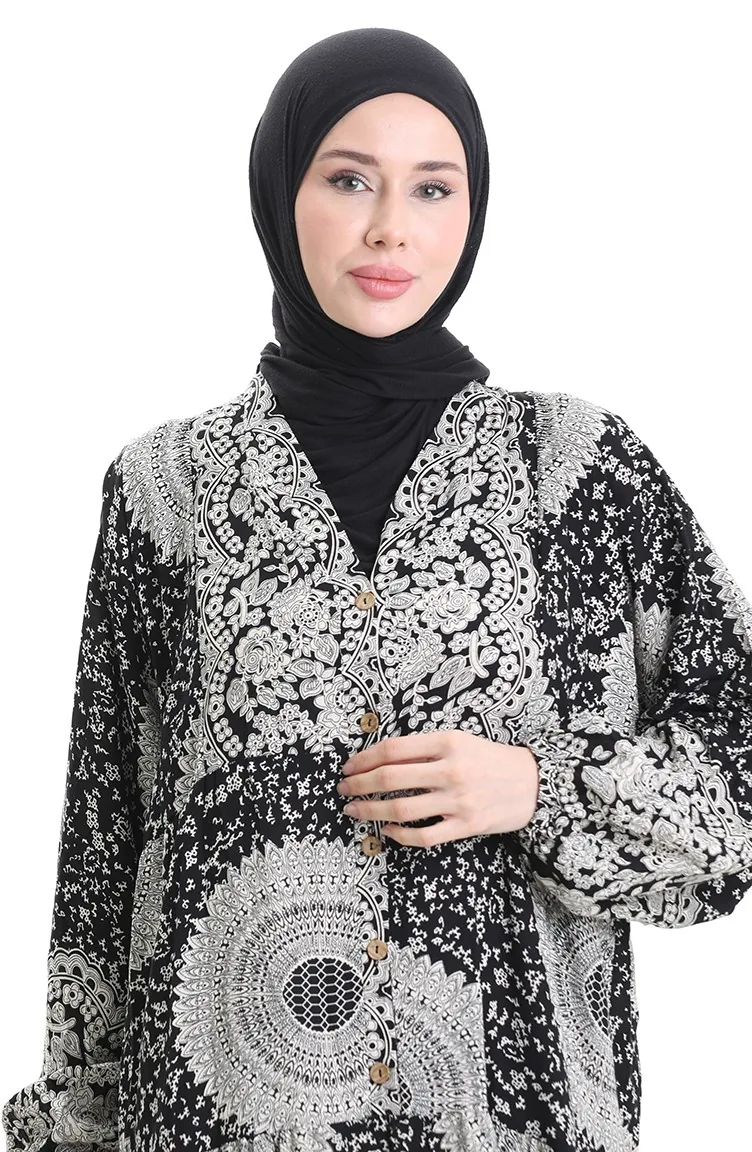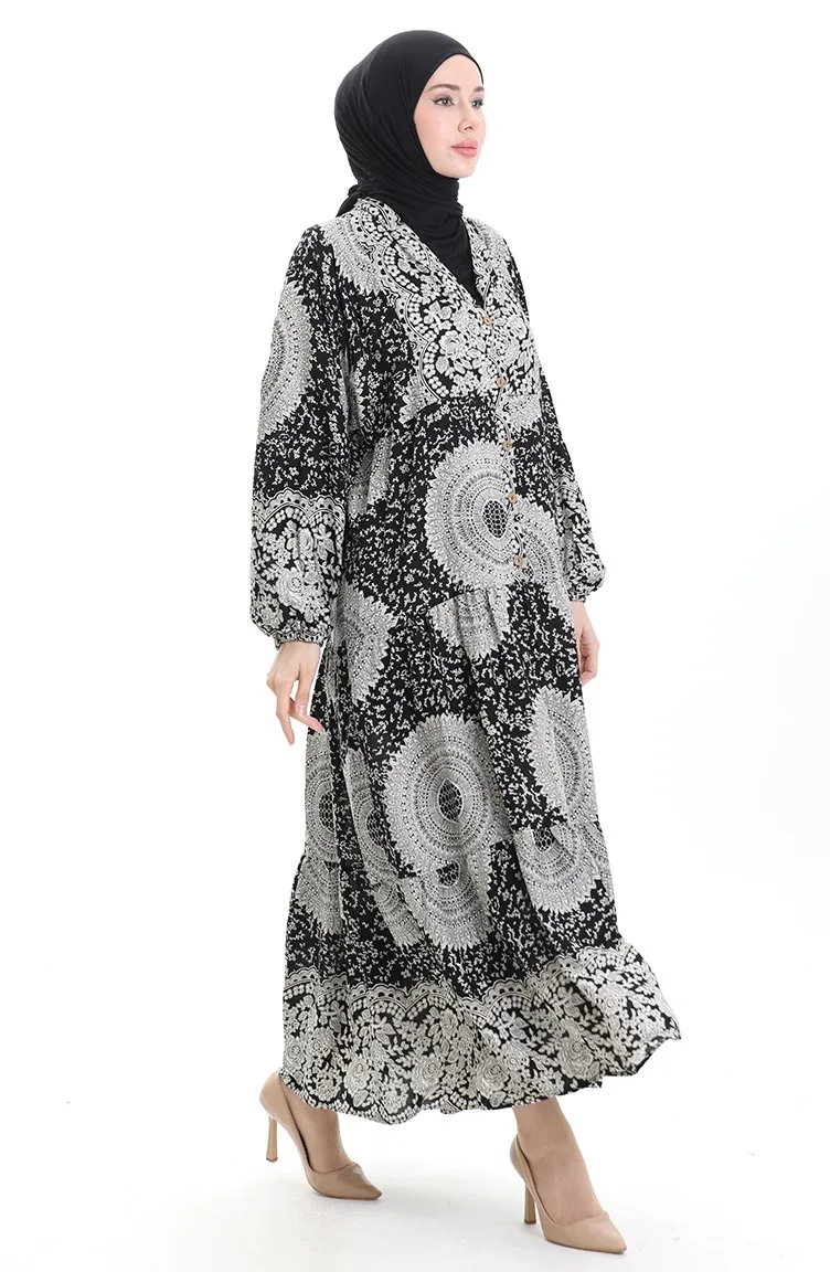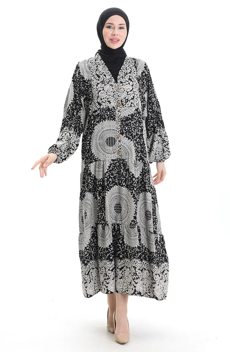 فستان منقوش بأزرار نصفية من قماش الفيسكوز 0061-01 أسود 0061-01