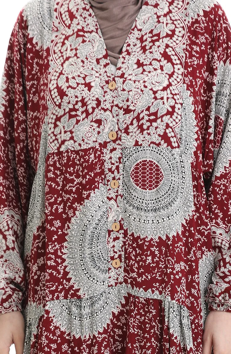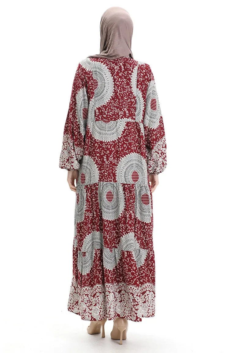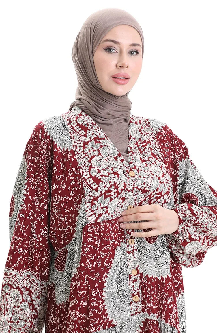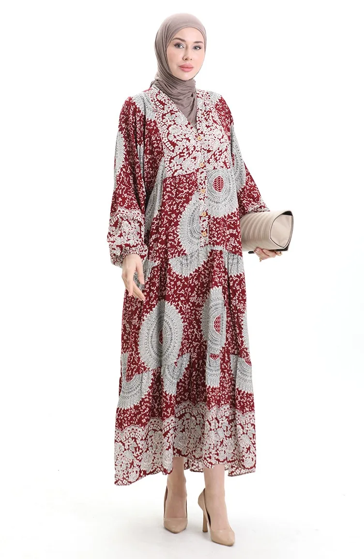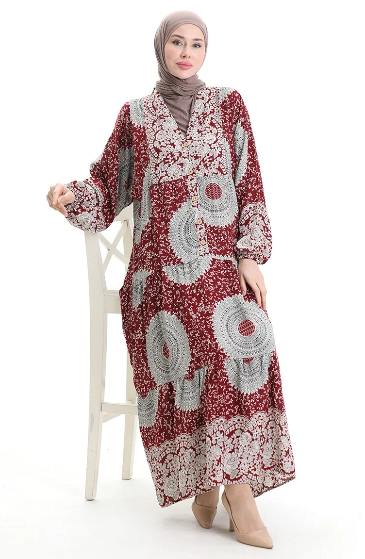 فستان منقوش بنصف أزرار من قماش الفيسكوز 0061-04 أحمر قرمزي 0061-04
