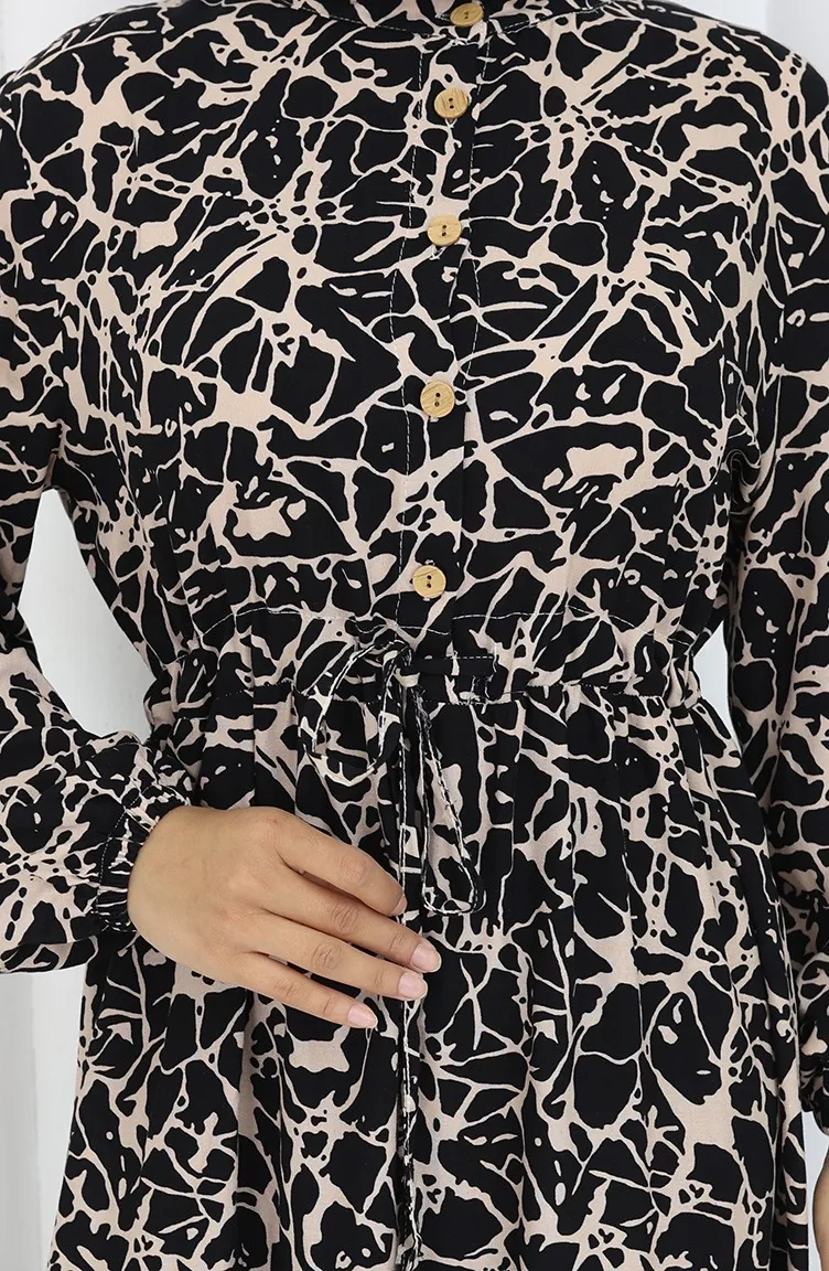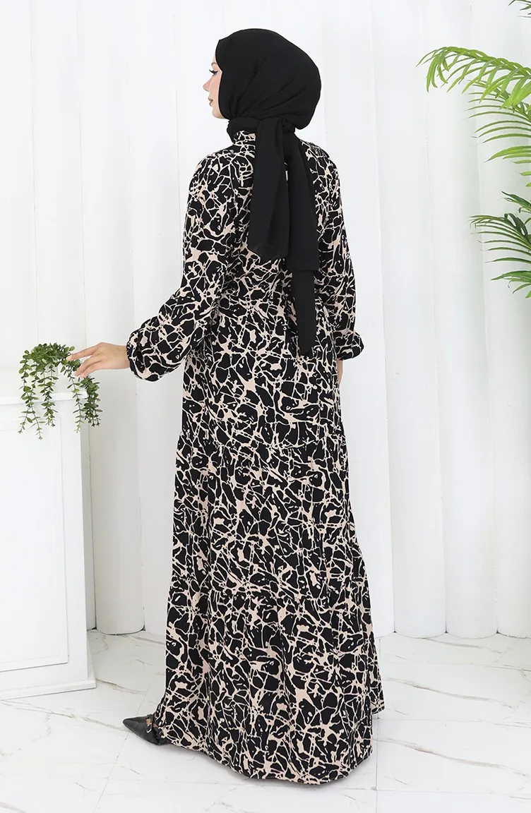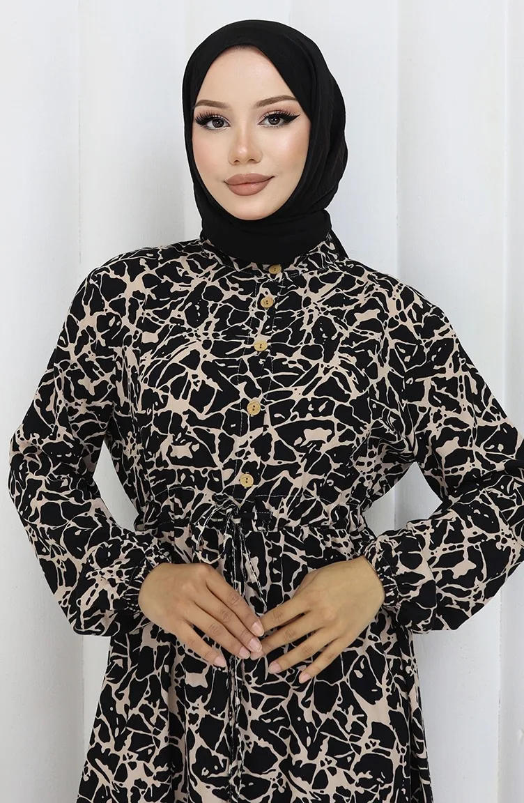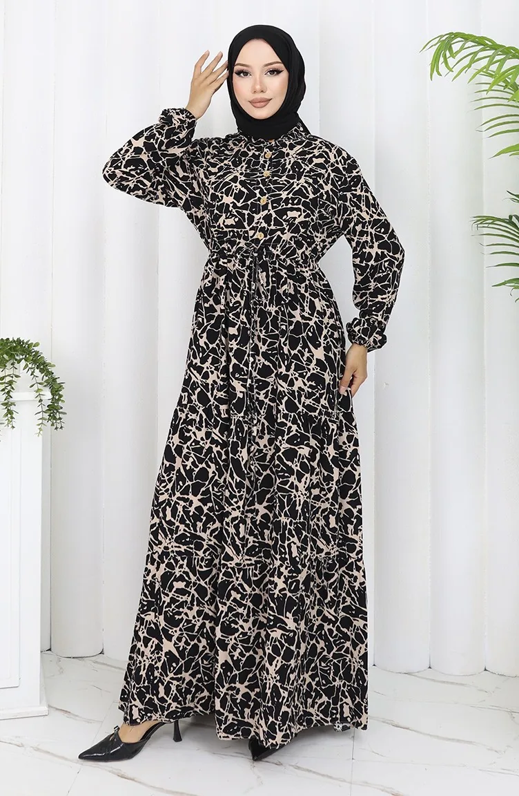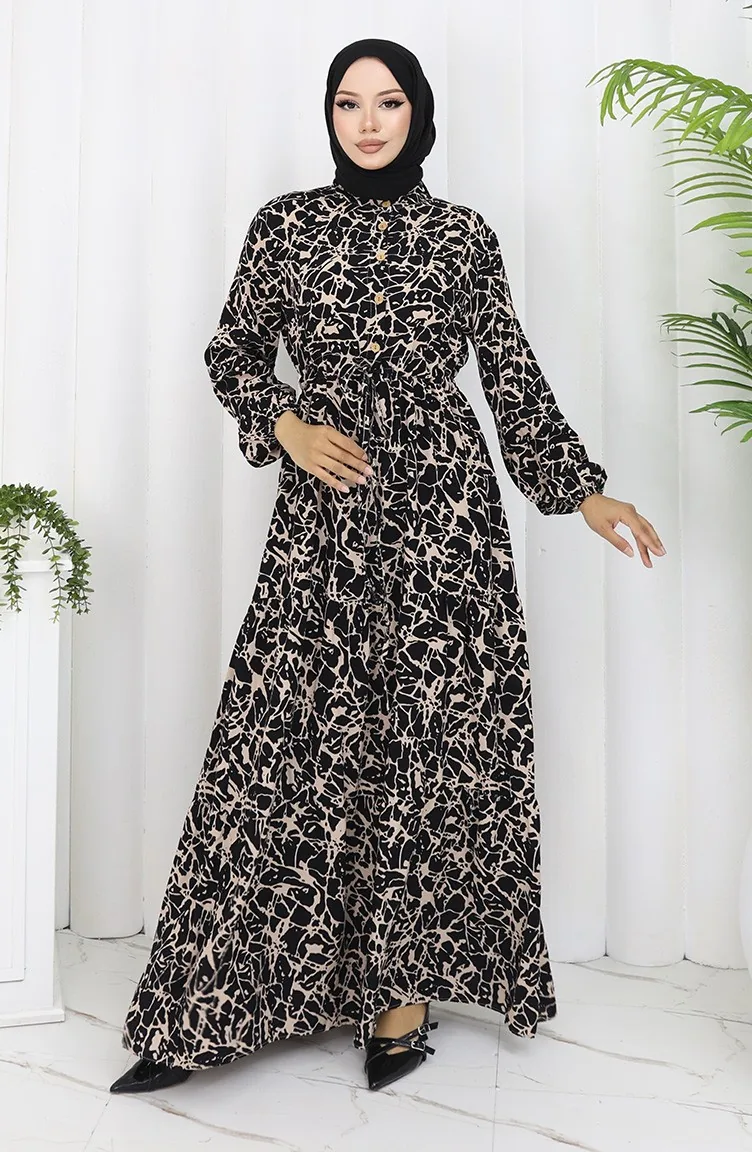 فستان منقوش بنصف أزرار من قماش الفيسكوز 0087-05 لون أسود حليبي قهوة 0087-05