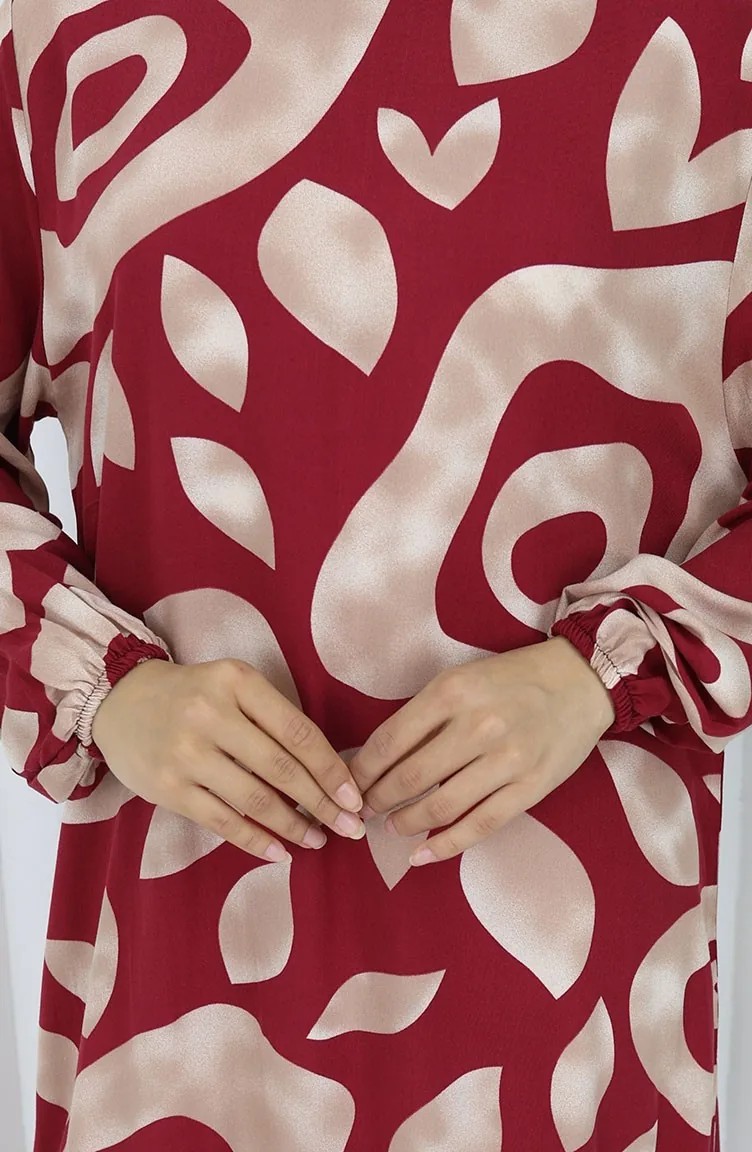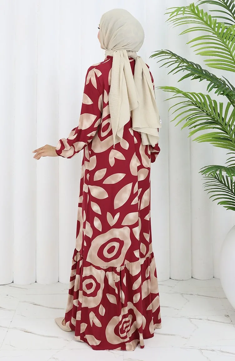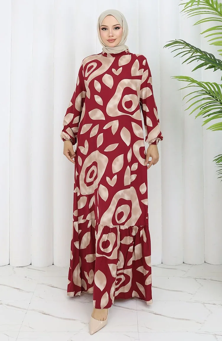 فستان منقوش من قماش الفيسكوز 2041-02 من المنك العنابي 2041-02
