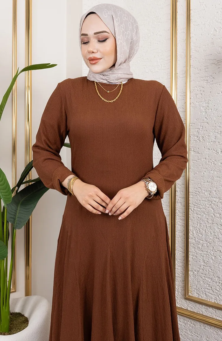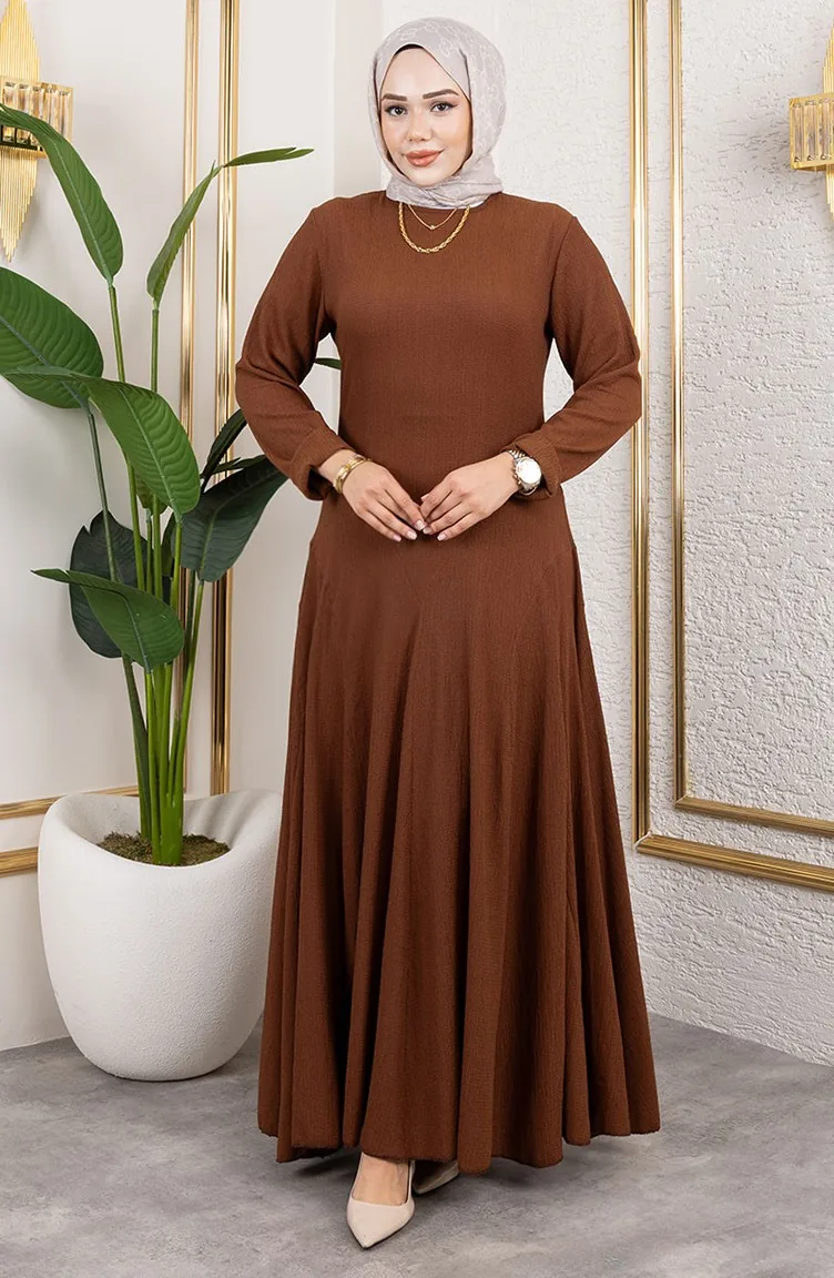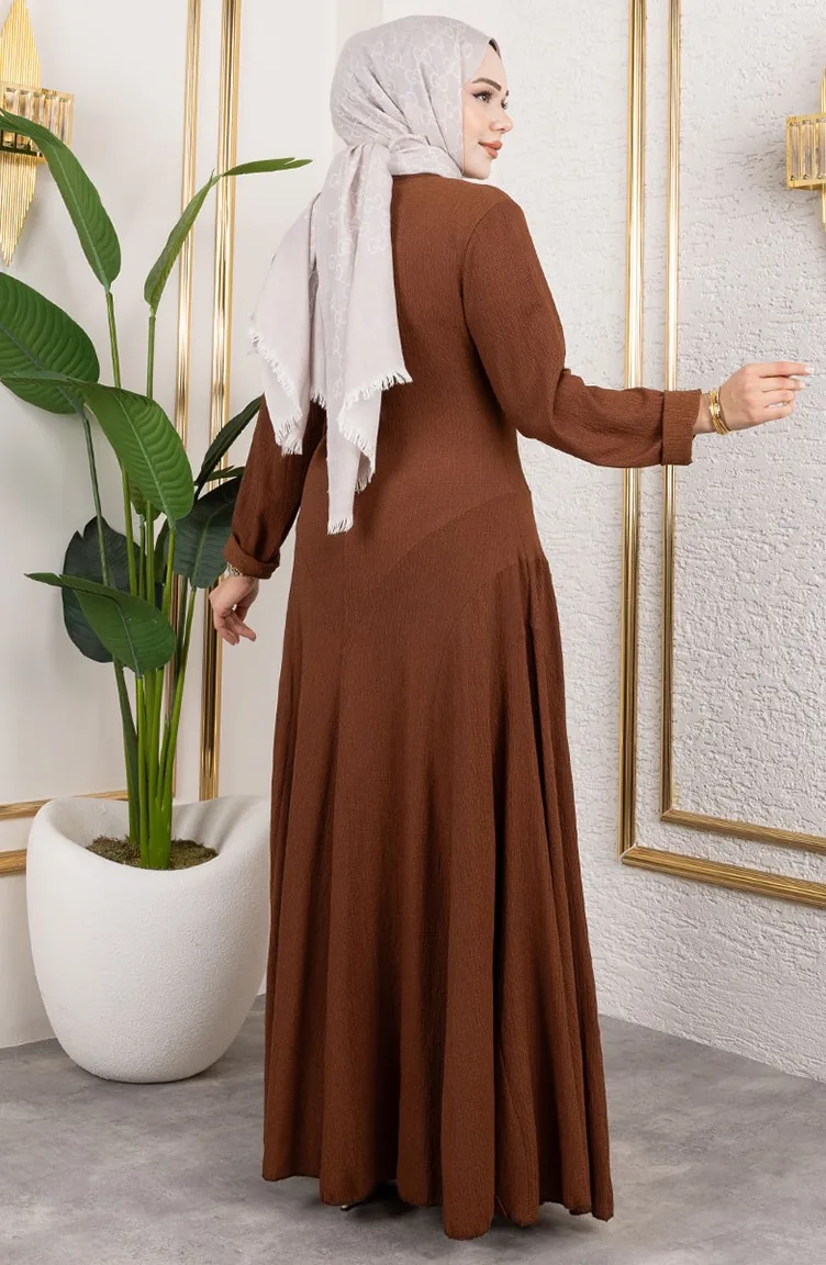 Volan Detaylı Bürümcük Elbise 7132-06 Kahverengi 7132-06