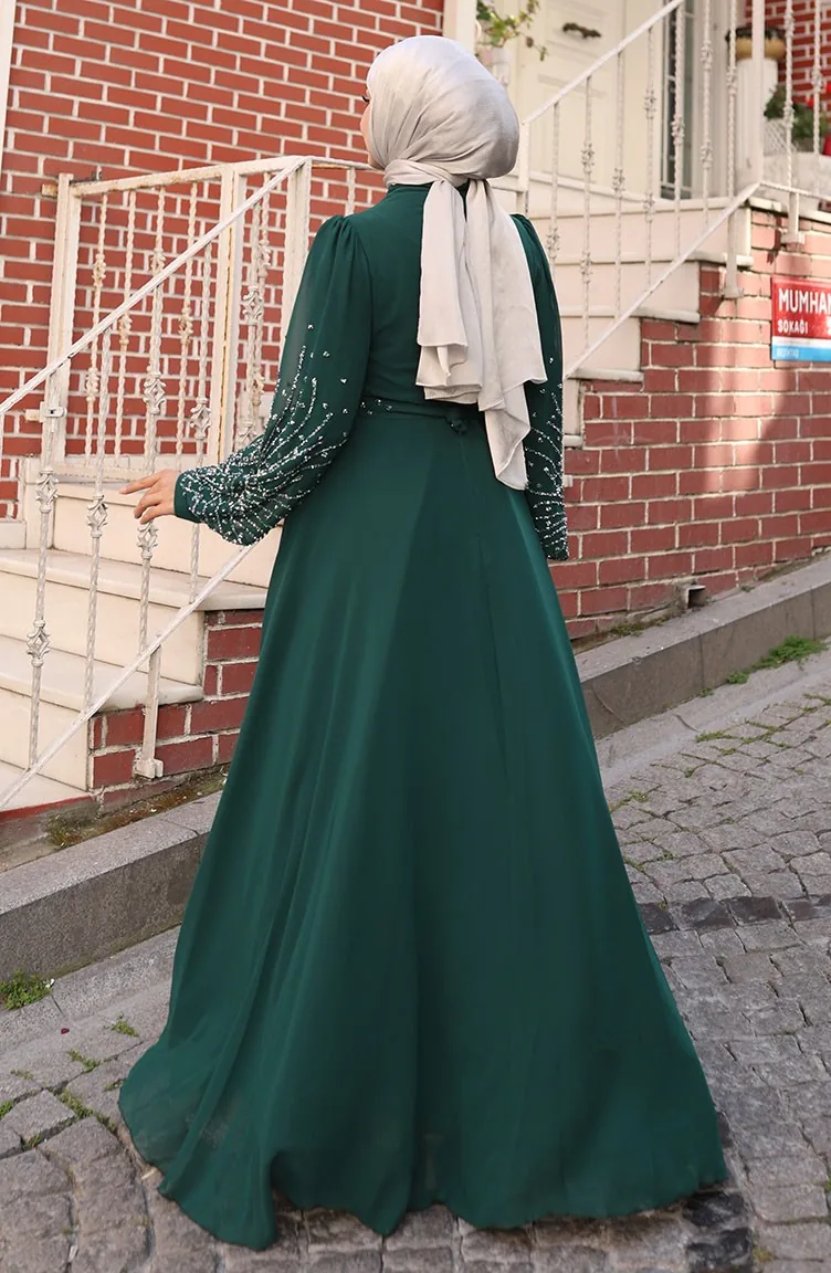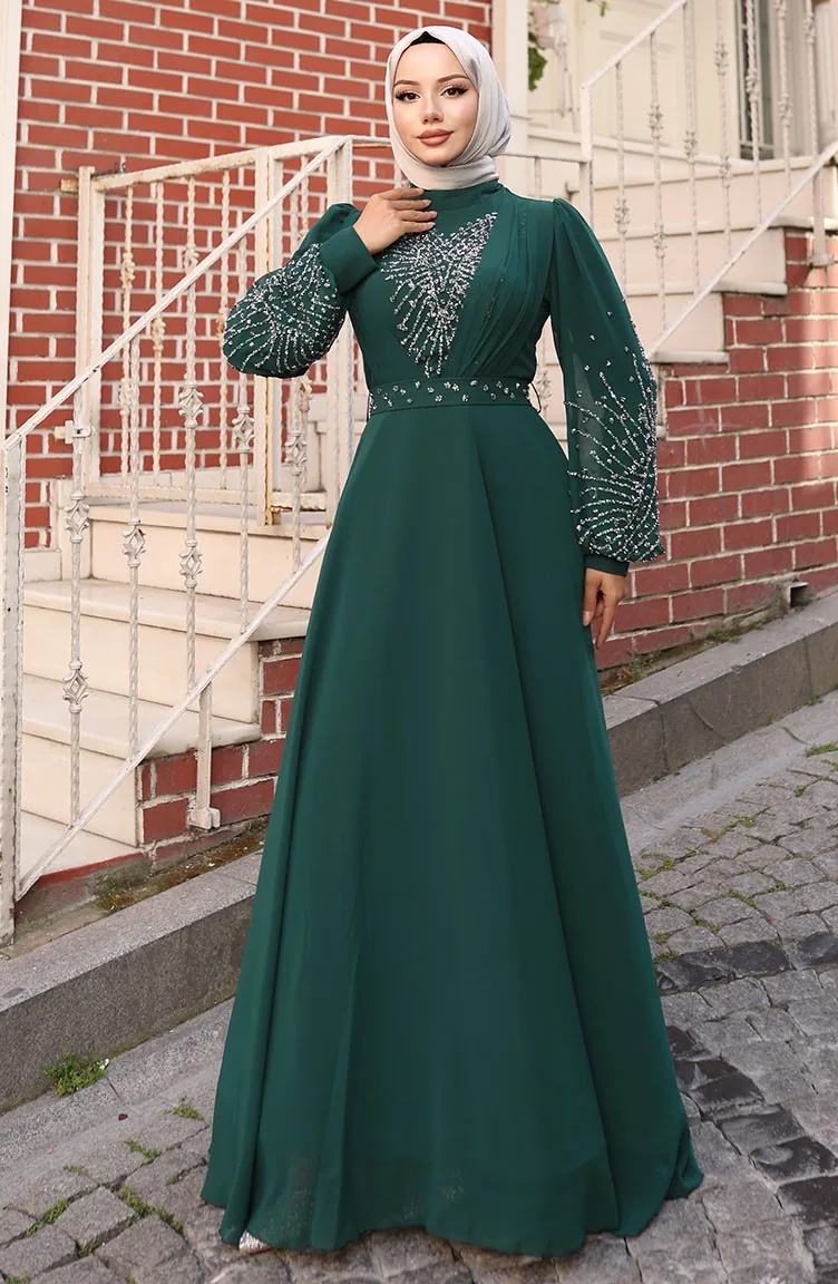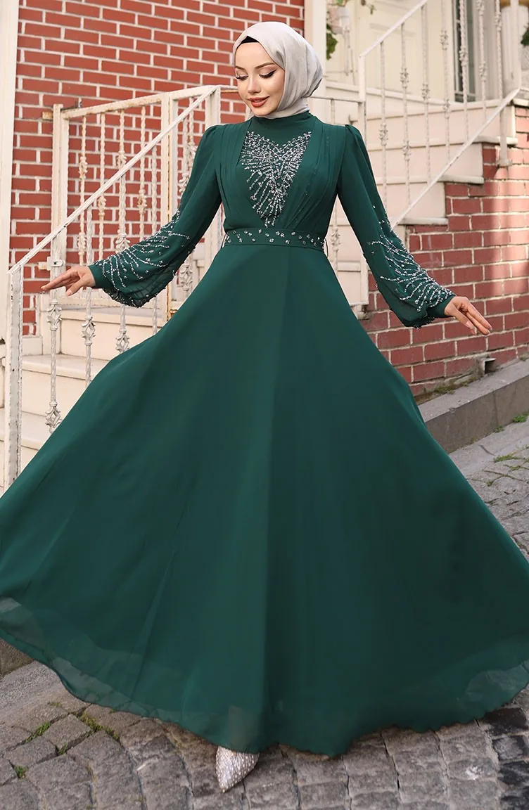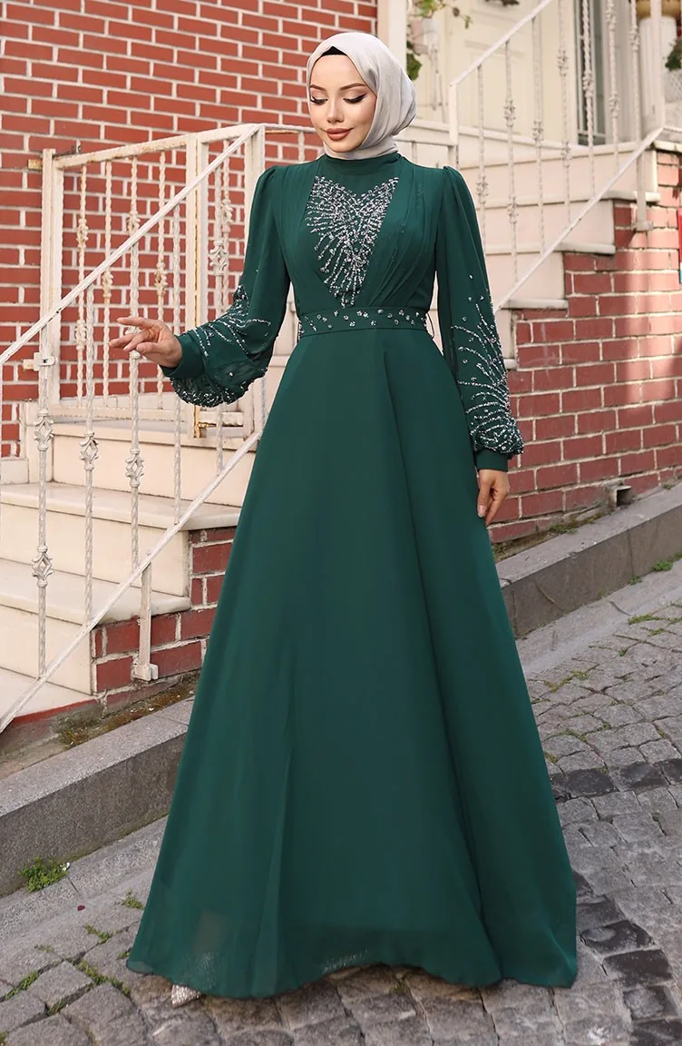 فستان سهرة شيفون حجري 6237-03 أخضر زمردي 6237-03