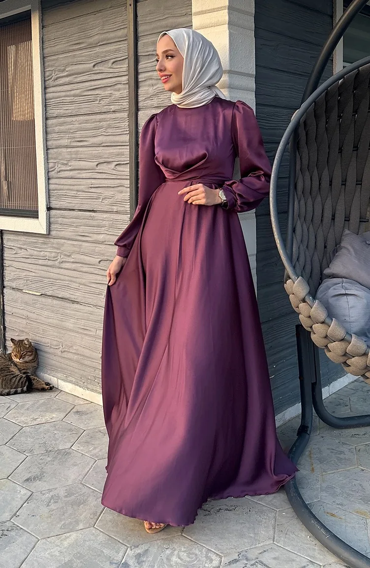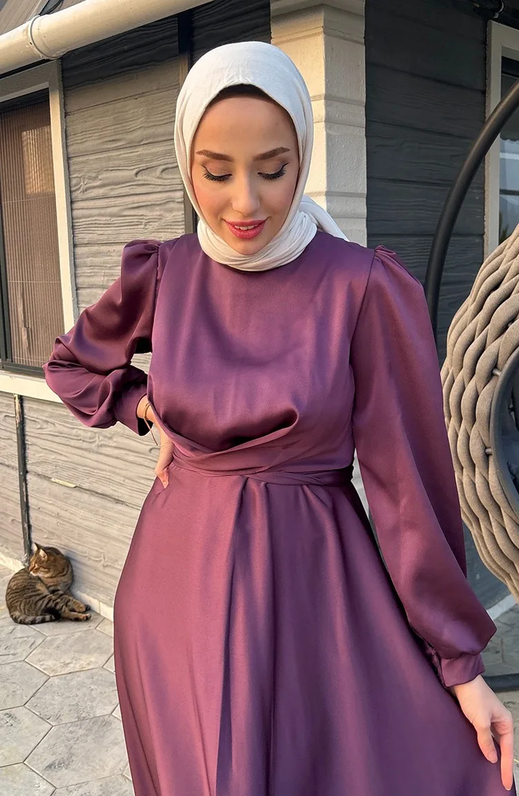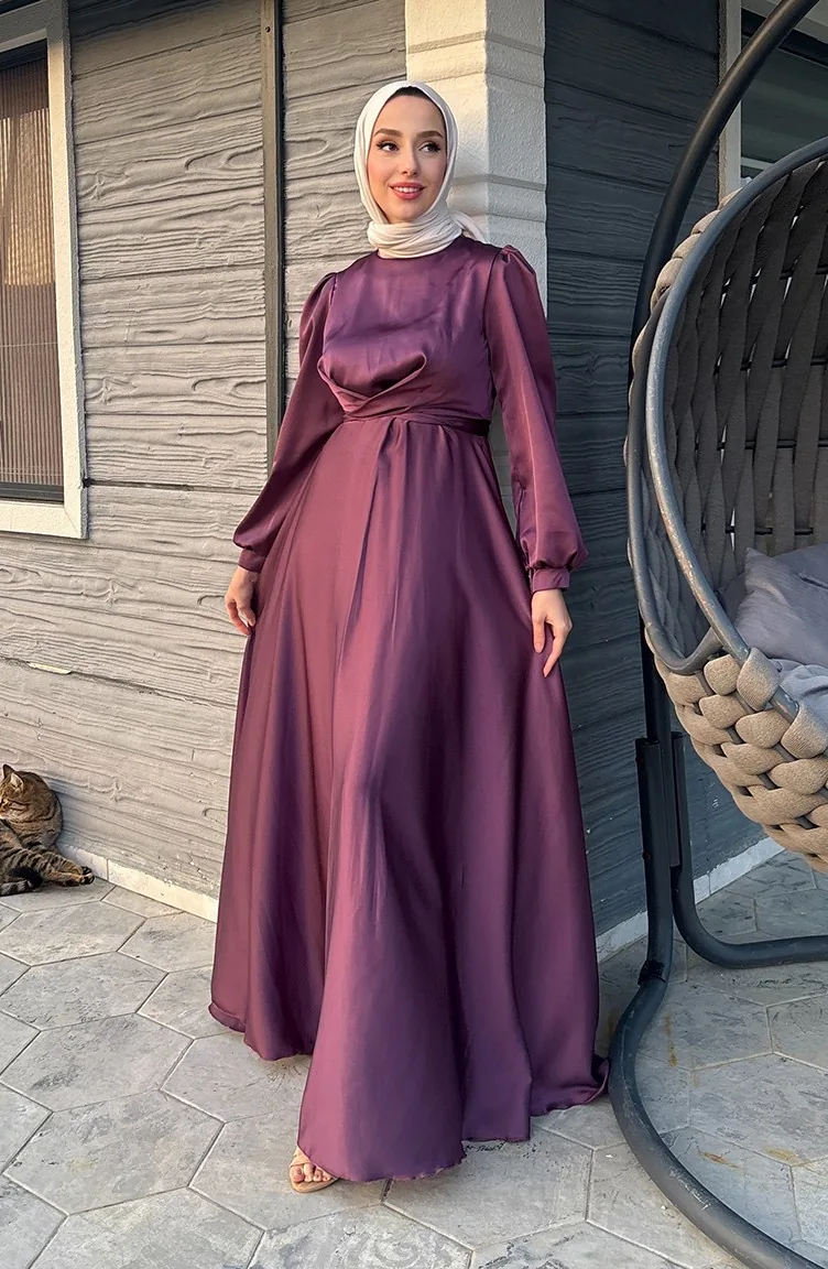 فستان سهرة ستان بتصميم رابطة أمامية 5513-04 لون خمري 5513-04