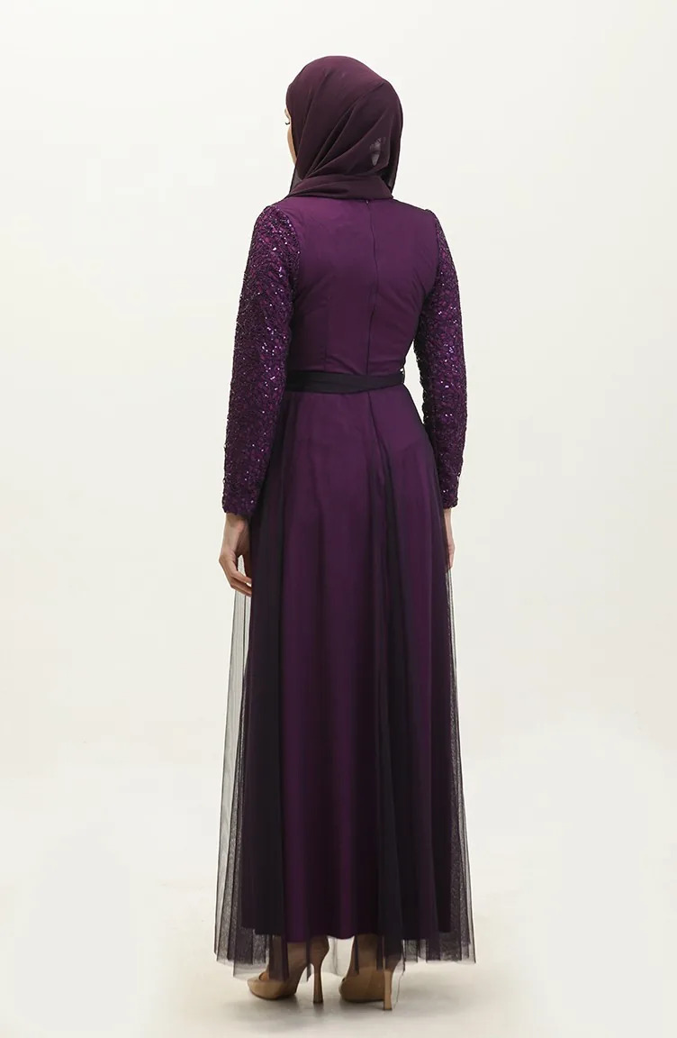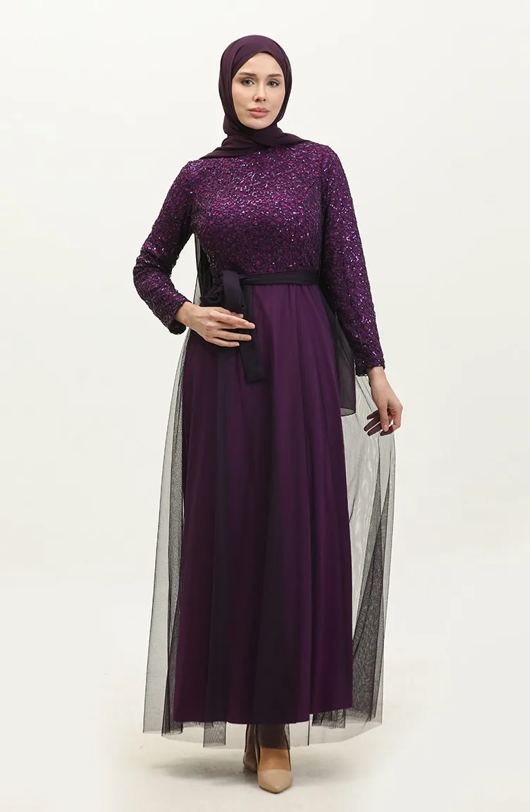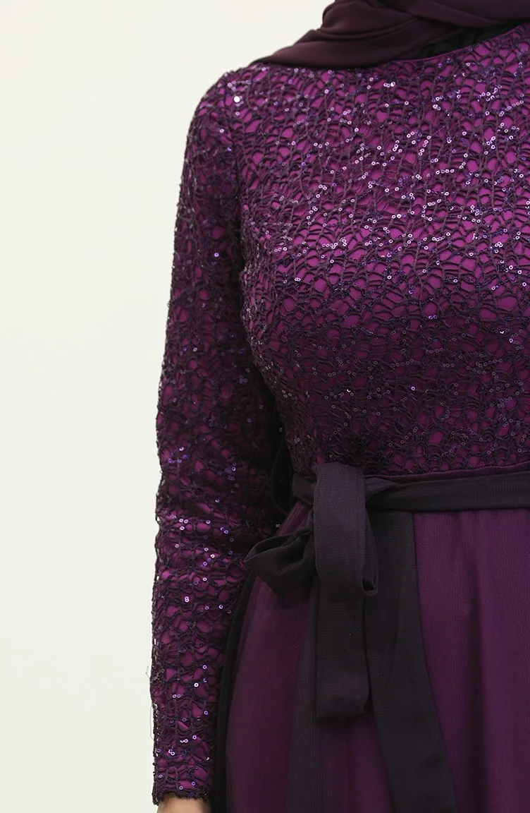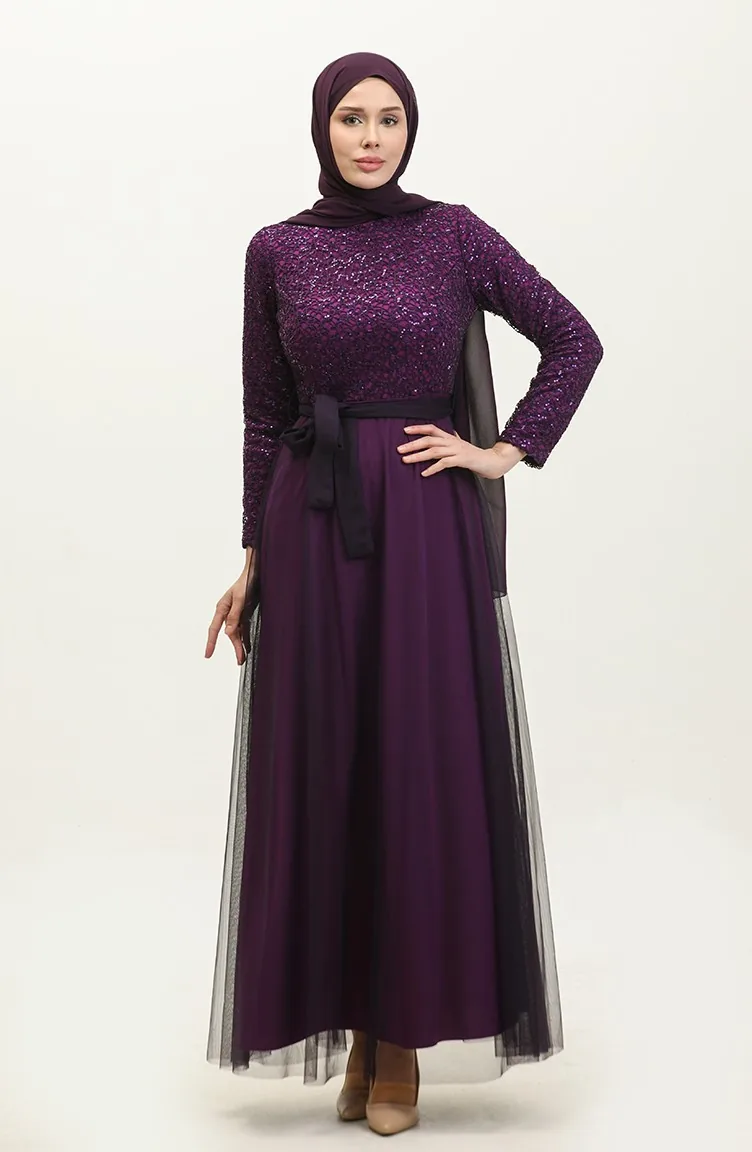 فستان سهرة دانتيل بحزام 5353A-08 بنفسجي 5353A-08