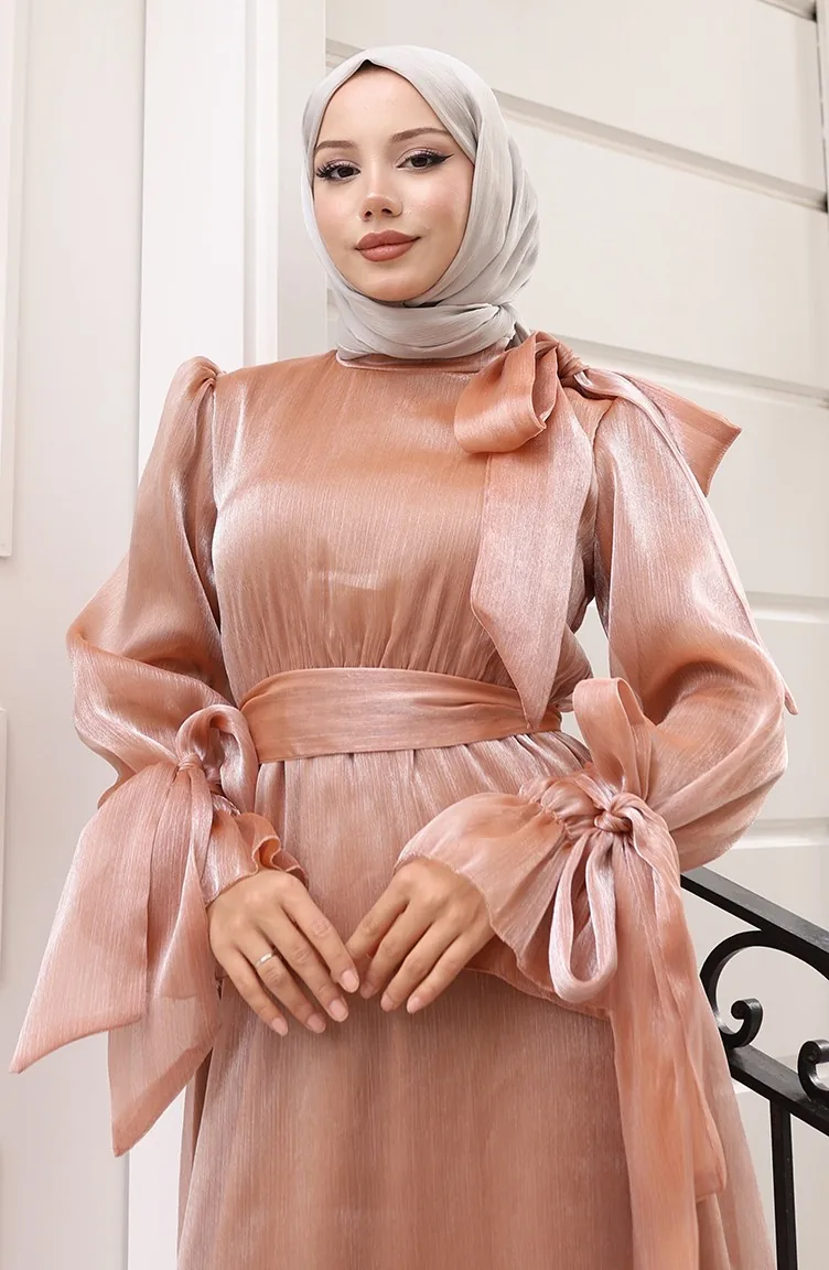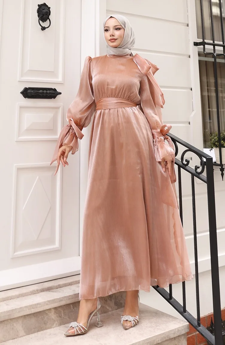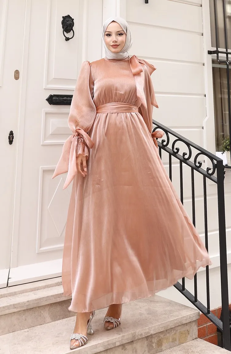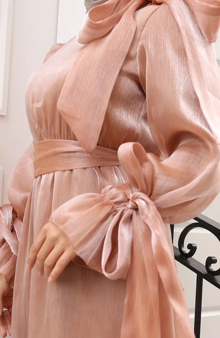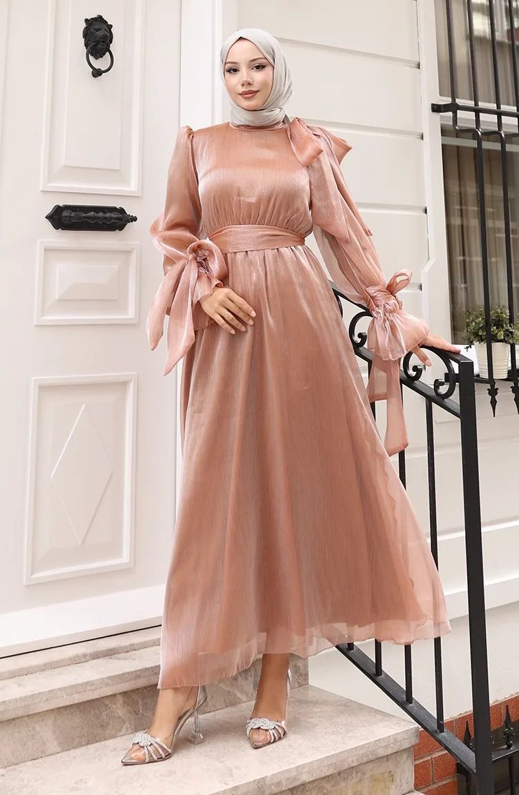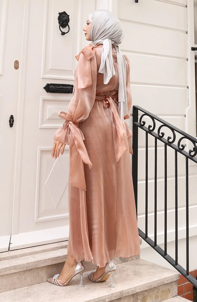فستان سهرة من قماش التول الأورجانزا مع حزام خصر مطوي 5611-03 بلون القهوة الحليبية 5611-03