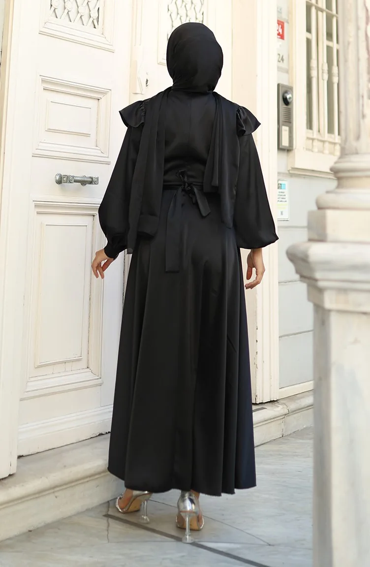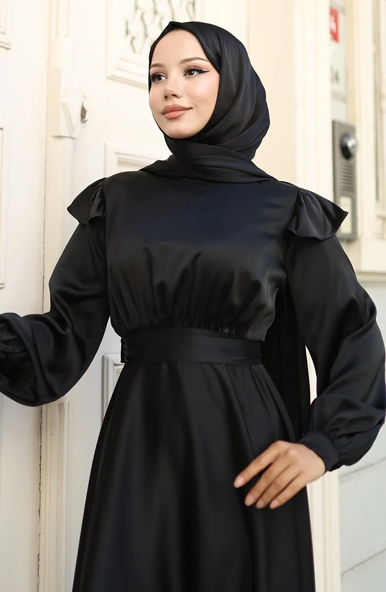فستان سهرة ساتان بأكتاف مكشكشة 5805-03 أسود 5805-03