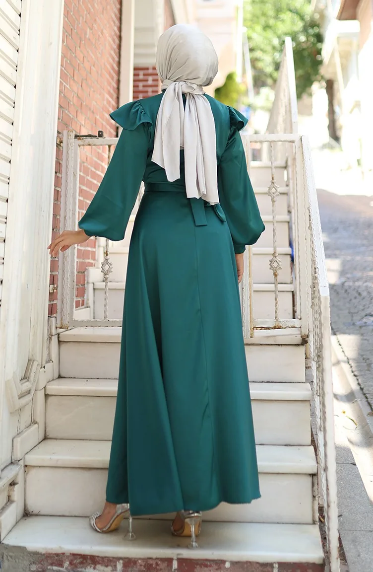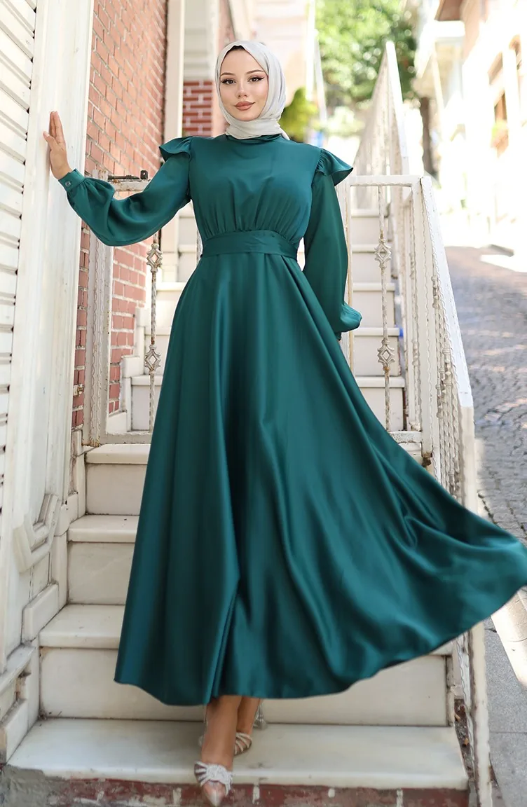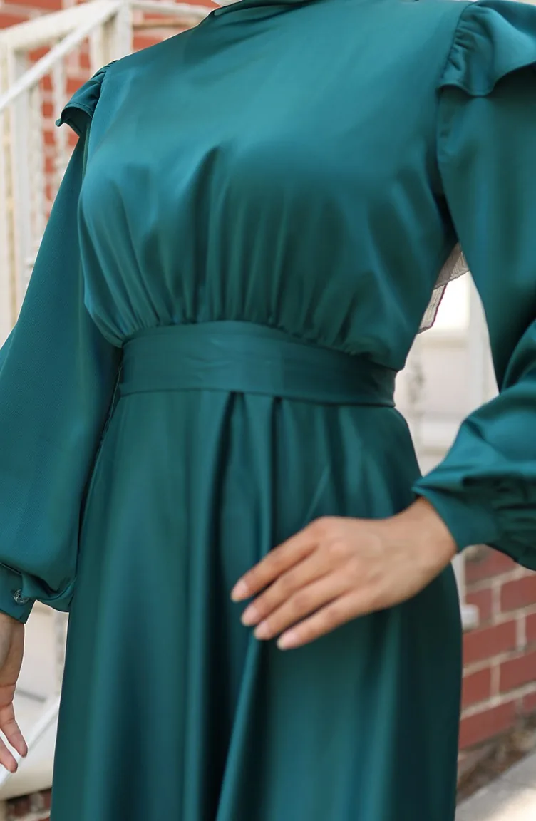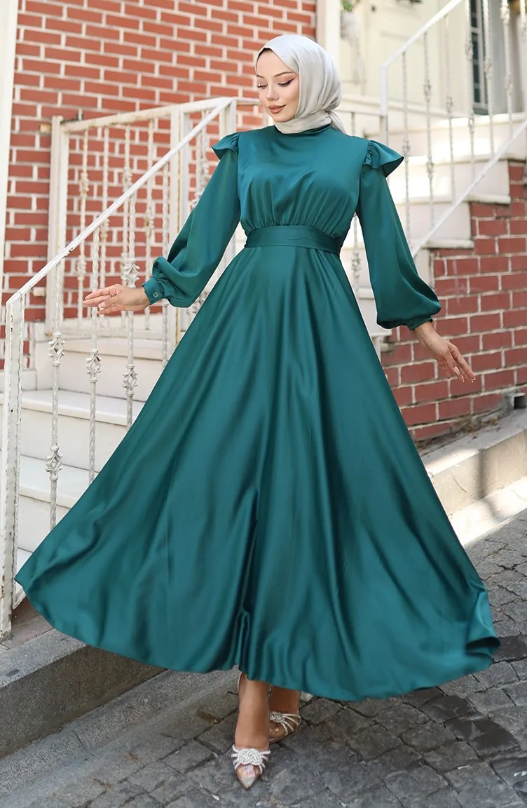 فستان سهرة ساتان بأكتاف مكشكشة 5805-05 أخضر زمردي 5805-05