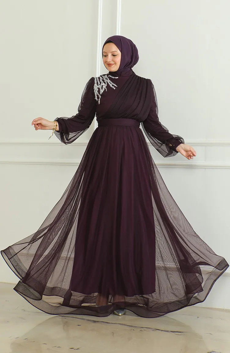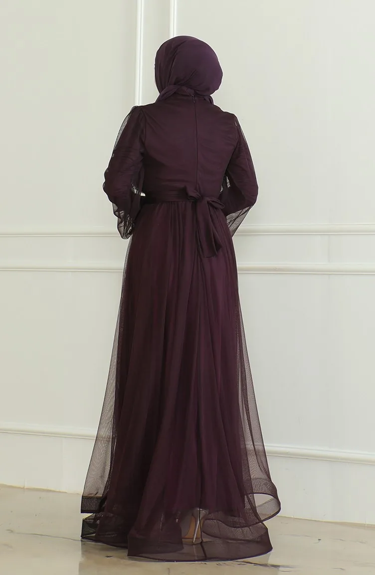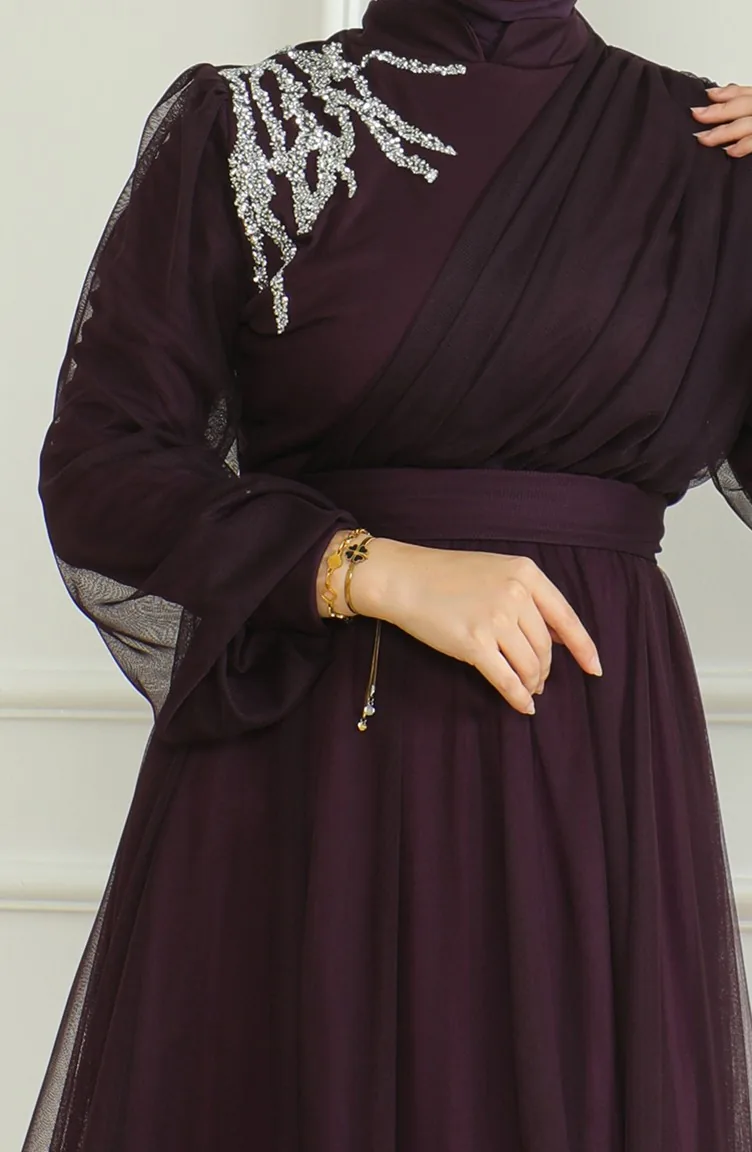 فستان سهرة شيفون بتفاصيل من الترتر 6348-06 لون بنفسجي 6348-06